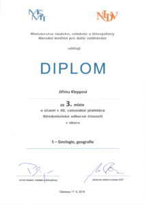 I v letošním ročníku Středoškolské odborné činnosti dosáhl náš student výborného umístění. Na celostátní soutěži v Olomouci obsadil ve svém oboru Geologie a geografie 3. místo. Blahopřejeme! Práce s nadanými žáky stojí za námahu a hlavně jim přinese zkušenosti pro další studium na vysoké škole. Jsem ráda, že i v příštím školním roce máme zájemce o tuto soutěž a budeme se těšit na další úspěchy.