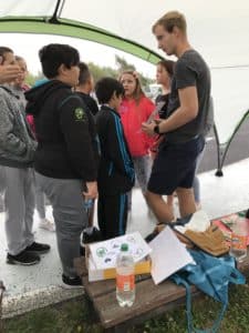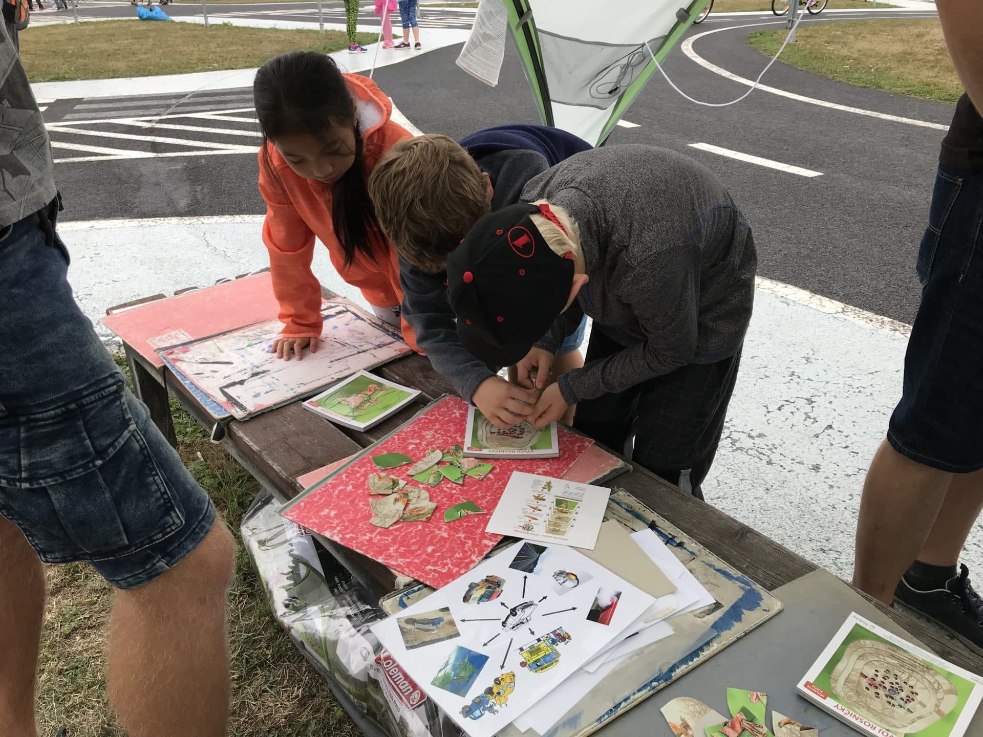 U našeho stánku si v doprovodu studentů 4.A Ondřeje Juhy, Michala Fejsáka, Štěpána a Jakuba Jančíka mohli žáci 1. stupně základních škol vyzkoušet spoustu zajímavých aktivit, které souvisejí nejen s problematikou dopravy. Bohužel dlouhé období bez deště bylo přerušeno právě v tento častými přeháňkami, které však práci našich šikovných maturantů nijak nerozladilo a s malými školáky si poradili.