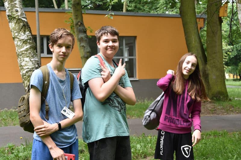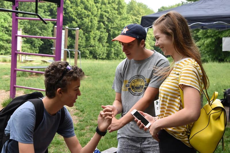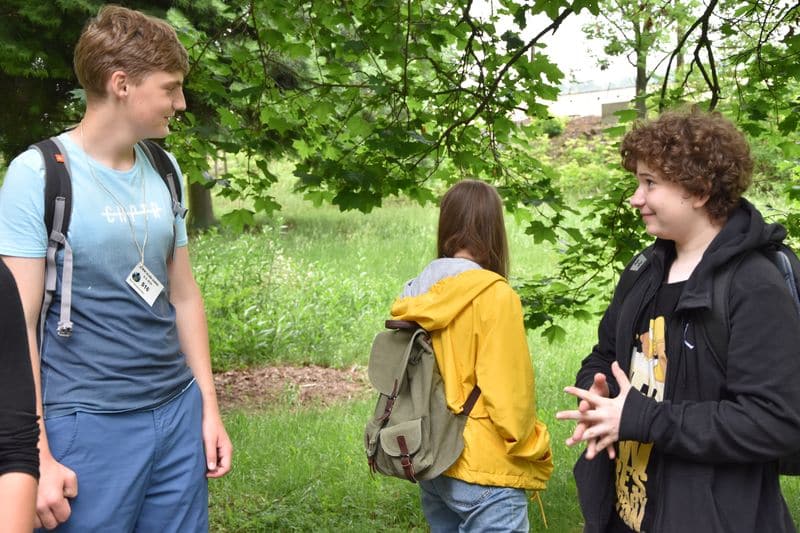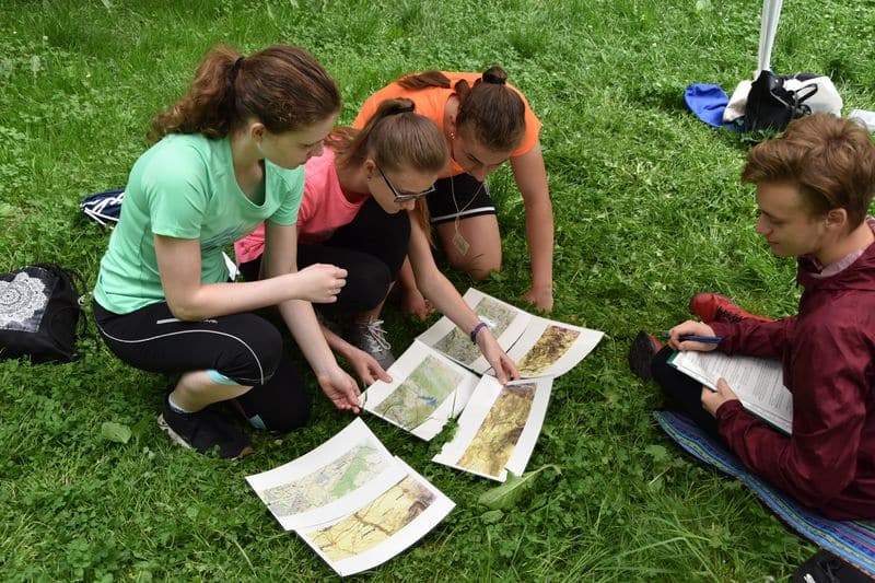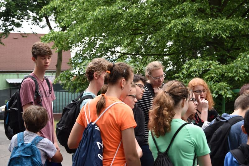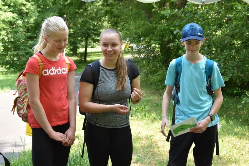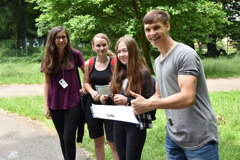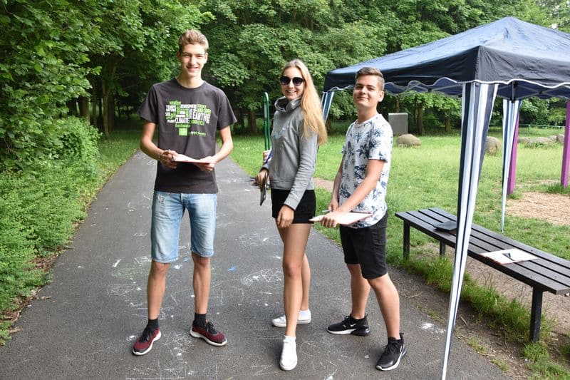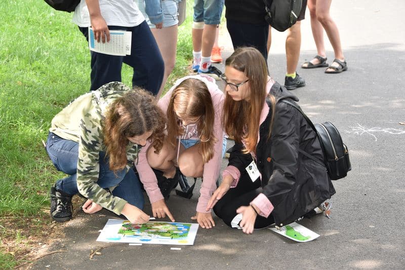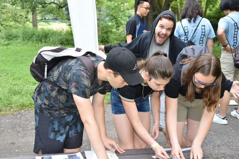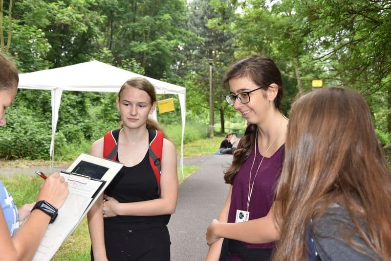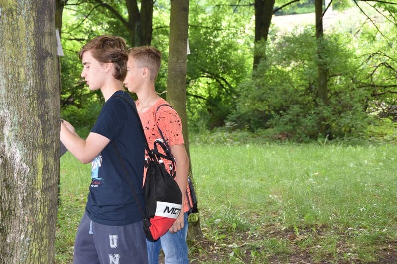 Poté se všichni soutěžící pod dohledem hostesek ze 3. A přesunuli do lesoparku, kde na ně už byli připraveni na deseti stanovištích studenti ze třetího ročníku a septimy se zajímavými úkoly.