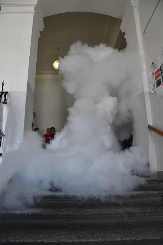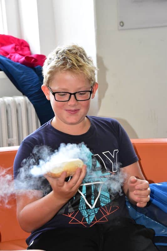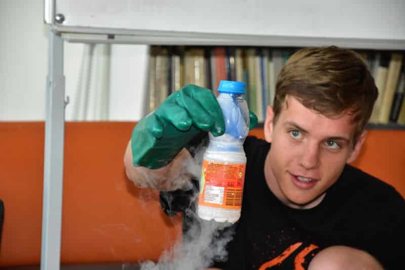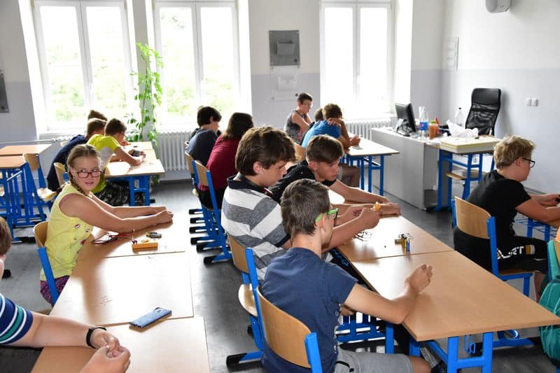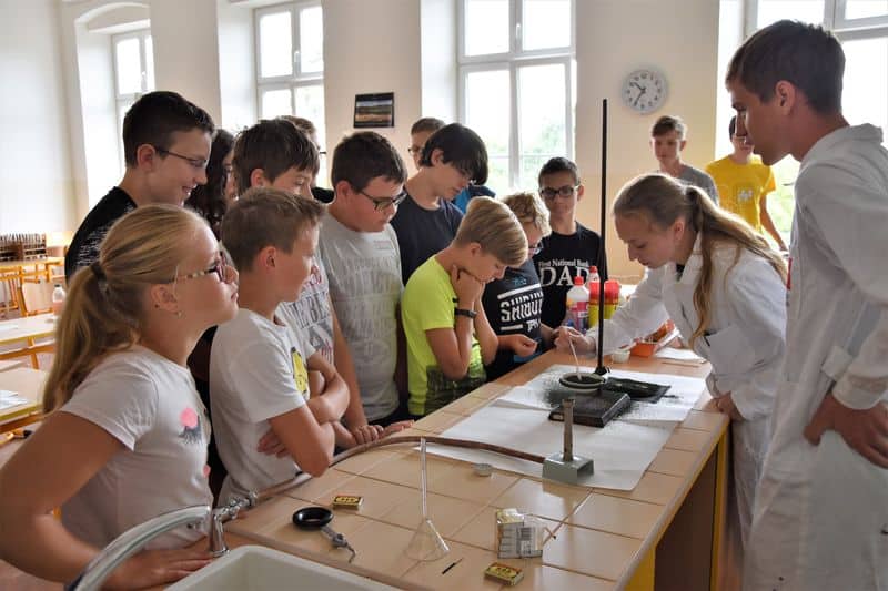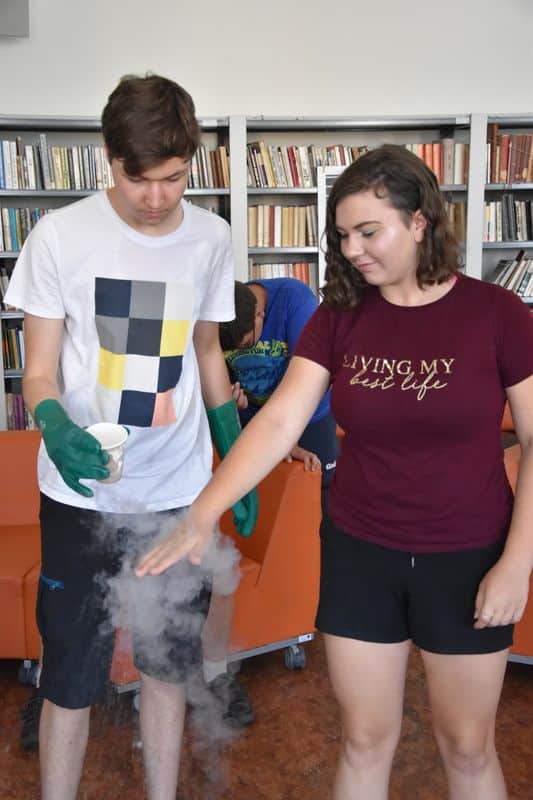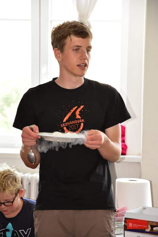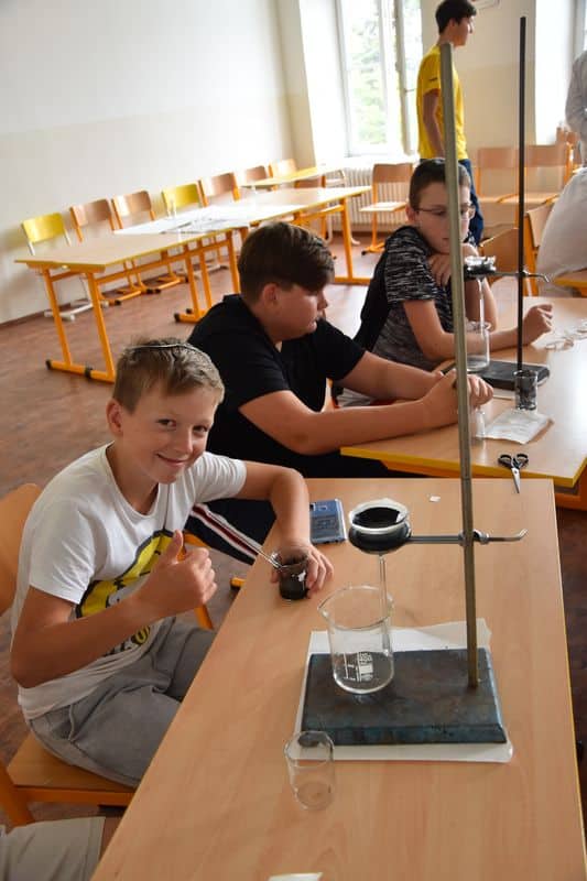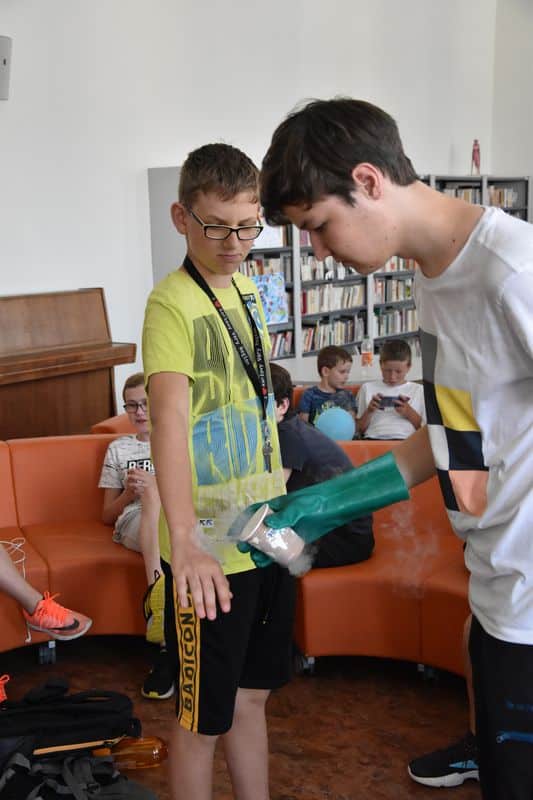 4 dny věnované řešení často velmi praktických úloh z matematiky, fyziky, chemie. Mimo “řešení úloh” se účastníci i ze zmíněných oborů hodně naučili a něco zažili i poprvé v životě. První den byl více sportovní, ale zároveň spojený se seznamováním a hraním logických nebo strategických her v přírodě a městě. Druhý den se naplnil aktivitami více “vědeckými” jako byla práce s ozoboty, logické hrátky, pokusy s ohněm včetně hoření části těla, kdy si každý mohl vyzkoušet jak to dělají různí kejklíři nebo herci ve filmech. Kromě toho den doplnila přednáška o 3d tisku s praktickou ukázkou. Sobota začala chemií, ale tentokrát o cca 300 °C chladnější. Hlavní roli hrál kapalný dusík v objemné Dewarově nádobě. Kapalný dusík a jeho aplikace na části těla, tvorbu zdravé a domácí zmrzliny, vytvoření ledové růže, ledových piškotů nebo také bourání mýtů z filmů o kapalném dusíku. Odpoledne jsme se opět vrhli na fyziku a po ní již přišla kreativní “chuťovka” v podobě vymýšlení a stavění mostu s nejvyšší nosností z předem povolených pomůcek (brčka, špejle, …). Konec dne byl opět “běhací” … Poslední den byla naplánována jedna z hlavních akcí – úniková hra s tématem vesmíru. Týmy se v porouchané kosmické lodi řítily směrem do hvězdy a posádka měla najít řešení k odblokování řízení a otočení mimo hvězdu. Celé zázemí hry vytvořil organizační tým po večerech mezi jednotlivými dny a bylo to vychytané … Další tři týmy mezitím plnily zadání úkolu – “syrové vajíčko z výšky spadne na zem a nerozbije se”. Tady se naplno projevila kreativita účastníků, kteří vytvářeli padáky, různé konstrukce a testovali, zda to vydrží … S vědou jsme se rozloučili prostřednictvím virtuální reality. Účastníci se procházeli po různých místech na světě, prohlíželi si lidské tělo zevnitř a stříleli z luku, házeli míčem …
