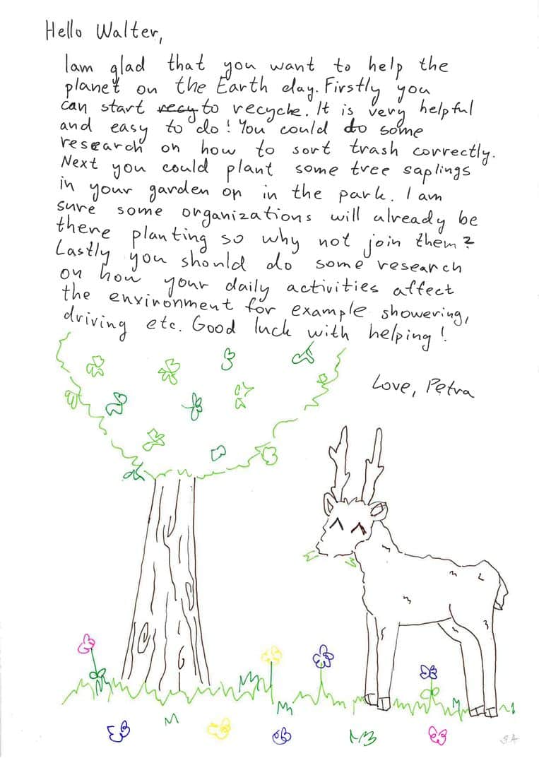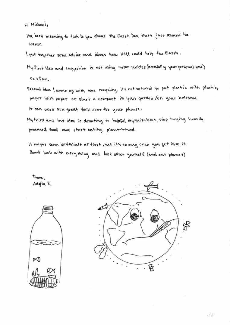 Vznikly výukové plakáty, které pověsíme ve škole. Další třída v anglickém jazyce procvičila slovní zásobu na téma ekologie a studenti vytvořili papírové tašky s návody nebo vzkazem ,,Jak pomoci naší zemi,,. Vyšší ročníky psali vzkaz formou dopisů. V rámci občasné výuky jsme se dívali se sekundány na film „Jedna planeta“ a pak si o něm povídali a hledali odpovědi na otázky: Co je pro ně nejvíce fascinující? Co člověk Zemi způsobil? Co lze ještě zachránit? Co může udělat jednotlivec?