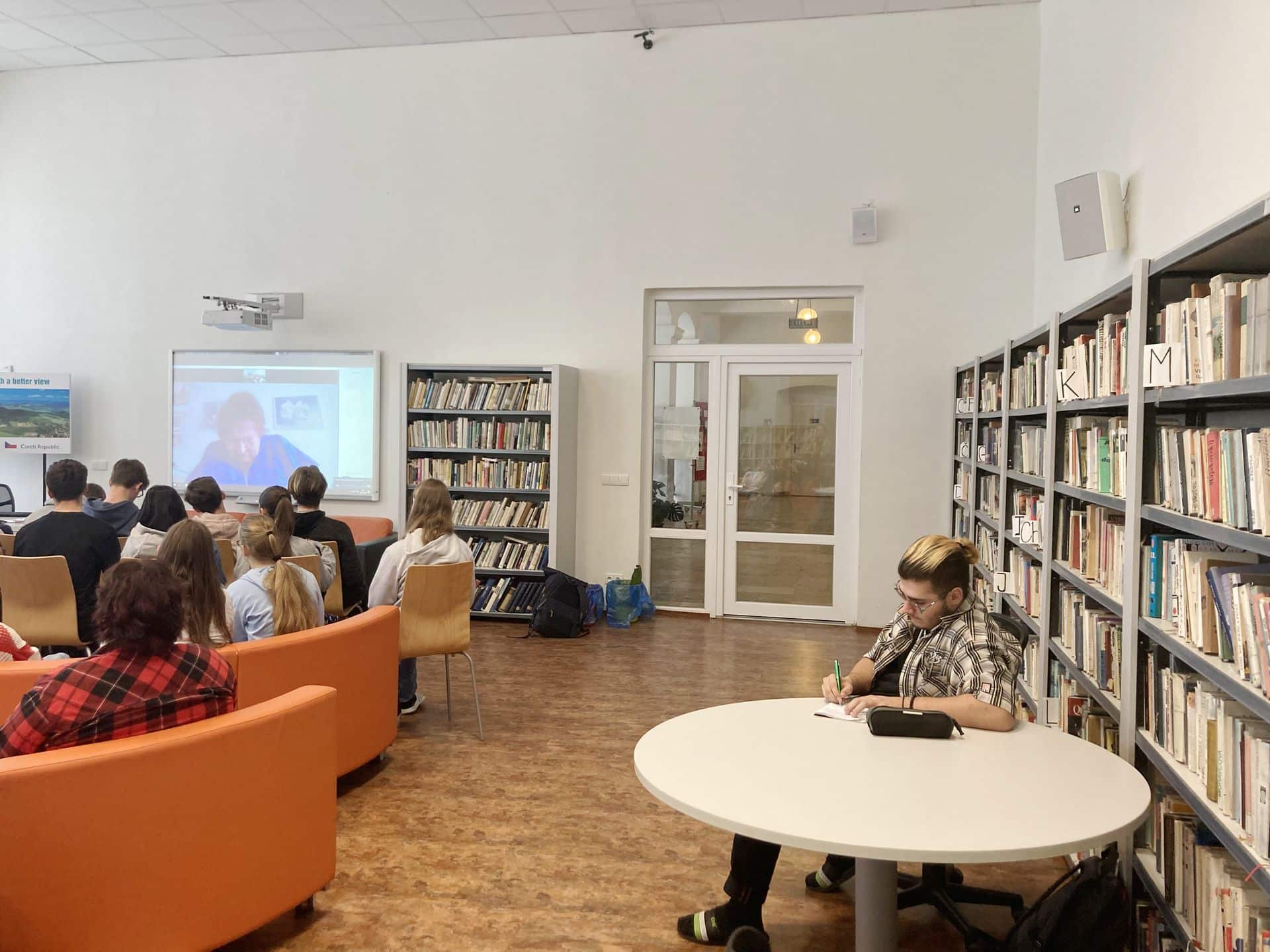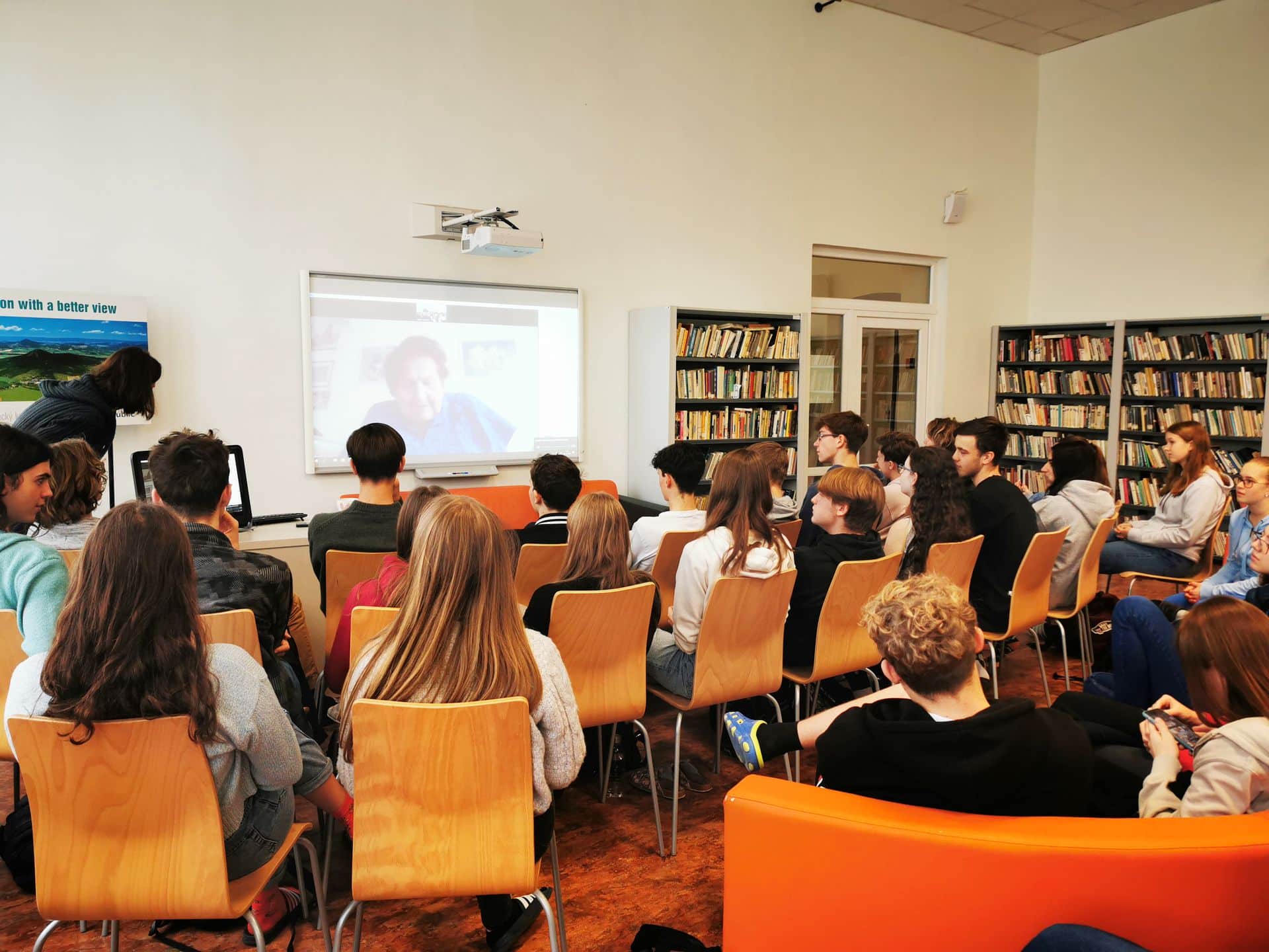Po četbě z knihy následovala společná hodina, kdy jsme se obě třídy sešly v aule k online besedě se vzácnou pamětnicí. Ta žije od devadesátých let v Praze v malé garsonce, kterou jí pomohl opatřit Václav Havel. Na svůj věk je paní Merová velmi zdatná v práci s počítačem, odpovídala na řadu našich otázek. „Moc se nám to líbilo. Nebyla zahořklá životem. Předávání těchto strašných zkušeností považuje za důležité. Zjistili jsme, co se dělo po holocaustu. Udivilo mě, kolik si toho z tak dávné doby pamatovala a že o tak těžkých věcech vůbec dokázala veřejně mluvit. Na všechny naše otázky nám sice odpověděla stručně, ale zároveň přímo a výstižně. Z dnešní besedy jsem si odnesla, jak náročný byl život po válce, i když se na to často zapomíná.“