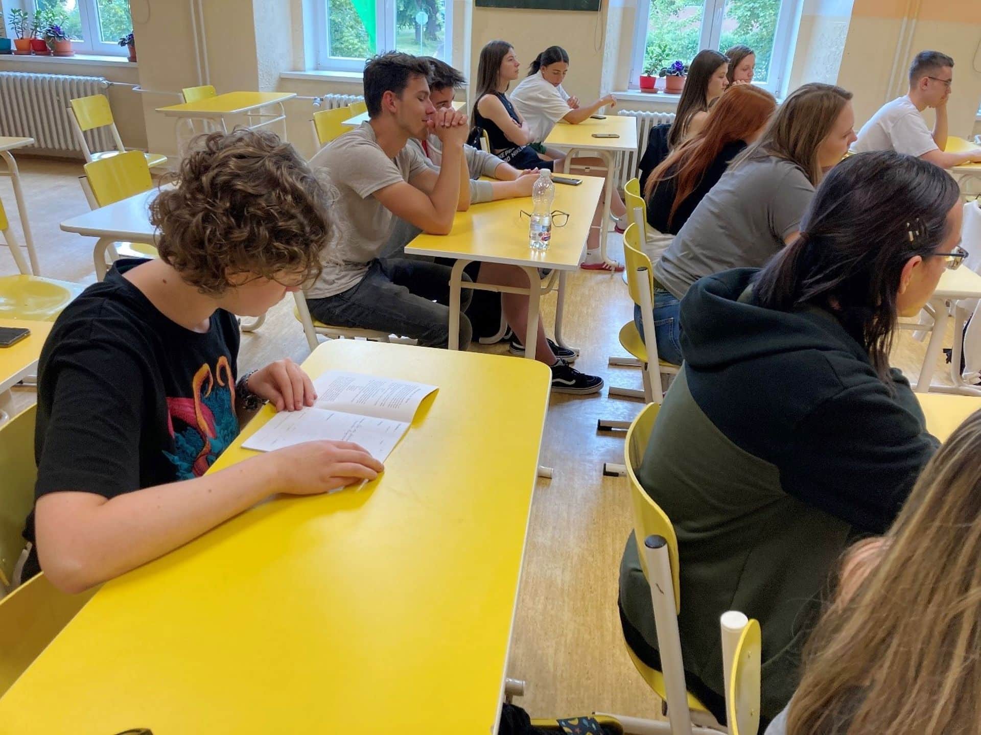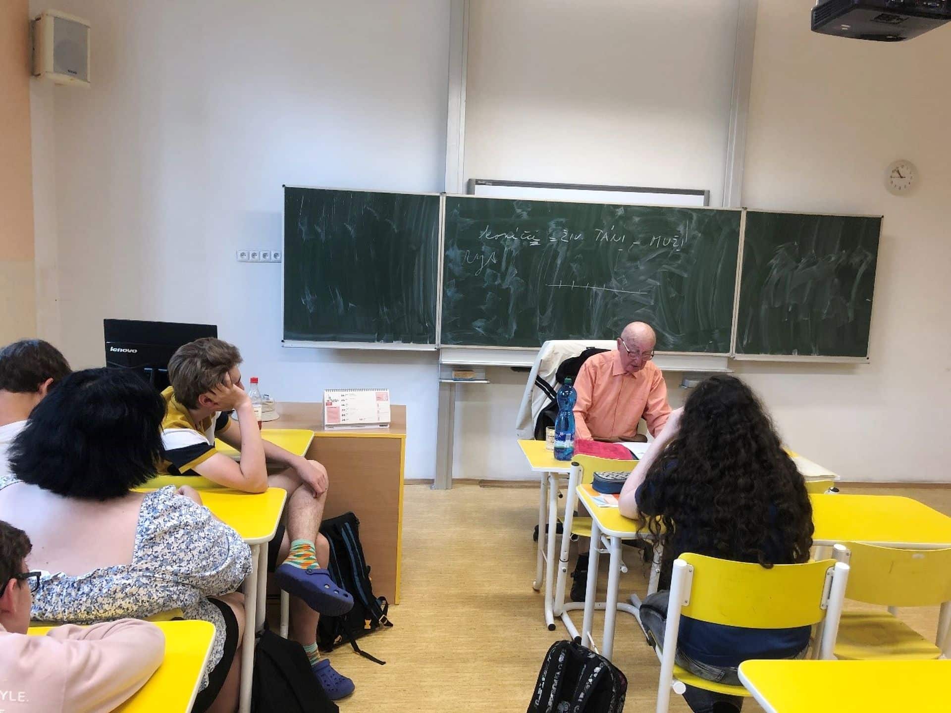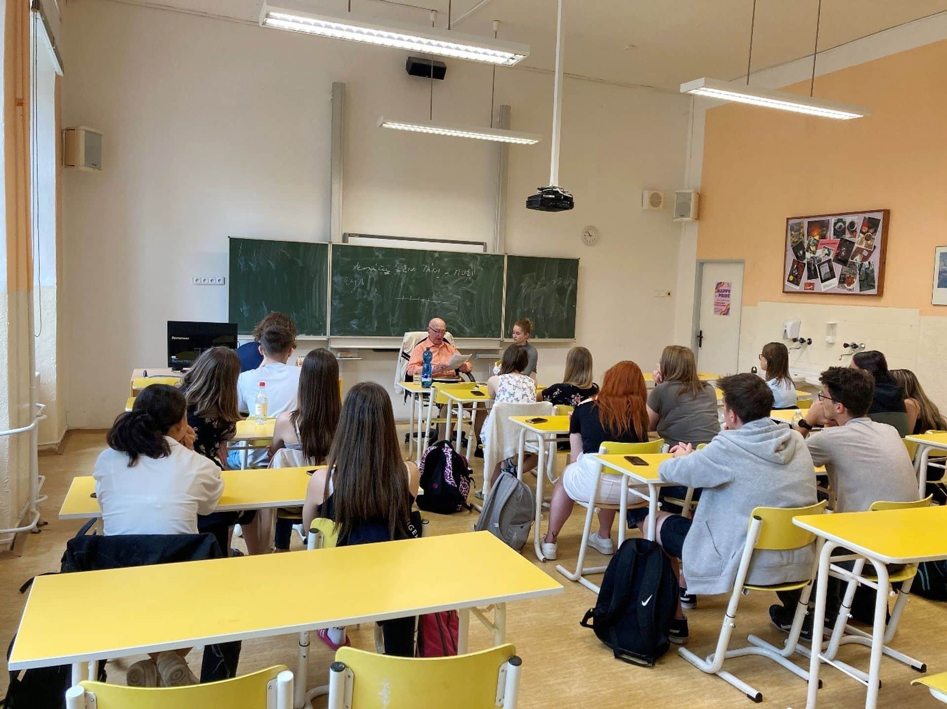 Natálie Bartoňová z 2. B zpracovává odbornou práci, ve které zpovídá mladší i starší pamětníky a snaží se z jejich výpovědí poskládat obrázek 20. století. Jedním z oslovených byl pan Marcel Šlaj z Chomutova, který se roku 1933 narodil v dnes již neexistujících Ervěnicích. Ve čtvrtek 15. června vyprávěl o svém životě postupně dvěma třídám – sextě a 2.B. Výjimečné bylo jeho svědectví o poměrech v pohraničí očima malého českého kluka, který musel chodit do německé školy a jehož rodiče po Mnichovu nesměli odejít do vnitrozemí kvůli odborné kvalifikaci jeho tatínka. Studenti shrnuli, co jim na besedě přišlo nejzajímavější a nové a na co by se případně ještě potřebovali a chtěli doptat: