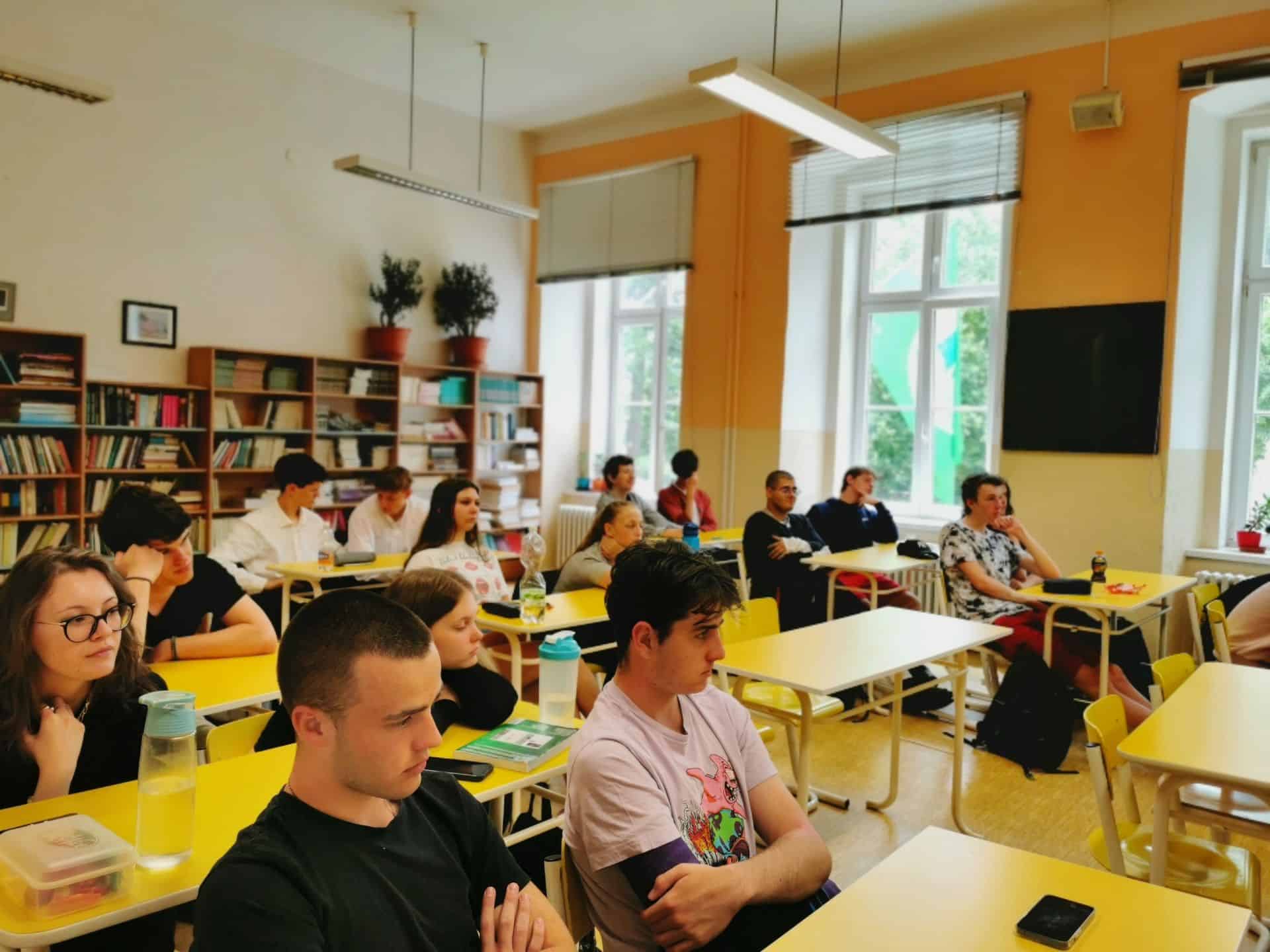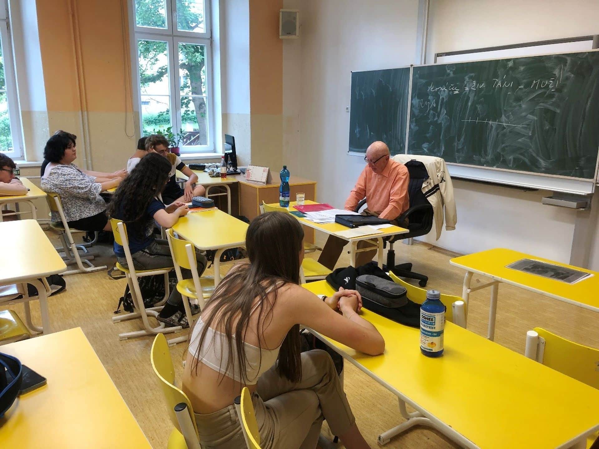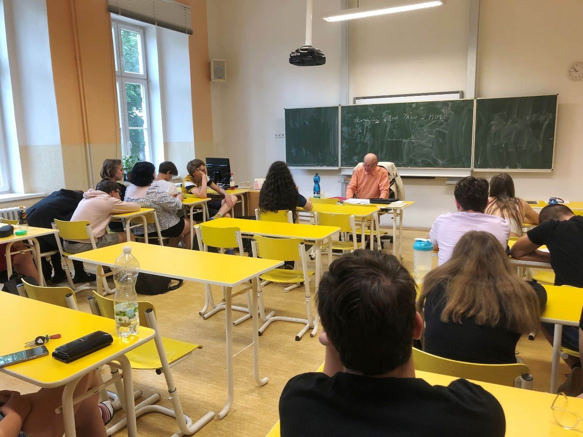 Natálie Bartoňová z 2. B zpracovává odbornou práci, ve které zpovídá mladší i starší pamětníky a snaží se z jejich výpovědí poskládat obrázek 20. století. Jedním z oslovených byl pan Marcel Šlaj z Chomutova, který se roku 1933 narodil v dnes již neexistujících Ervěnicích. Ve čtvrtek 15. června vyprávěl o svém životě postupně dvěma třídám – sextě a 2.B. Výjimečné bylo jeho svědectví o poměrech v pohraničí očima malého českého kluka, který musel chodit do německé školy a jehož rodiče po Mnichovu nesměli odejít do vnitrozemí kvůli odborné kvalifikaci jeho tatínka. Studenti shrnuli, co jim na besedě přišlo nejzajímavější a nové a na co by se případně ještě potřebovali a chtěli doptat: