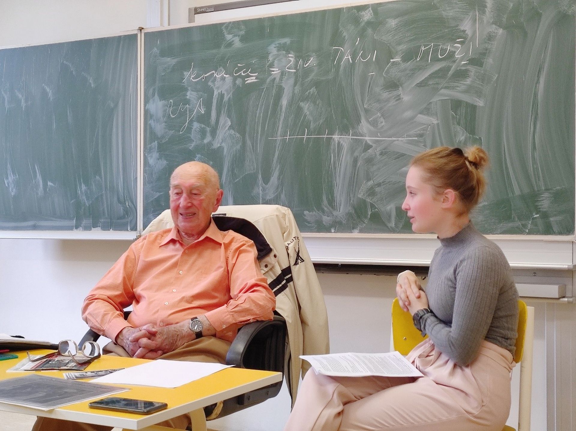 Natálie Bartoňová z 2. B zpracovává odbornou práci, ve které zpovídá mladší i starší pamětníky a snaží se z jejich výpovědí poskládat obrázek 20. století. Jedním z oslovených byl pan Marcel Šlaj z Chomutova, který se roku 1933 narodil v dnes již neexistujících Ervěnicích. Ve čtvrtek 15. června vyprávěl o svém životě postupně dvěma třídám – sextě a 2.B. Výjimečné bylo jeho svědectví o poměrech v pohraničí očima malého českého kluka, který musel chodit do německé školy a jehož rodiče po Mnichovu nesměli odejít do vnitrozemí kvůli odborné kvalifikaci jeho tatínka. Studenti shrnuli, co jim na besedě přišlo nejzajímavější a nové a na co by se případně ještě potřebovali a chtěli doptat: