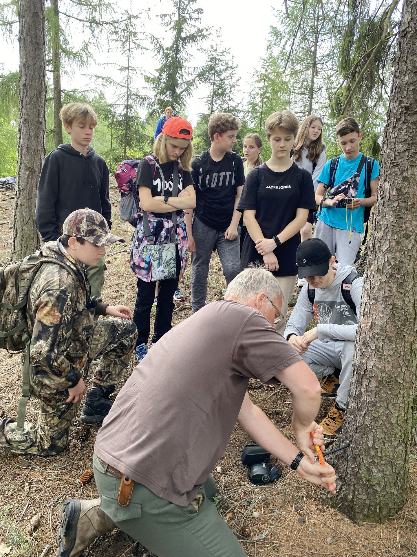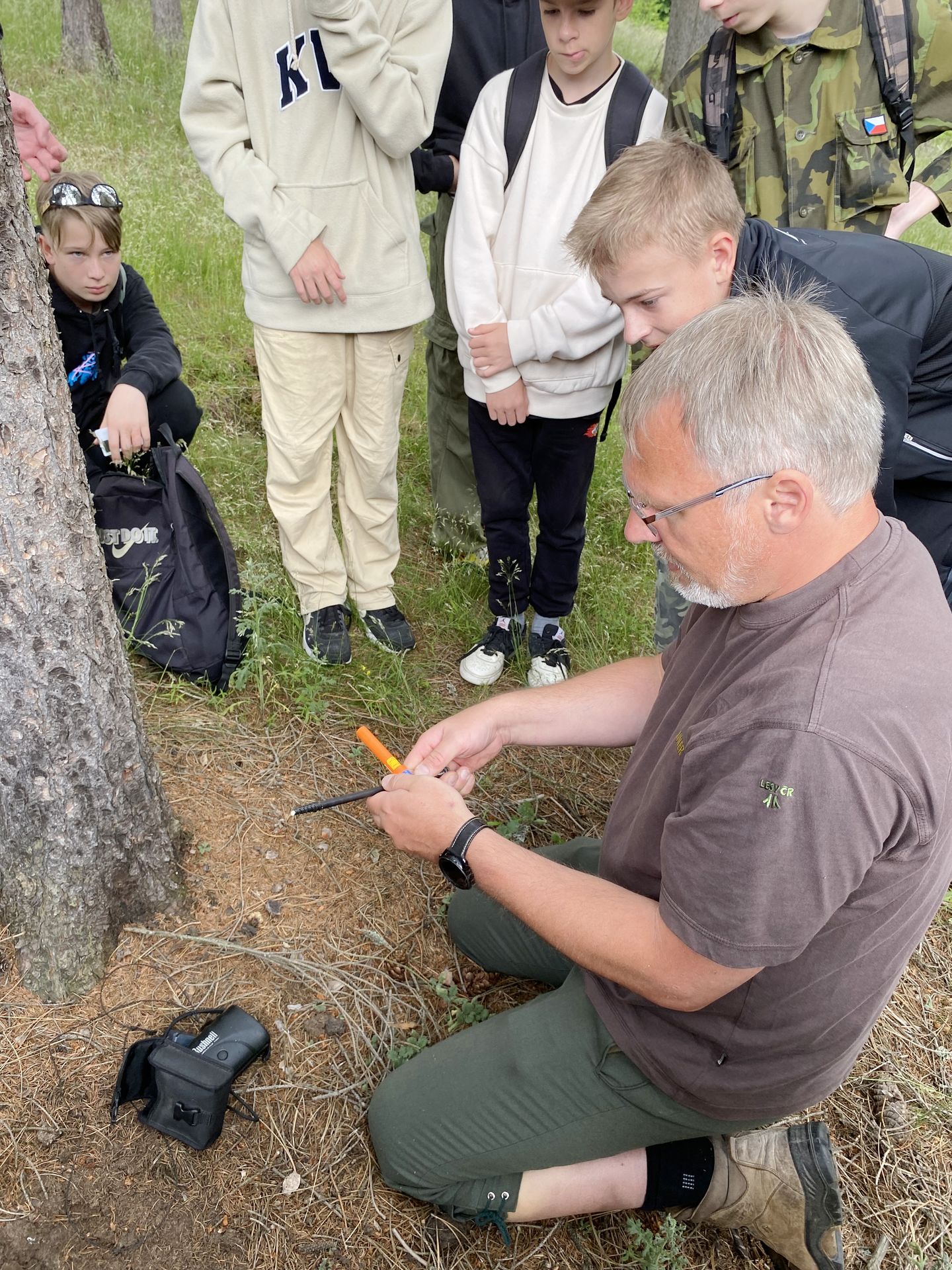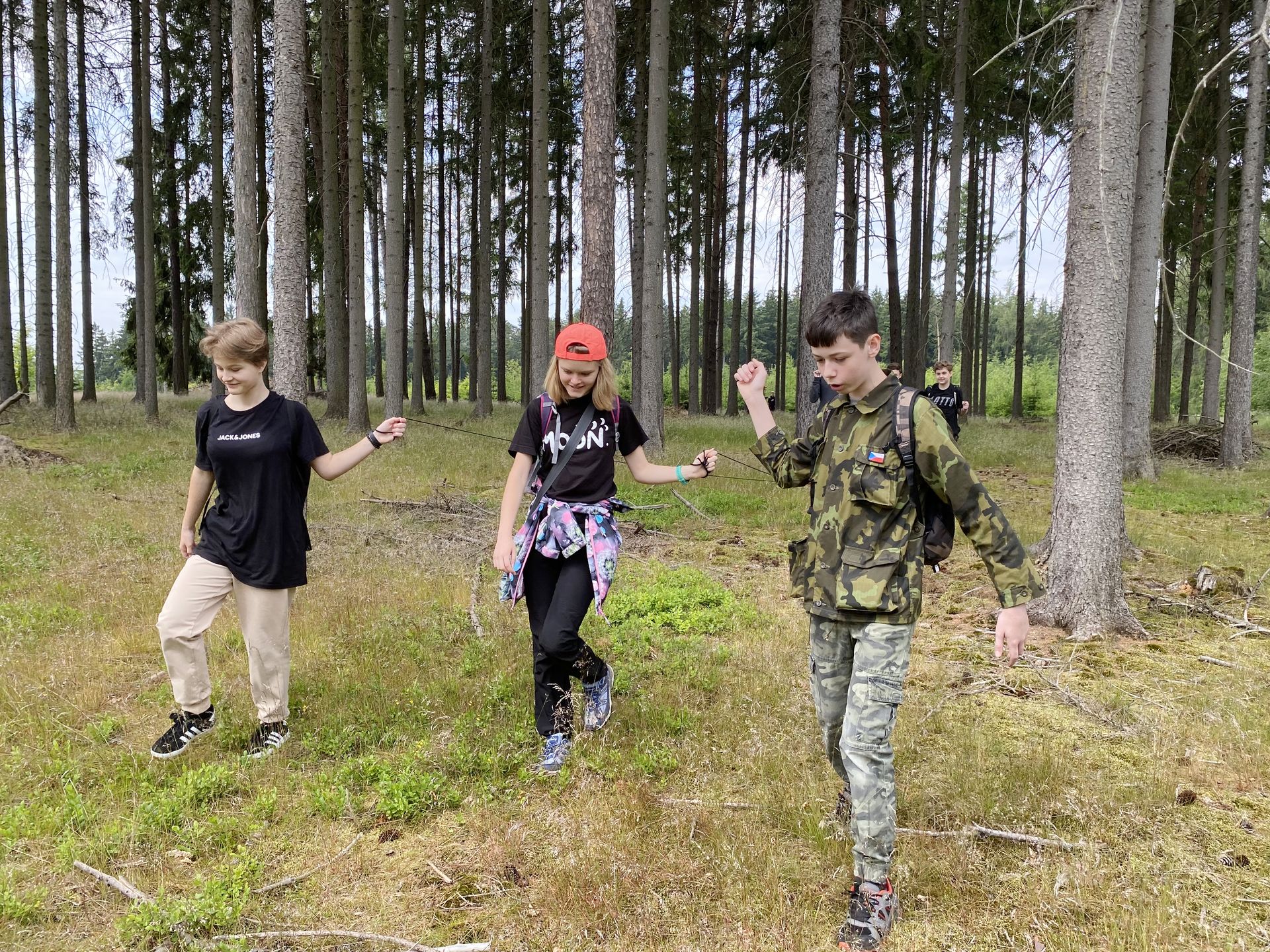 Ke konci školního roku jsme plní znalostí, ale lavice jsou nám těsné, a tak jsme s paní učitelkou Kuchtaninovou a třídní učitelkou Nix vyrazili prověřit své vědomosti do lesů. V mírném dešti na nás čekal pracovník Lesů ČR pan Hrouda, který měl pro nás již vše nachystáno – a nebylo toho málo! Zjistili jsme, jak vypadá mapa revíru a jak poznáme stáří stromu, což jsme si hned vyzkoušeli a do stromu našroubovali nebozez. Poznávali jsme druhy stromů a prozkoumali pasti na kůrovce. Když už jsme měli pocit, že se po lese pohybujeme jako srnky, dostali jsme za úkol rozdělit se do skupin a donést na další stanoviště míček propojený provázkem. To už jsme se soustředili spíš na spolupráci a na finální ohýnek.