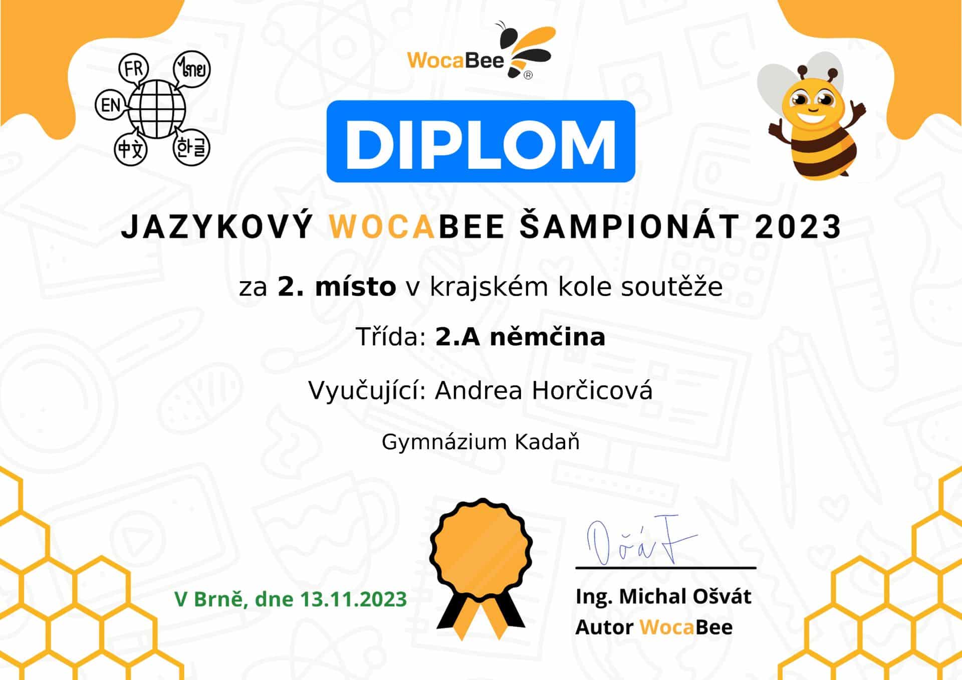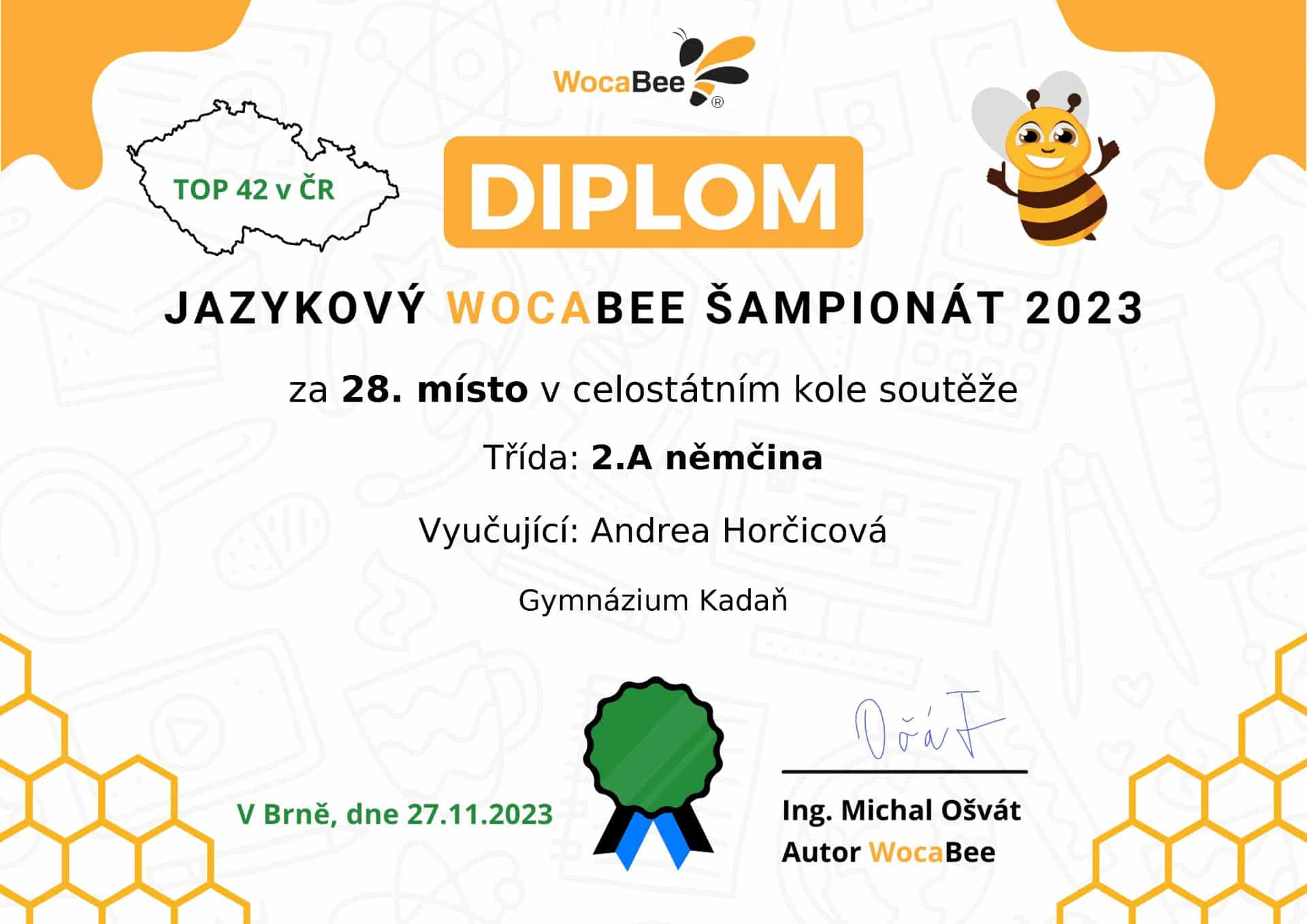 Studenti a studentky z 2. A se zapojili v německém jazyce do pátého ročníku inovativní soutěže pro školy s názvem Jazykový WocaBee šampionát. V rámci Ústeckého kraje jsme obsadili vynikající 2. místo, díky čemuž postoupujeme do celostátního kola. Druháci dosáhli tohoto skvělého výsledku v celkové konkurenci soutěžících ze 190 tříd našeho kraje, které se do soutěže zapojili.