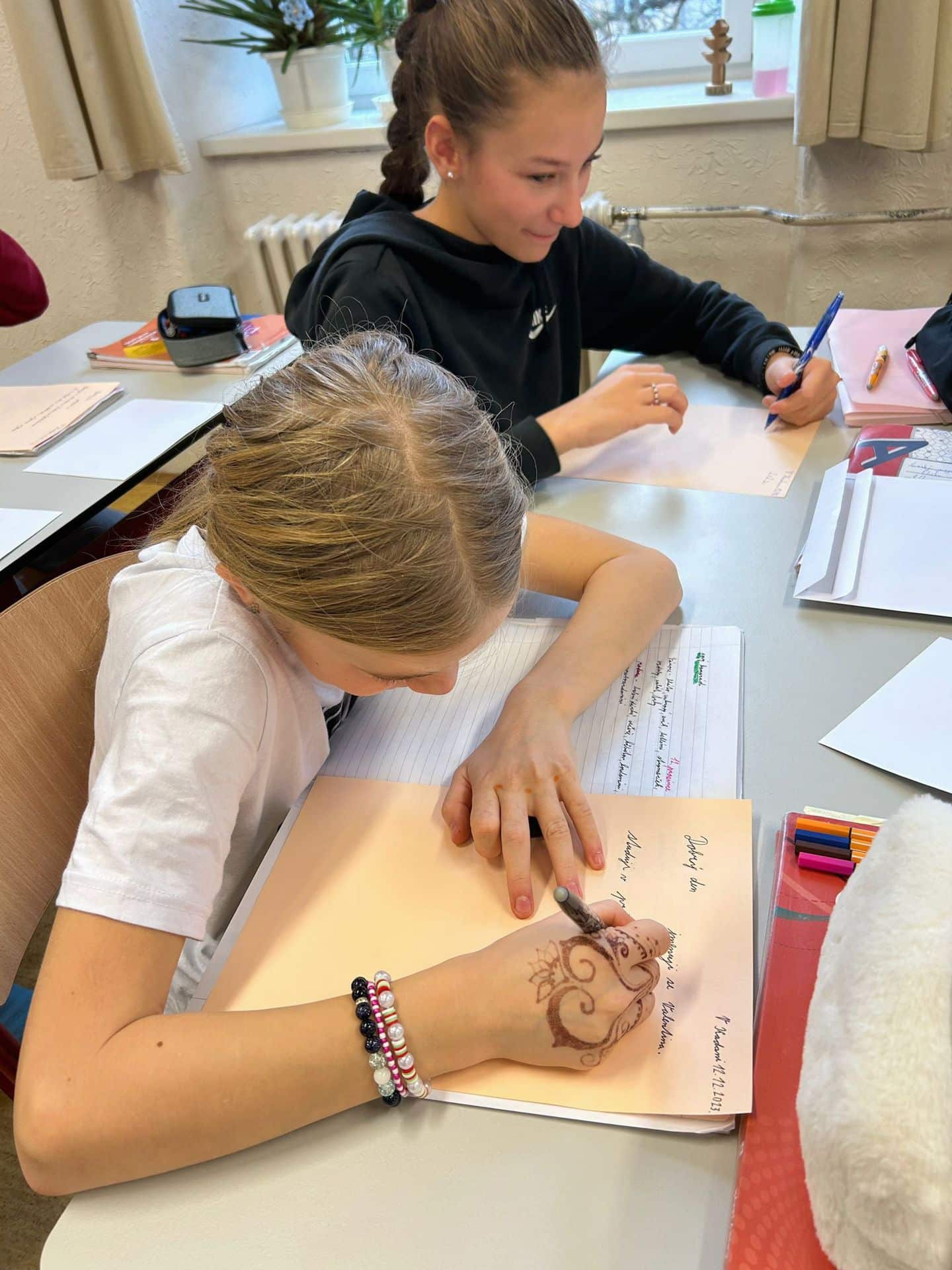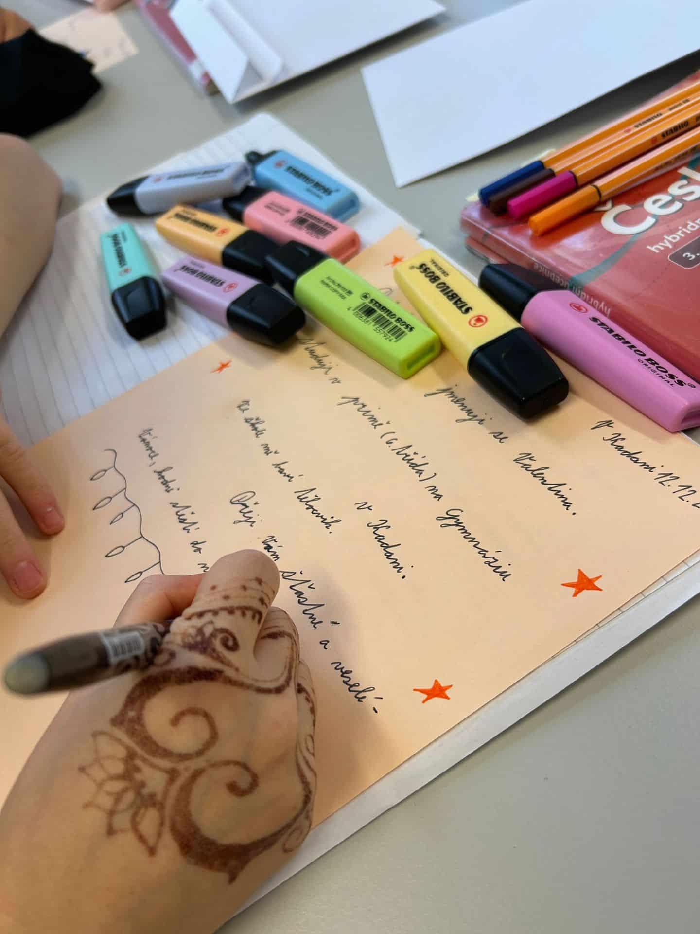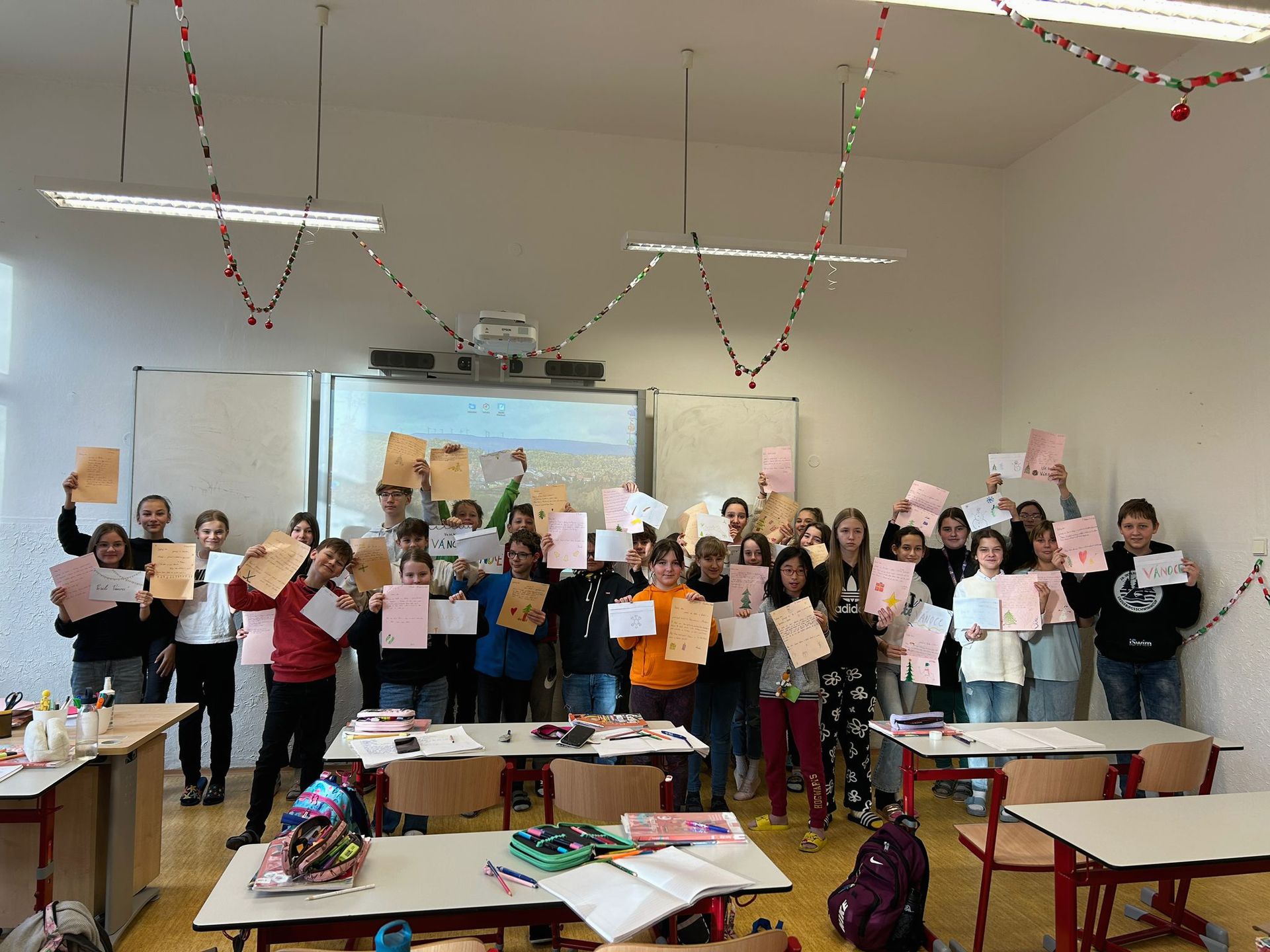 I když jsou naši primáni na gymnáziu teprve pár měsíců, přesto jsou velice šikovní a milí. Na hodině českého jazyka s Lenkou De Bolle se rozhodli napsat vánoční dopisy seniorům do Domova pro seniory v Kadani. Studentstvo tedy nelenilo, vzalo do rukou pera a začalo psát krásná přáníčka a vánoční pozdravy, aby udělalo dědečkům a babičkám radost. Po sepsání poté vyrazili přímo do Domova pro seniory v Kadani, aby dopisy osobně předali a doprovázely je kolegyně Sabina Fejsáková a Ludmila Fichtnerová.