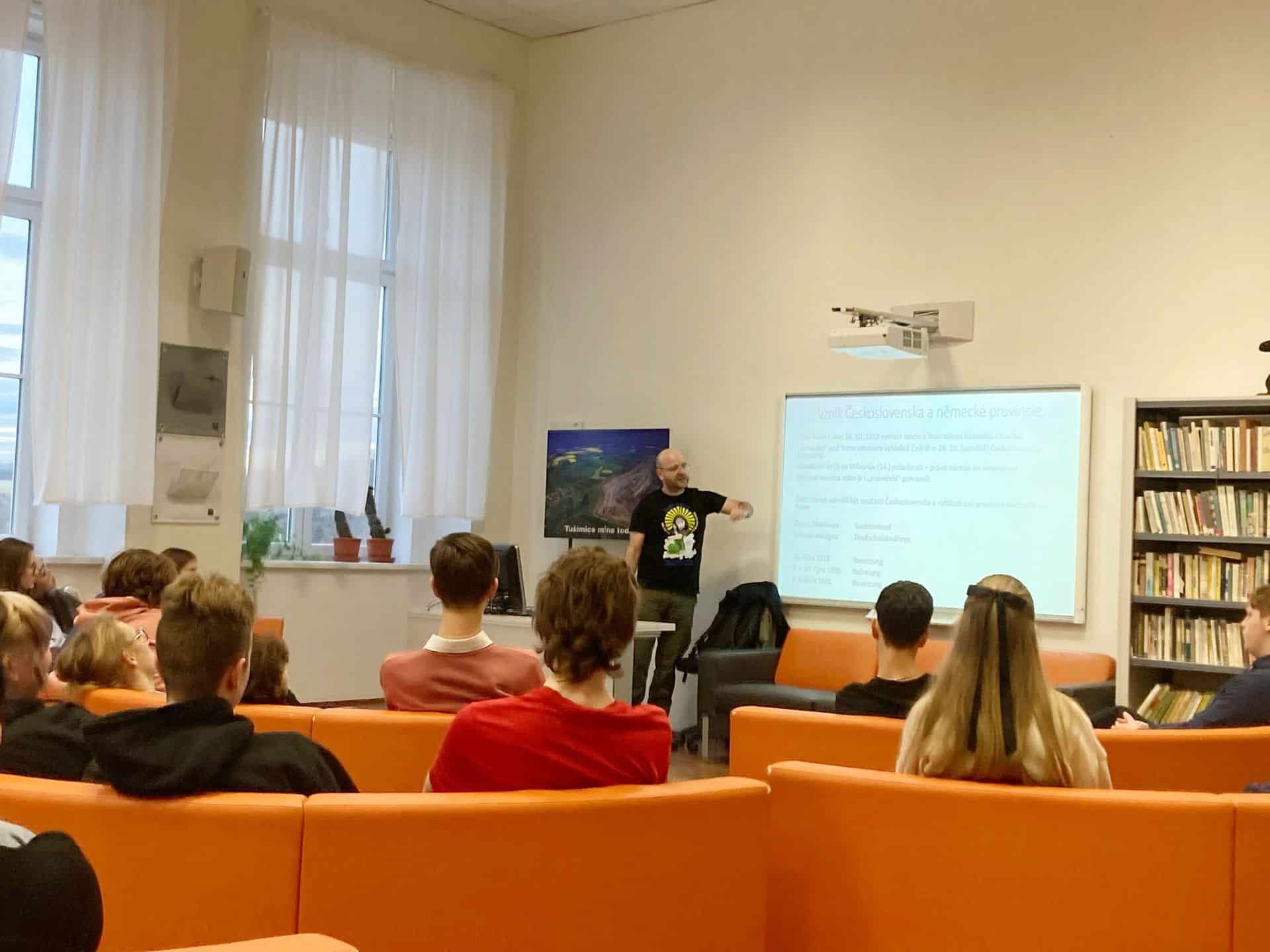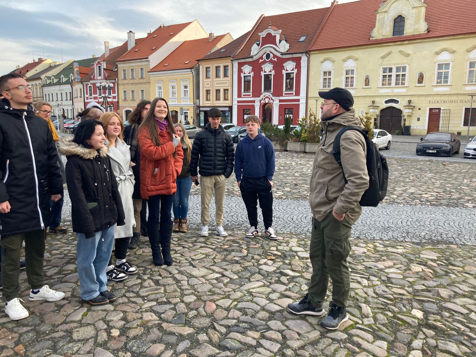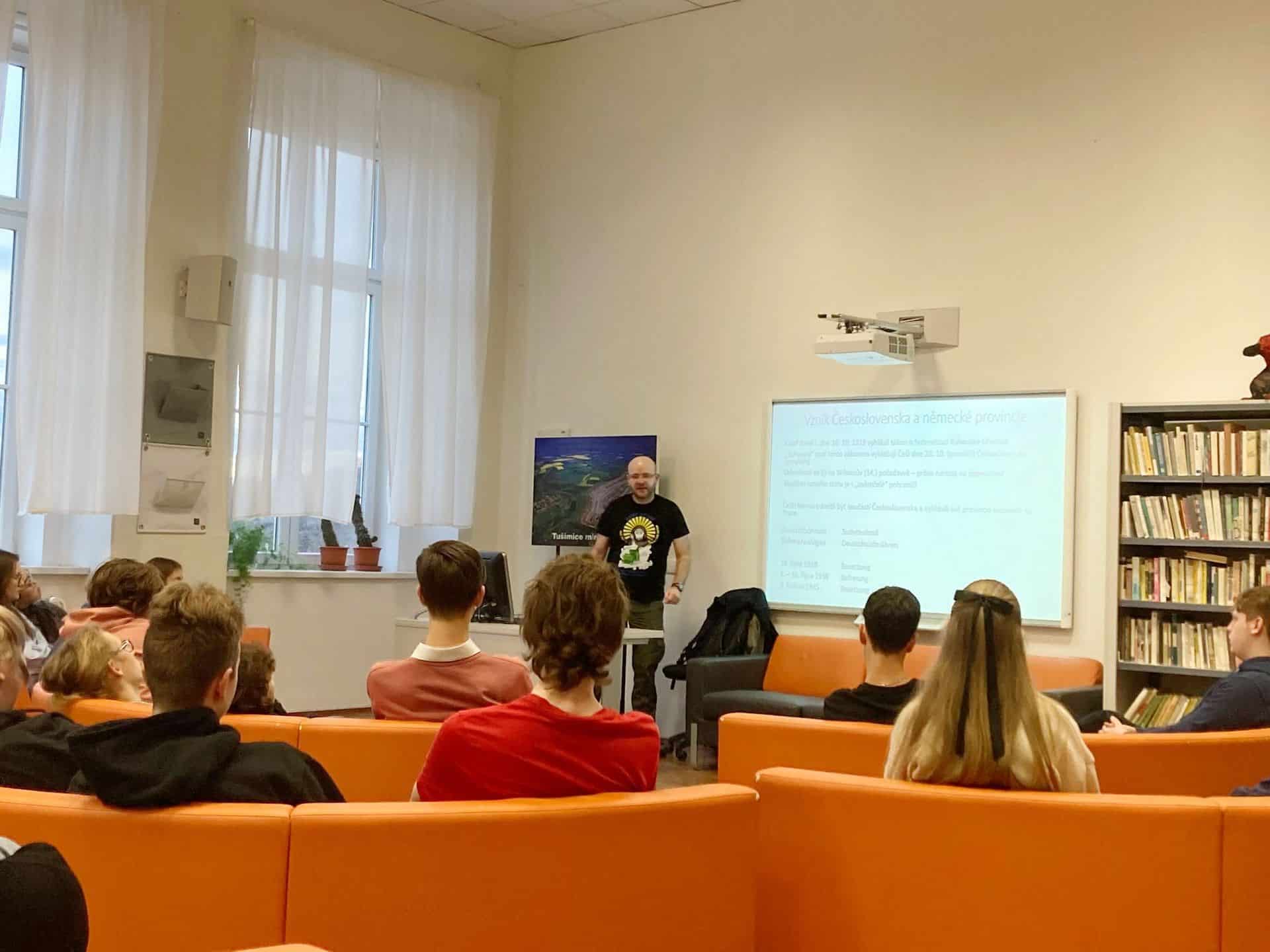 V úterý 19. prosince se studenti septimy a 3. B vrátili v čase (ne tolik v prostoru) do 4. března 1919, když nejprve ve škole vyslechli přednášku Jiřího Kopici, historika Chomutovského oblastního muzea, a pak společně navštívili kadaňské náměstí. Byli seznámeni s okolnostmi napjatých česko-německých vztahů, které sahaly hlouběji do 19. století, pan Kopica objasnil i mezinárodní kontext a pak se více věnoval vzniku německých provincií, touhám po sebeurčení a jeho nejednoznačnému a složitému chápání. Na náměstí se zastavili u sloupu Nejsvětější Trojice, poslouchali podrobný popis tehdejších událostí a rozhlíželi se po dotčených památkách (pošta, radnice, soud, konzum…) a zmínili se i o těch, kam dojít nestihli (Hrad, Střelnice). Studenti vnímali stopy minulosti v konkrétním prostoru, který dobře znají, a mohli i popřemýšlet nad tím, jaký vliv mají vzpomínky (a má vzpomínání) při formování našeho pohledu na dějiny.