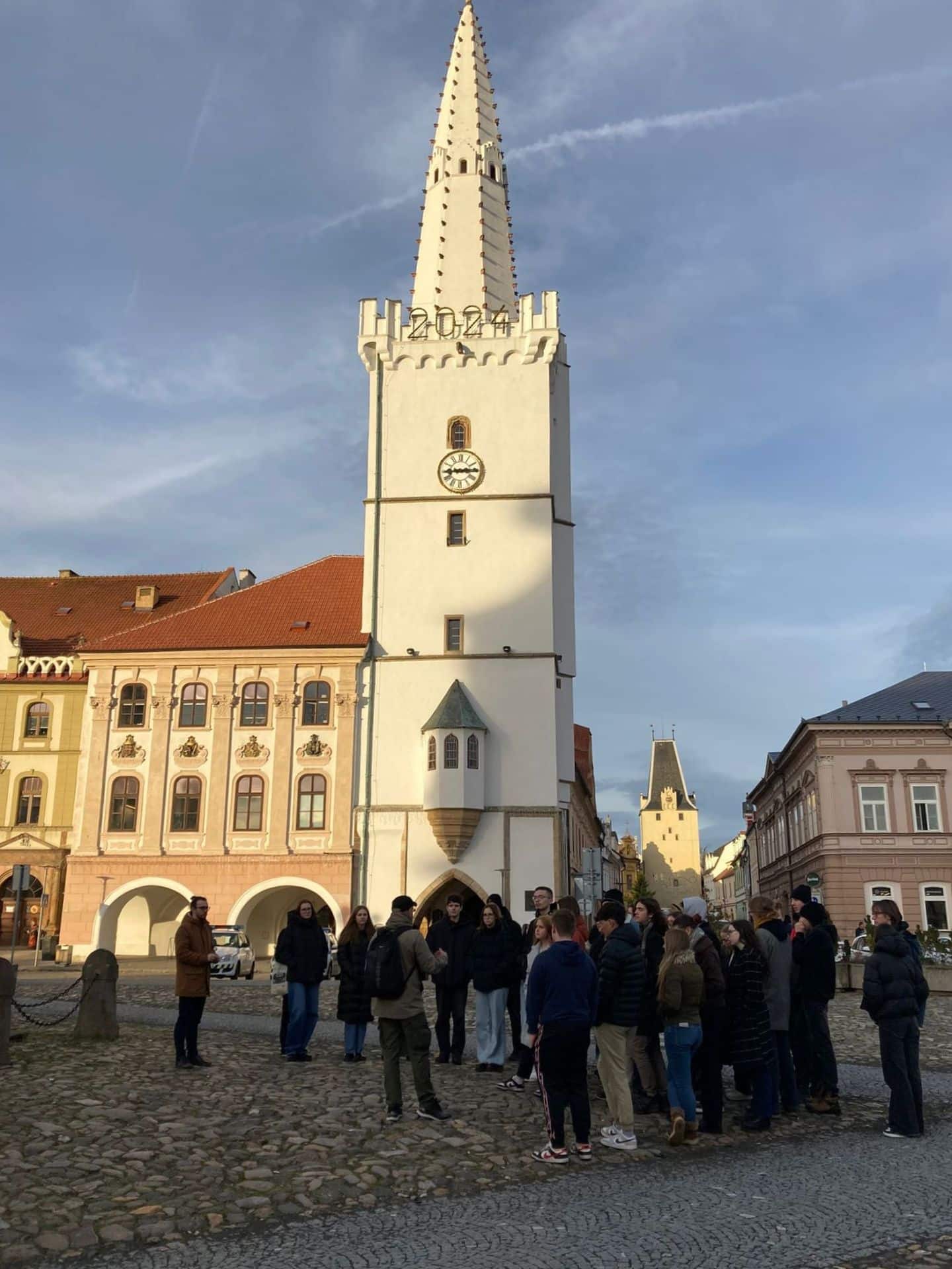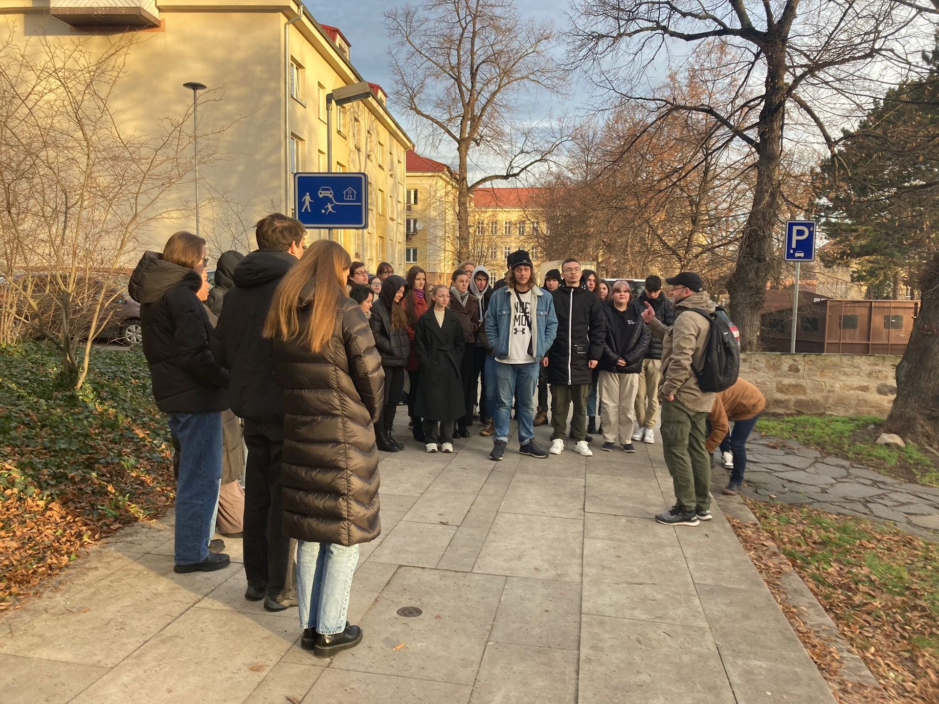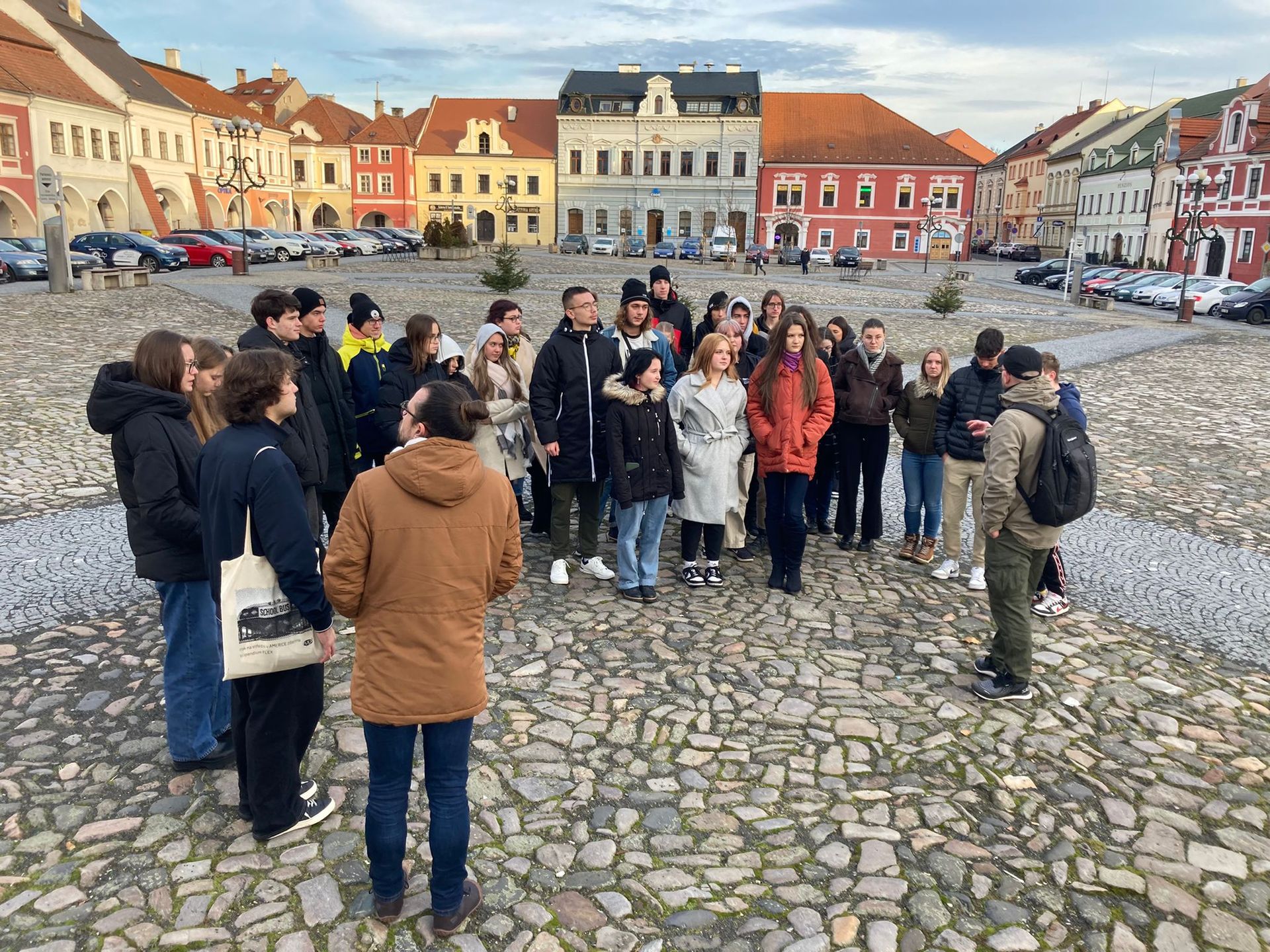 V úterý 19. prosince se studenti septimy a 3. B vrátili v čase (ne tolik v prostoru) do 4. března 1919, když nejprve ve škole vyslechli přednášku Jiřího Kopici, historika Chomutovského oblastního muzea, a pak společně navštívili kadaňské náměstí. Byli seznámeni s okolnostmi napjatých česko-německých vztahů, které sahaly hlouběji do 19. století, pan Kopica objasnil i mezinárodní kontext a pak se více věnoval vzniku německých provincií, touhám po sebeurčení a jeho nejednoznačnému a složitému chápání. Na náměstí se zastavili u sloupu Nejsvětější Trojice, poslouchali podrobný popis tehdejších událostí a rozhlíželi se po dotčených památkách (pošta, radnice, soud, konzum…) a zmínili se i o těch, kam dojít nestihli (Hrad, Střelnice). Studenti vnímali stopy minulosti v konkrétním prostoru, který dobře znají, a mohli i popřemýšlet nad tím, jaký vliv mají vzpomínky (a má vzpomínání) při formování našeho pohledu na dějiny.
