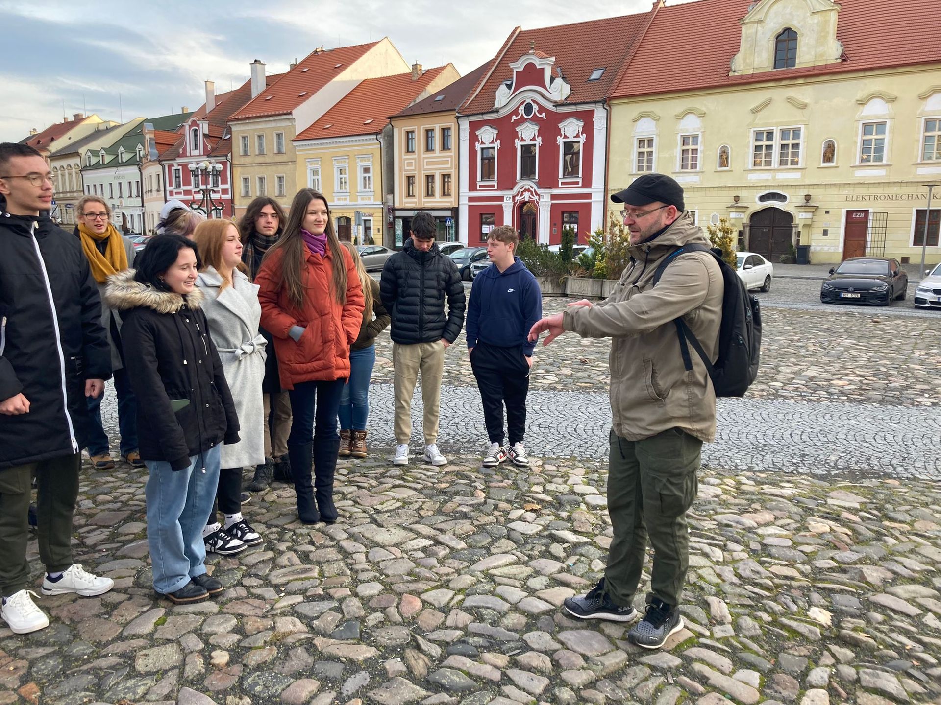 V úterý 19. prosince se studenti septimy a 3. B vrátili v čase (ne tolik v prostoru) do 4. března 1919, když nejprve ve škole vyslechli přednášku Jiřího Kopici, historika Chomutovského oblastního muzea, a pak společně navštívili kadaňské náměstí. Byli seznámeni s okolnostmi napjatých česko-německých vztahů, které sahaly hlouběji do 19. století, pan Kopica objasnil i mezinárodní kontext a pak se více věnoval vzniku německých provincií, touhám po sebeurčení a jeho nejednoznačnému a složitému chápání. Na náměstí se zastavili u sloupu Nejsvětější Trojice, poslouchali podrobný popis tehdejších událostí a rozhlíželi se po dotčených památkách (pošta, radnice, soud, konzum…) a zmínili se i o těch, kam dojít nestihli (Hrad, Střelnice). Studenti vnímali stopy minulosti v konkrétním prostoru, který dobře znají, a mohli i popřemýšlet nad tím, jaký vliv mají vzpomínky (a má vzpomínání) při formování našeho pohledu na dějiny.
