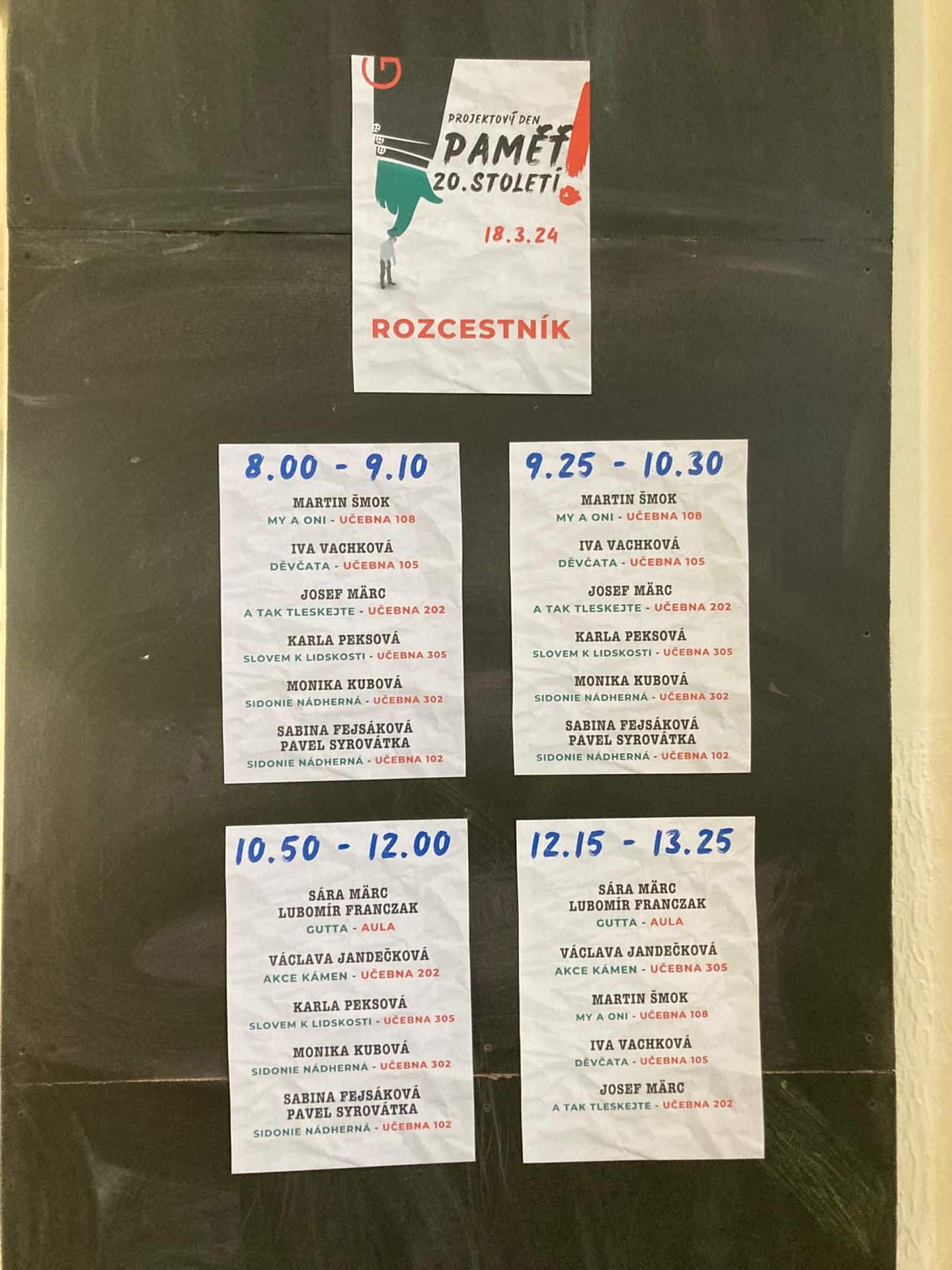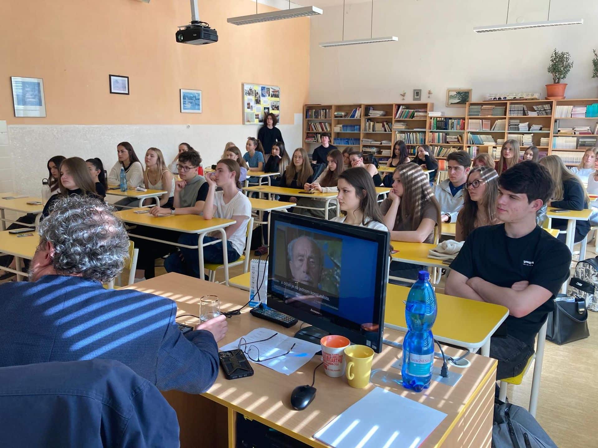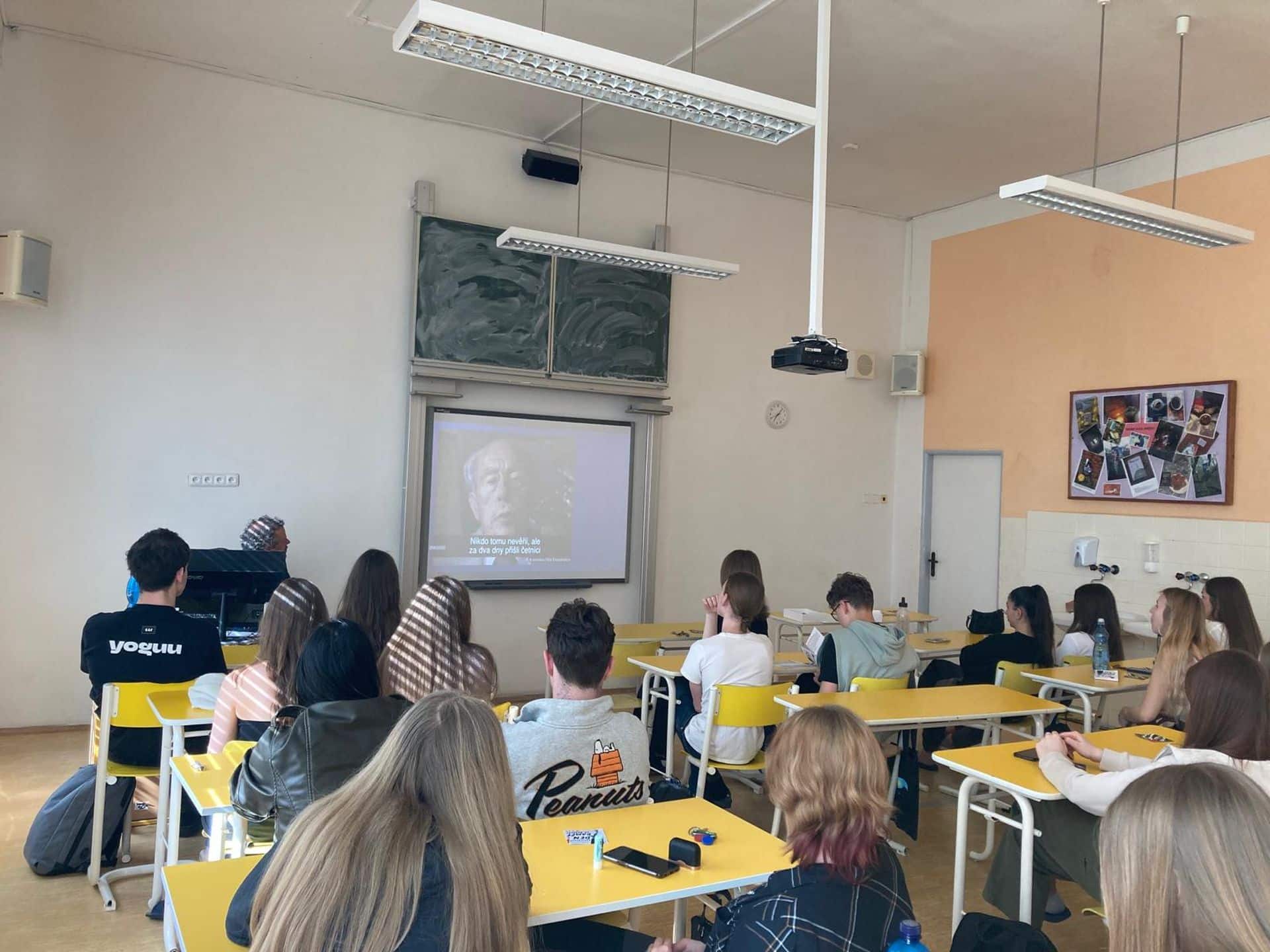 Většinu studentů vyššího gymnázia čekal v pondělí 18. března projektový den k moderním dějinám a mediální výchově. Předem si mohli napříč třídami zvolit, jakých workshopů a přednášek se zúčastní, či zda je zajímá performance Gutta. Od osmi do půl druhé vystřídali čtyři lekce, mezi nimi měli přestávky. Protože lekce trvaly 70 a přestávky jen 15 minut, rozhodli jsme se, že příště o jednu lekci ubereme a přestávky prodloužíme. Aby si studenti stihli sdělit dojmy, dojít do další učebny, nasvačit se. Po celý týden jsme se v hodinách dějepisu, ZSV i češtiny či angličtiny k pondělní akci vraceli a se studenty ji reflektovali. Jejich ohlasy byly ve velké převaze velice pozitivní, každému se líbilo něco, mnohým se líbilo všechno. Nejvíce oceňovali ty workshopy, které je donutily dívat se jinak, ptát se tak, jak je zatím vůbec nenapadlo.