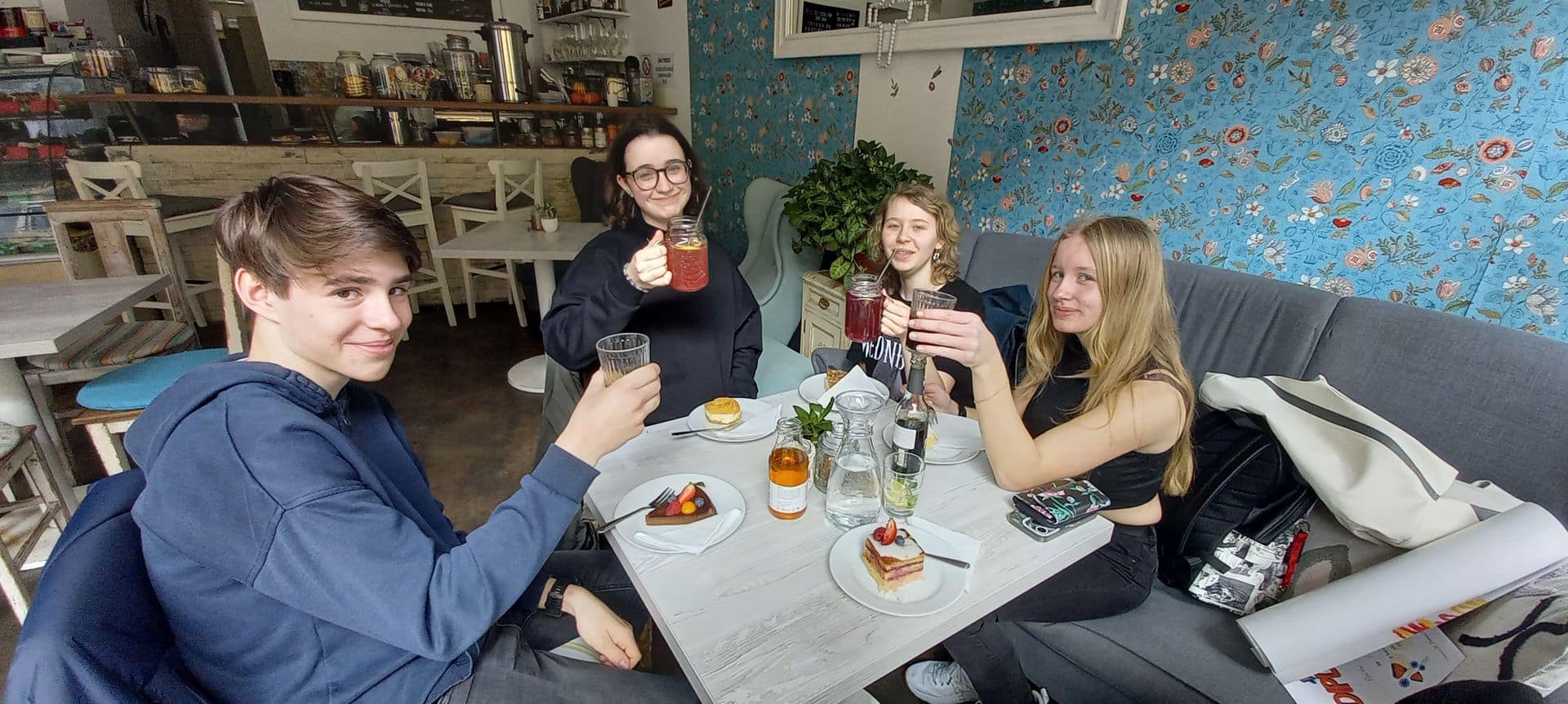 Z olympiády jsme odjeli se třetím a druhým místem, konkrétně Julie Kopicová 3.místo a Eliška Podhorná 2.místo. Nicméně, všichni studenti byli šikovní. Autobus jel až za nějakou chvíli a tak naše španělsky hovořící skupinka „skončila“ v kavárně…oblíbené místo všech.
