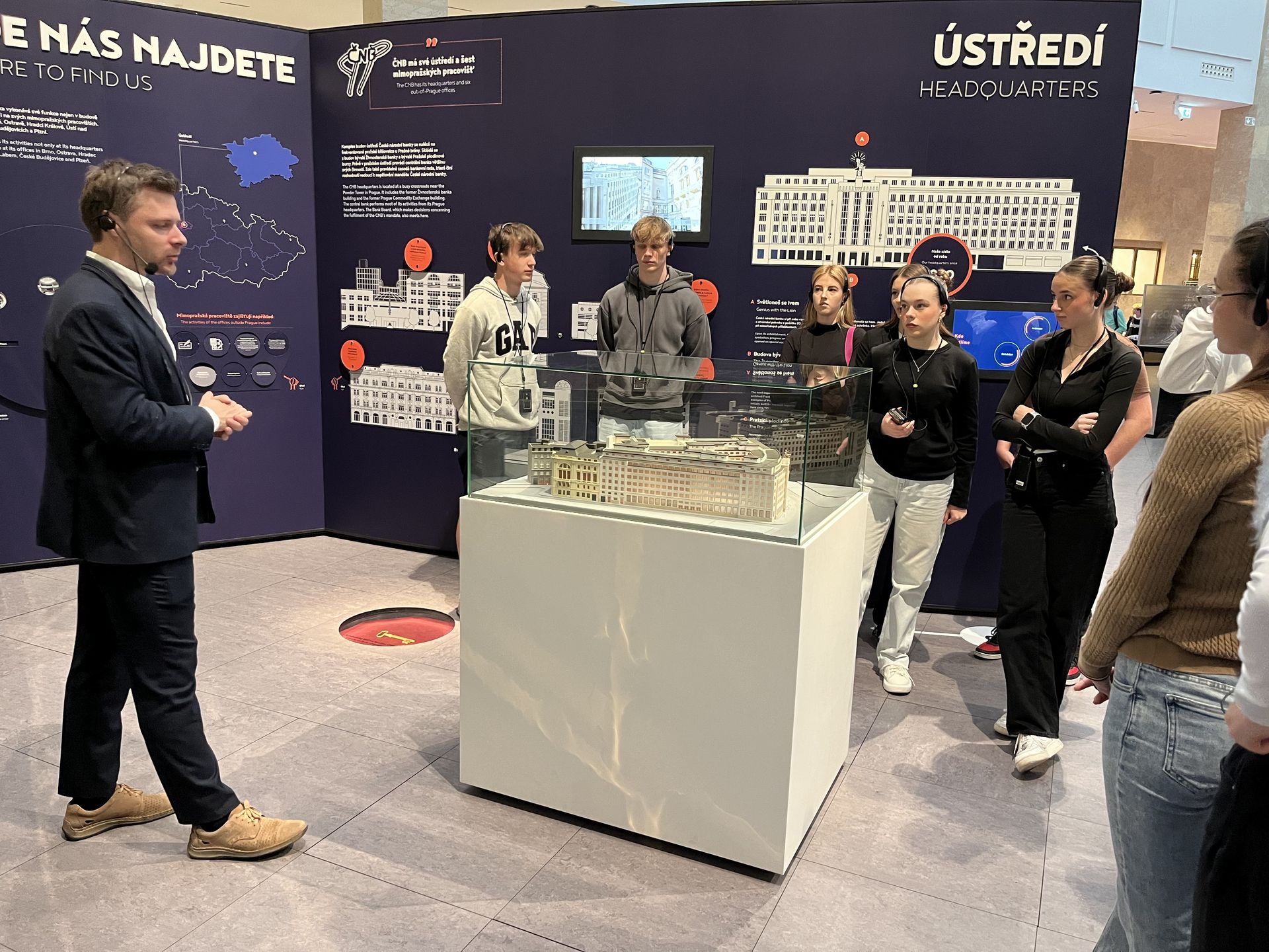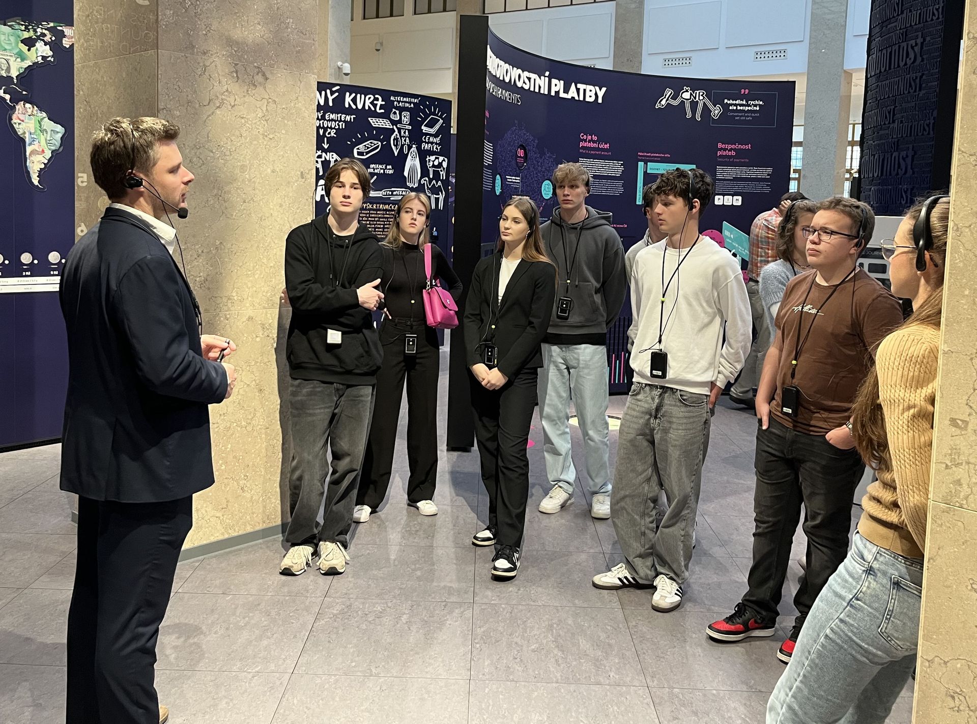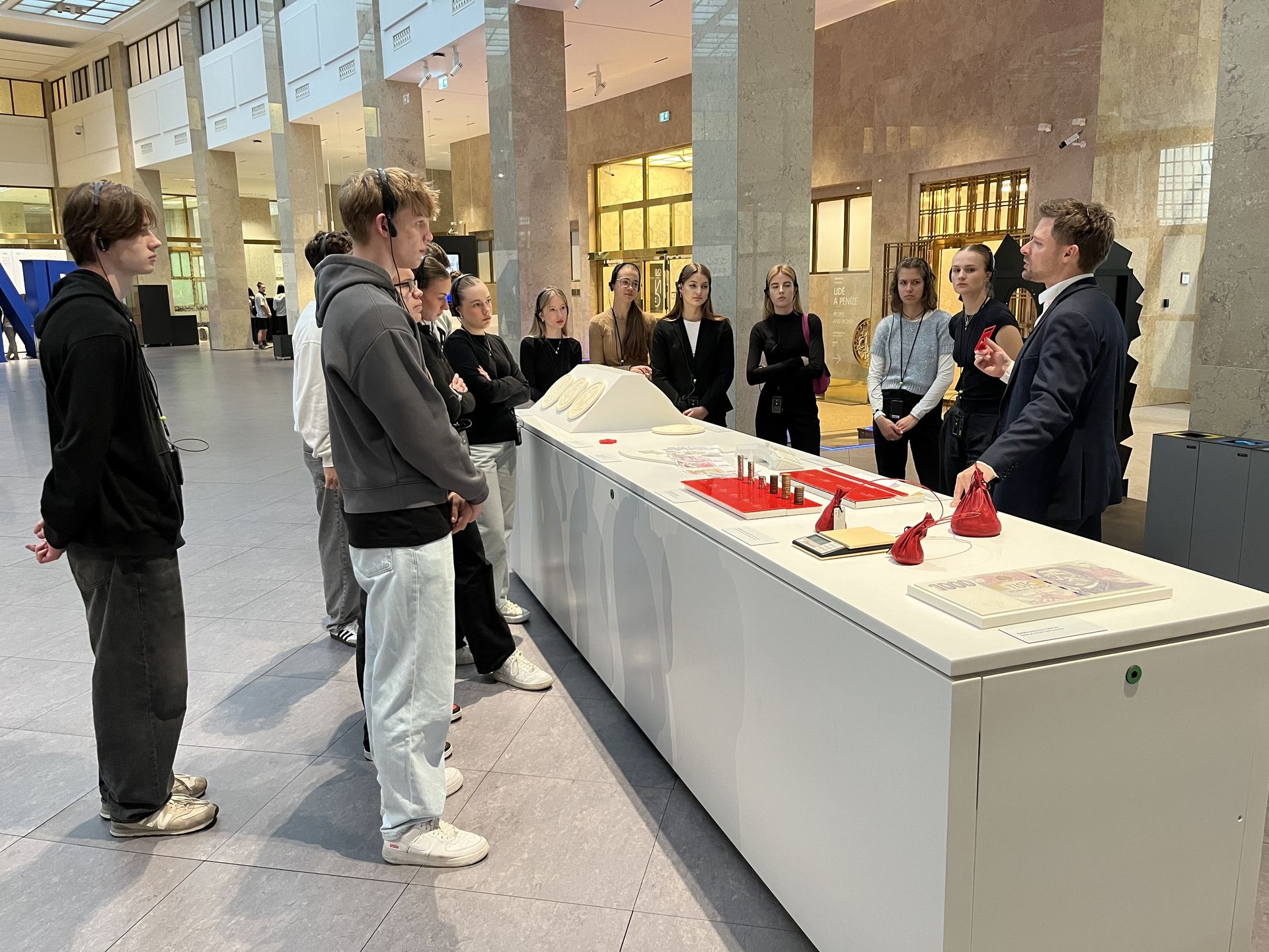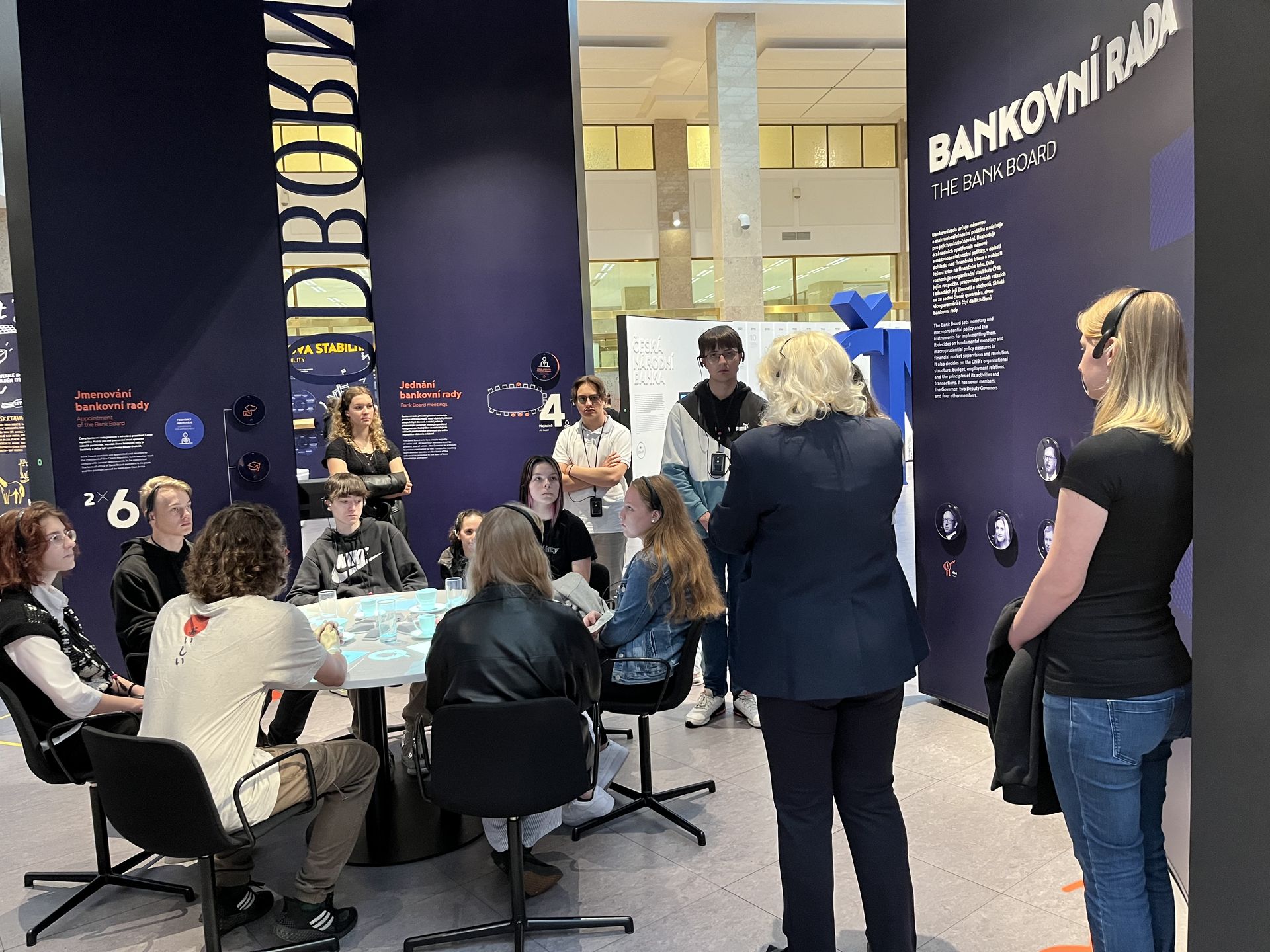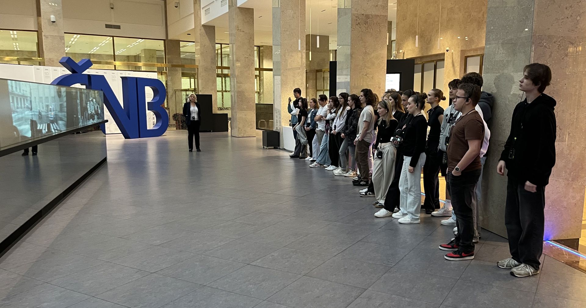 Při návštěvě České národní banky měli studenti možnost seznámit se s významem centrální banky a zjistili, jak ČNB přispívá k udržení cenové stability a podpoře zdravého finančního systému v České republice.