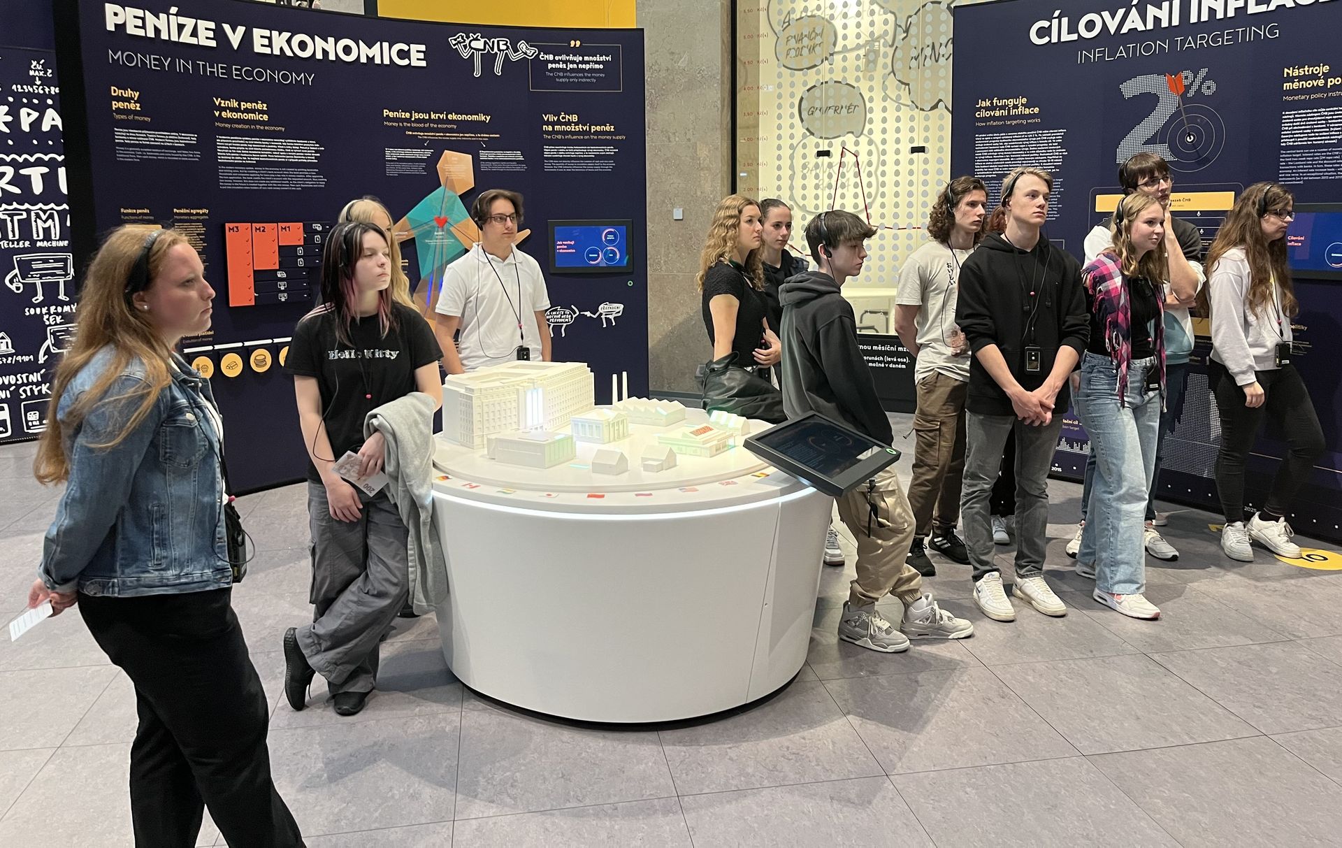 Při návštěvě České národní banky měli studenti možnost seznámit se s významem centrální banky a zjistili, jak ČNB přispívá k udržení cenové stability a podpoře zdravého finančního systému v České republice.