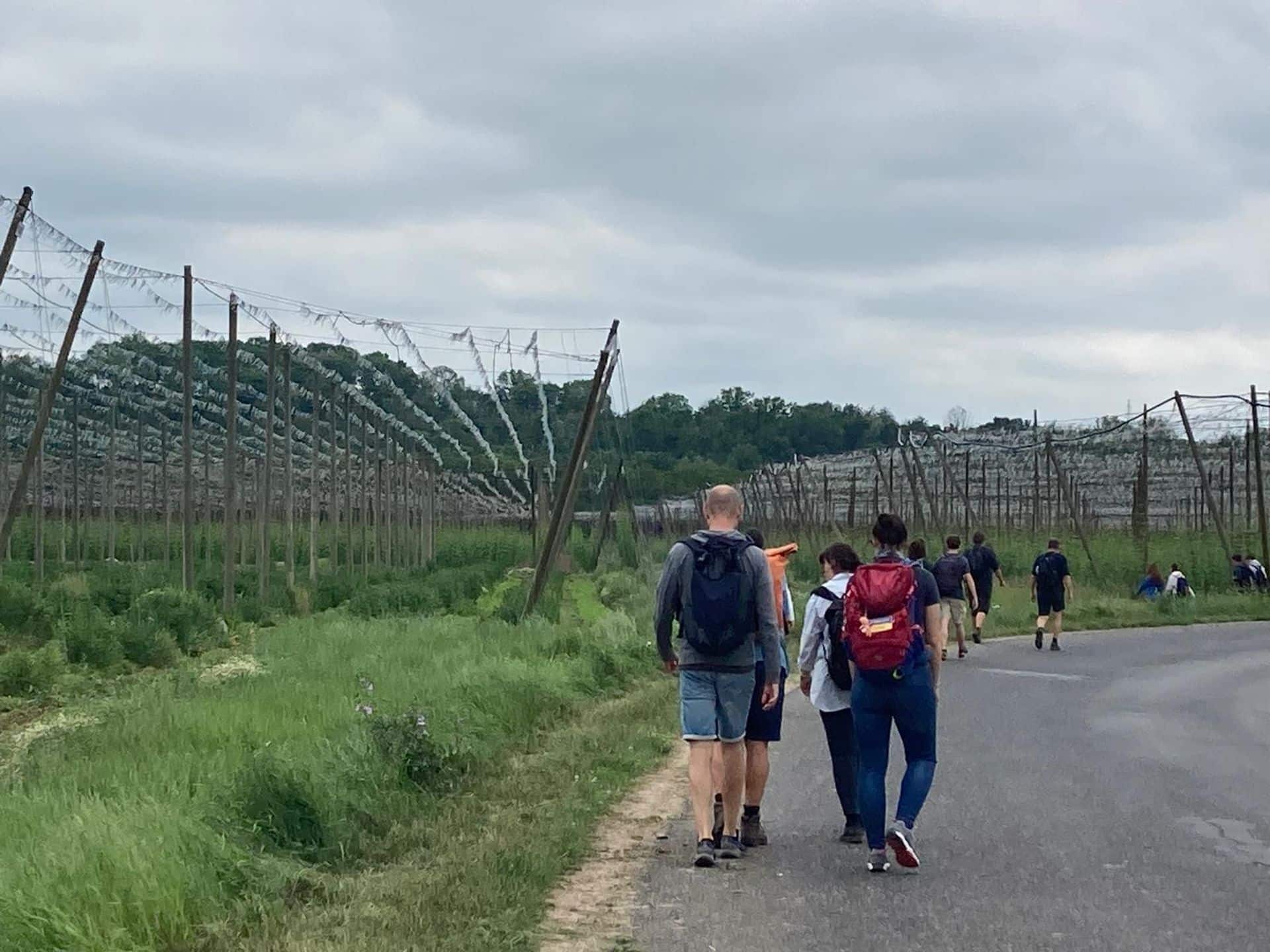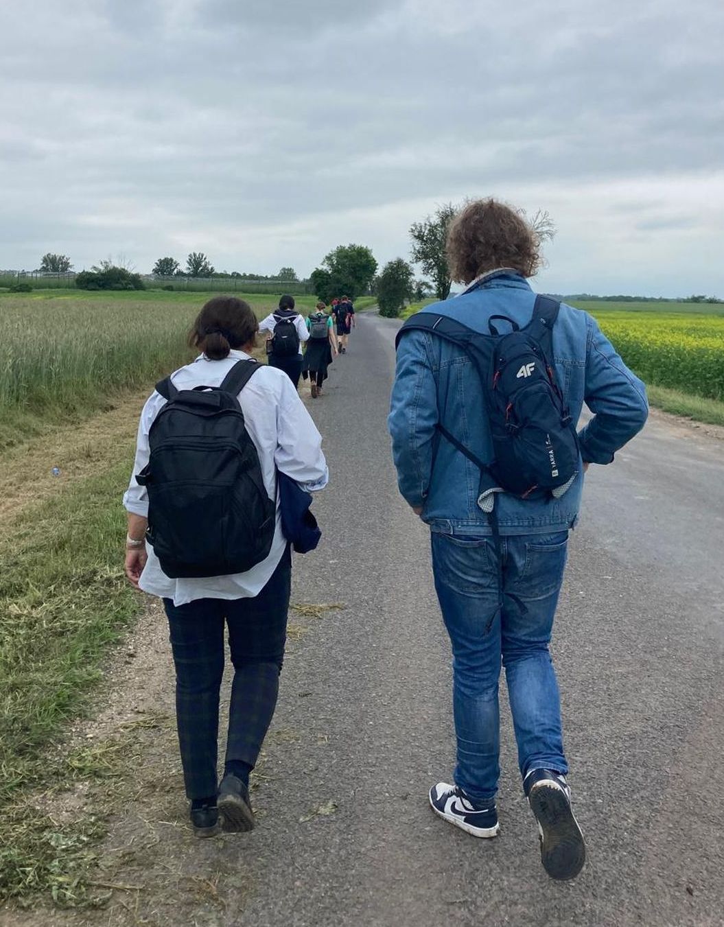 Žatecká krajina patří krátce do UNESCO, šli jsme obklopeni z obou stran chmelnicemi, ve vesnicích nacházeli stopy někdejšího bohatství místních pěstitelů. Většinou šlo o židy, o Němce – 20. století obrátilo vzhůru nohama to, co platilo po staletí. Zastavili jsme se u nedávno instalovaného kříže v levonické bažantnici a na nádvoří zámku ve Stekníku. Po příchodu do Žatce, kdy už jsme v nohách měli přes 18 km, jsme potkali v kapucínské zahradě Jana ze Žatce a míjeli památníky instalované volyňskými Čechy. Náš cíl byl v nově opravených prostorách synagogy a rabinátu, někteří z účastníků zůstali na podvečerní pietní připomínku památky obětí.