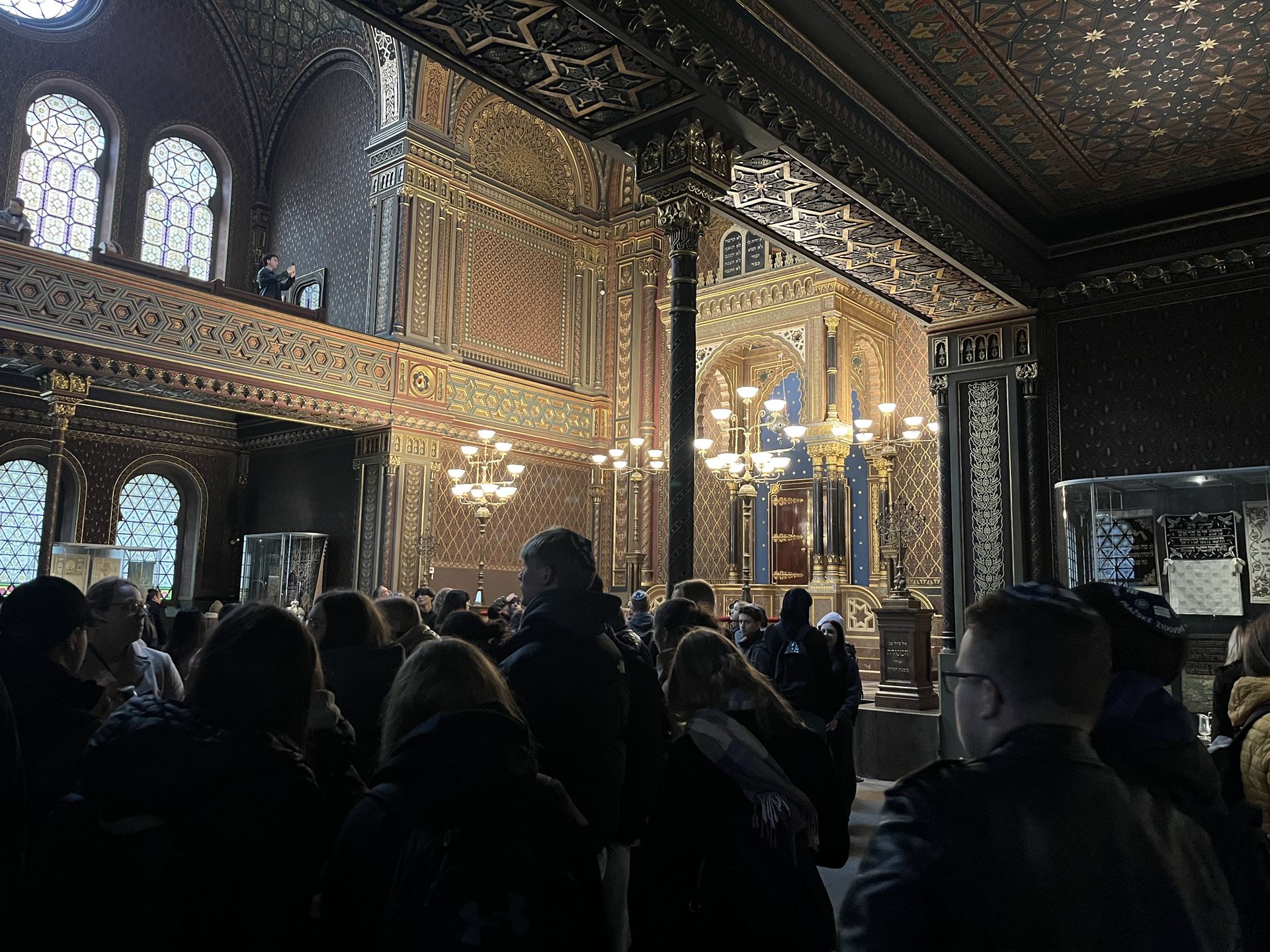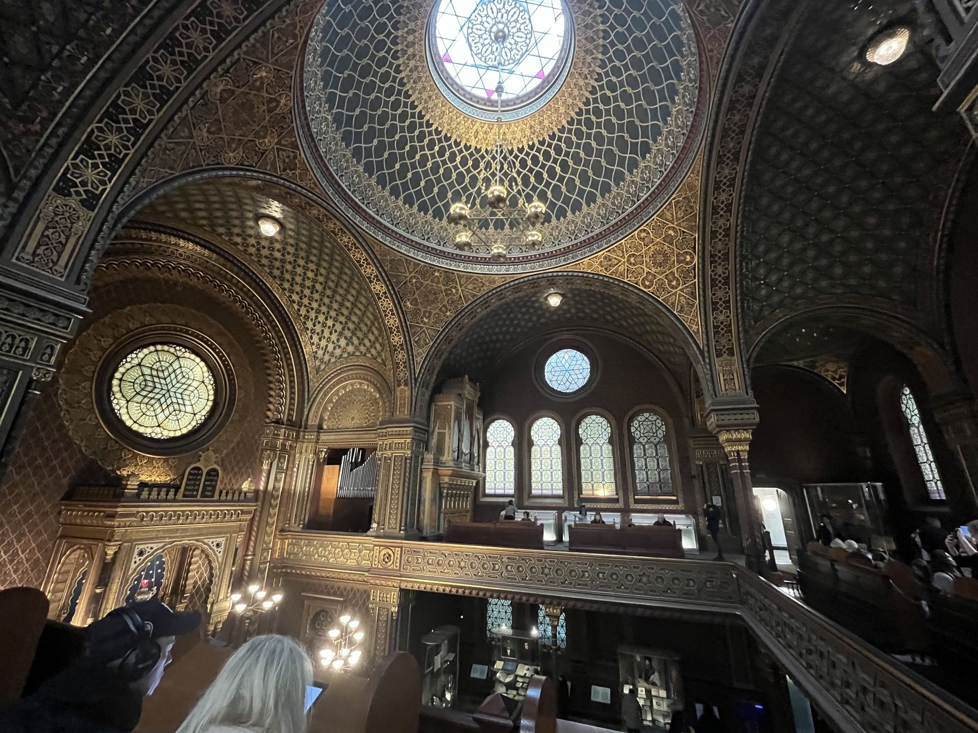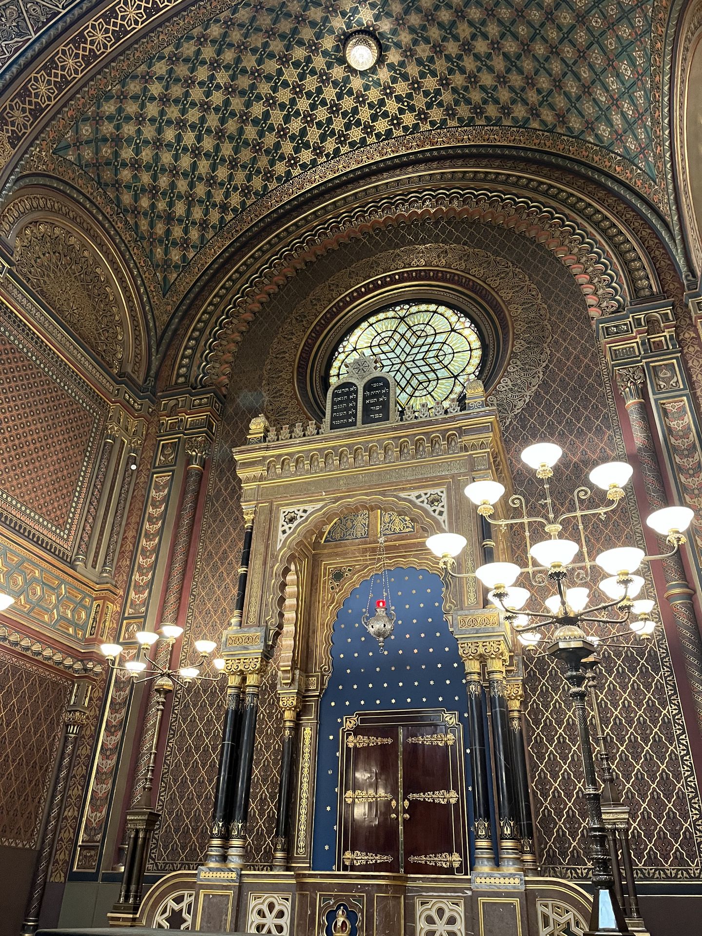 Posledním navštíveným místem byla Španělská synagoga. Zde jsme mohli obdivovat nádherné interiéry a důmyslné zdobení. Mohli jsme také porovnat dvě zcela odlišné synagogy, jak ve zdobnosti, tak v umístění jednotlivých součástí synagogy (lavice, místo pro muže a ženy, místo pro tóru atd.)