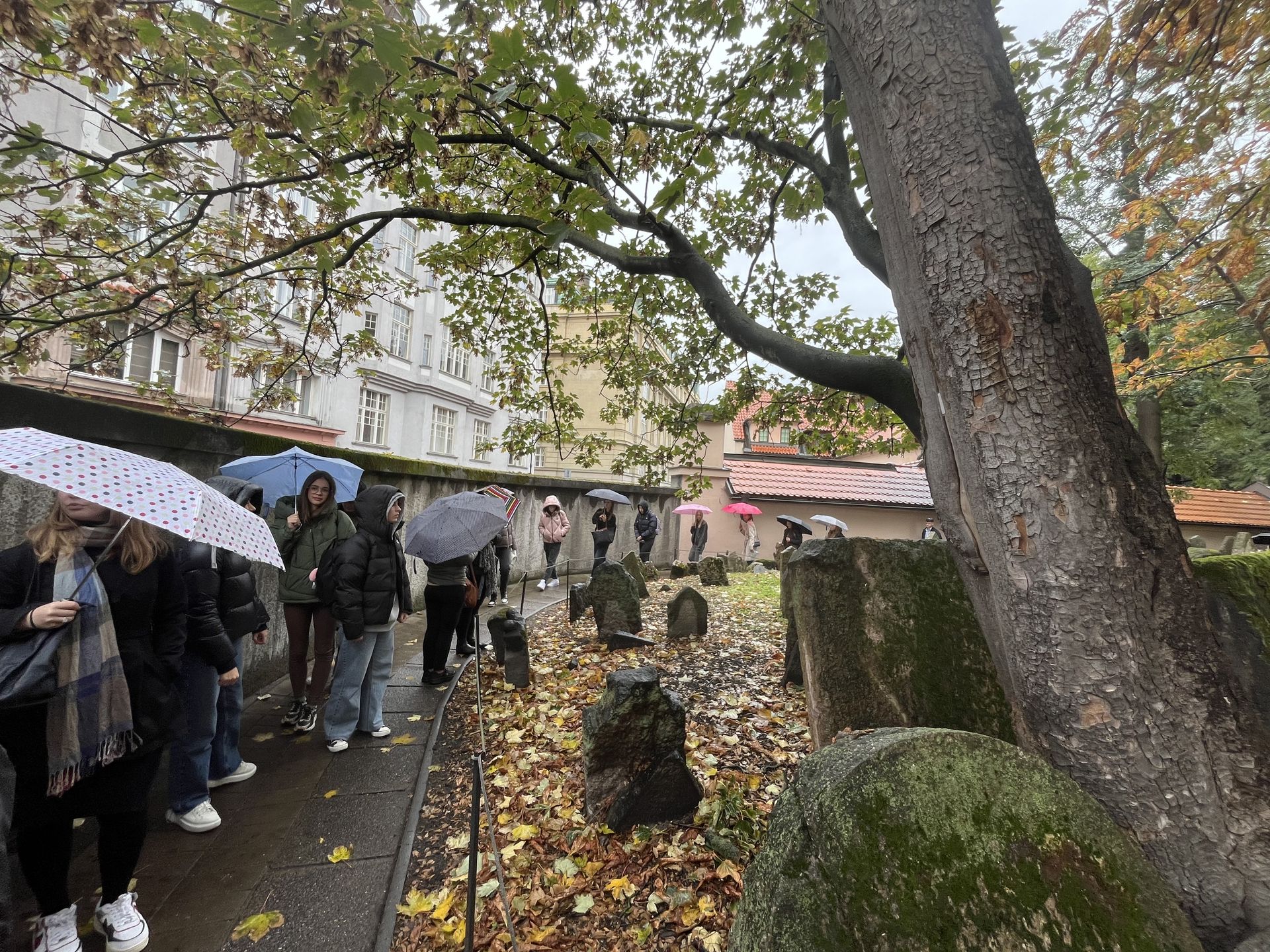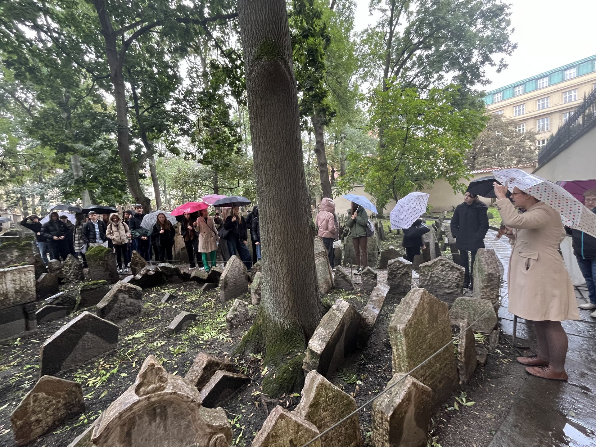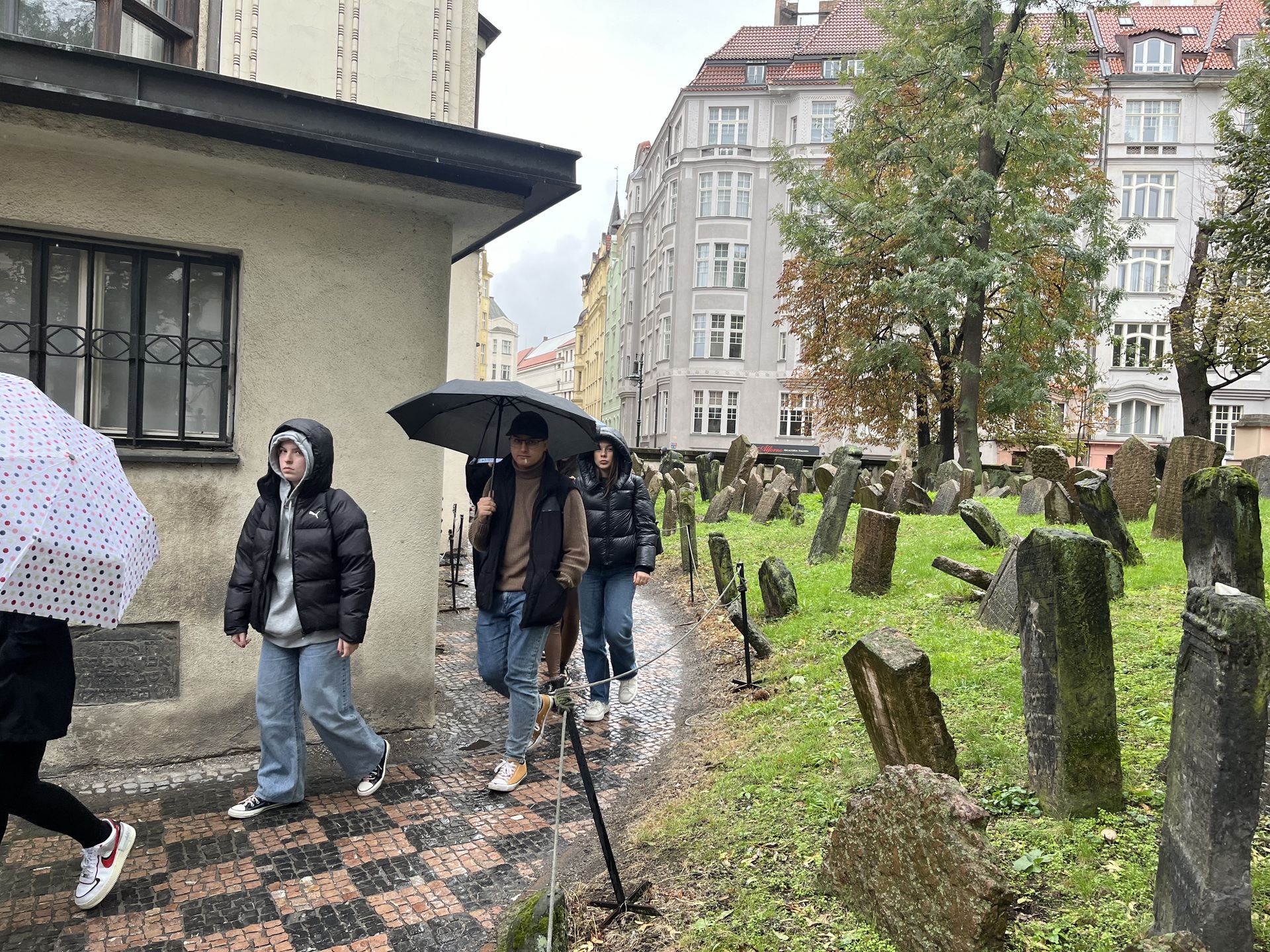 Po přednášce jsme už zamířili na židovský hřbitov. Pánská část zde vyfasovala jarmulky pro zakrytí hlavy. Na hřbitově jsme se dozvěděli další informace o pohřbívání, Pohřebním bratrstvu i o tom, jak pražští Židé vyřešili problém s nedostatkem místa pro pohřbívání svých blízkých. Také jsme se naučili číst židovské náhrobky podle symbolů, které obsahují. Před opuštěním hřbitova si většina studentů nezapomněla třikrát omýt ruce, aby si sebou neodnesli nějakou tu zbloudilou duši.