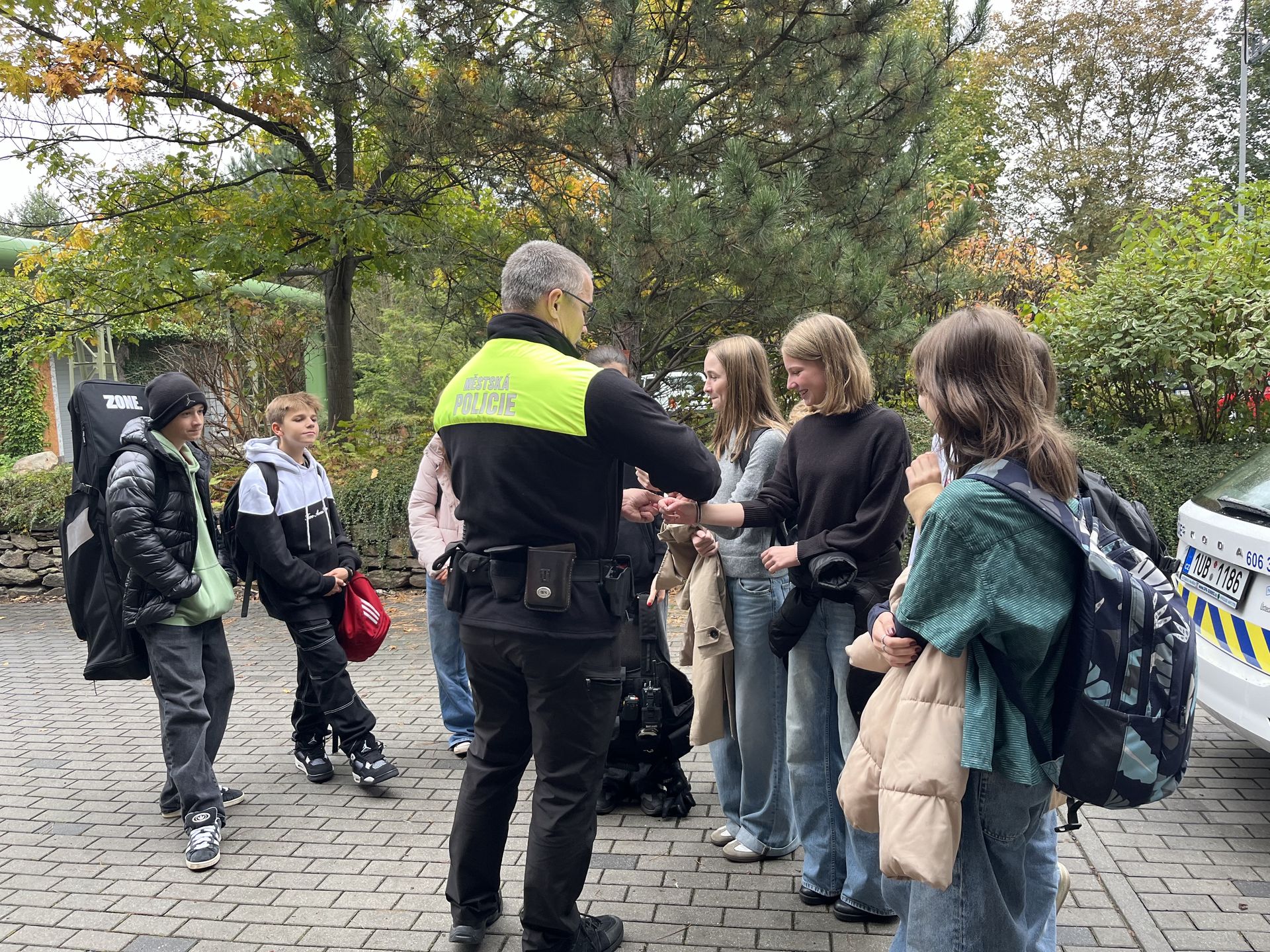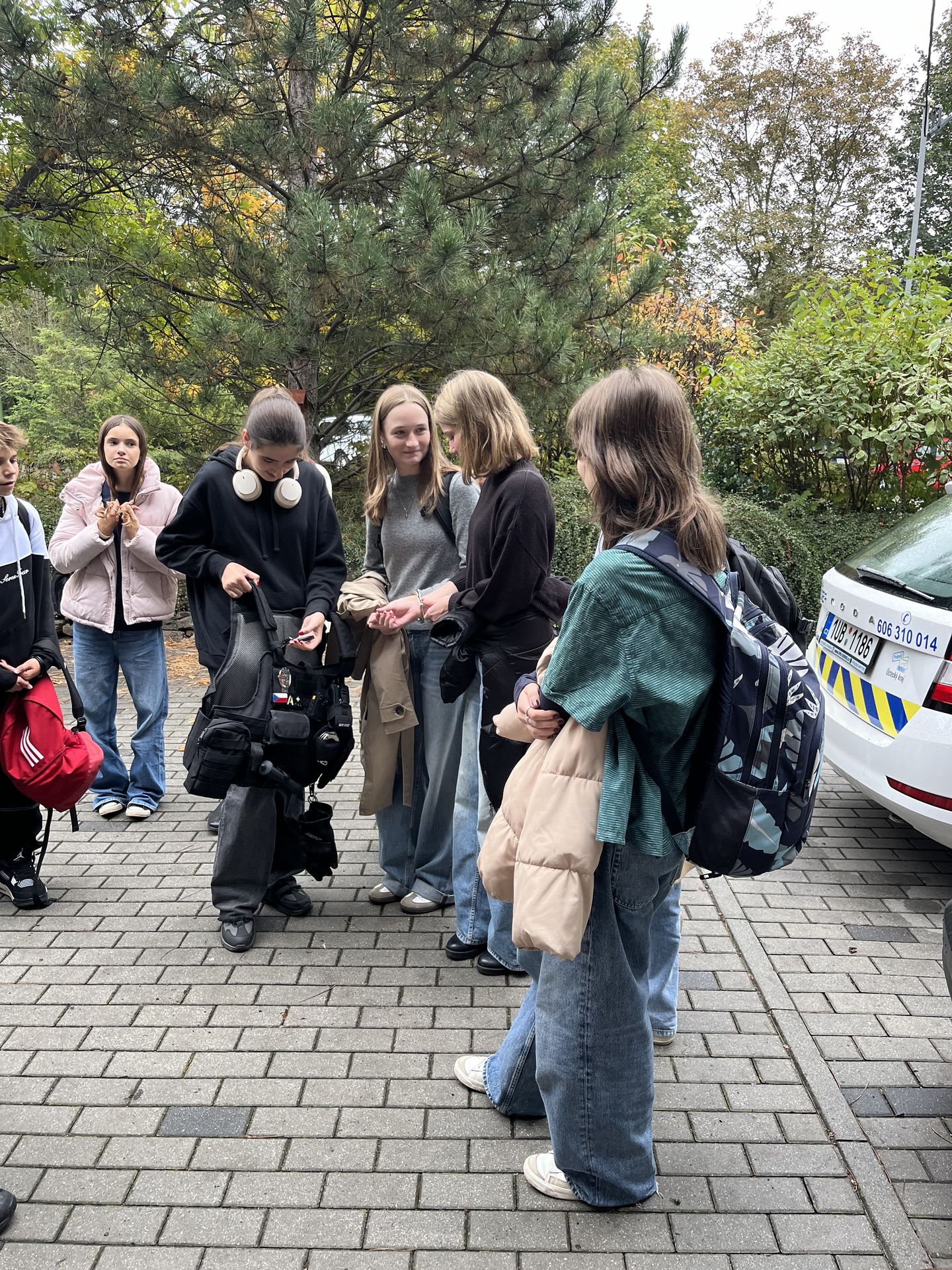 Policisté také se studenty diskutovali o použití zádržných zařízení a dalších donucovacích prostředků. Vysvětlili, že i když je použití těchto nástrojů obvykle poslední možností, je nezbytné pro zajištění bezpečnosti policistů i občanů během potenciálně nebezpečných setkání. Někteří studenti si nechali nasadit pouta, takže zjistili, že opravdu není jednoduché se z nich dostat. Prohlédli jsme si také odchytovou hůl na psy, slzný sprej nebo obušek.