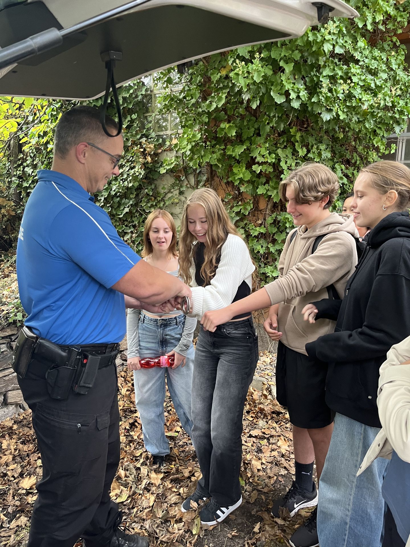 Policisté také se studenty diskutovali o použití zádržných zařízení a dalších donucovacích prostředků. Vysvětlili, že i když je použití těchto nástrojů obvykle poslední možností, je nezbytné pro zajištění bezpečnosti policistů i občanů během potenciálně nebezpečných setkání. Někteří studenti si nechali nasadit pouta, takže zjistili, že opravdu není jednoduché se z nich dostat. Prohlédli jsme si také odchytovou hůl na psy, slzný sprej nebo obušek.