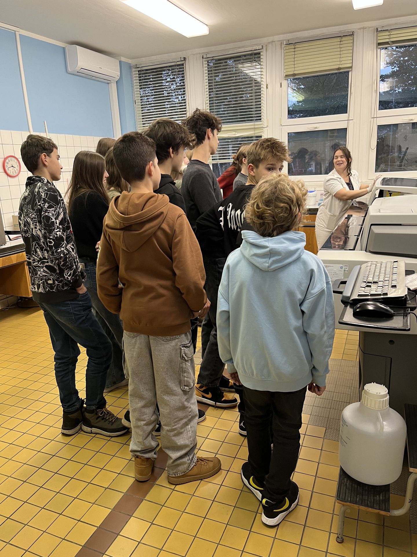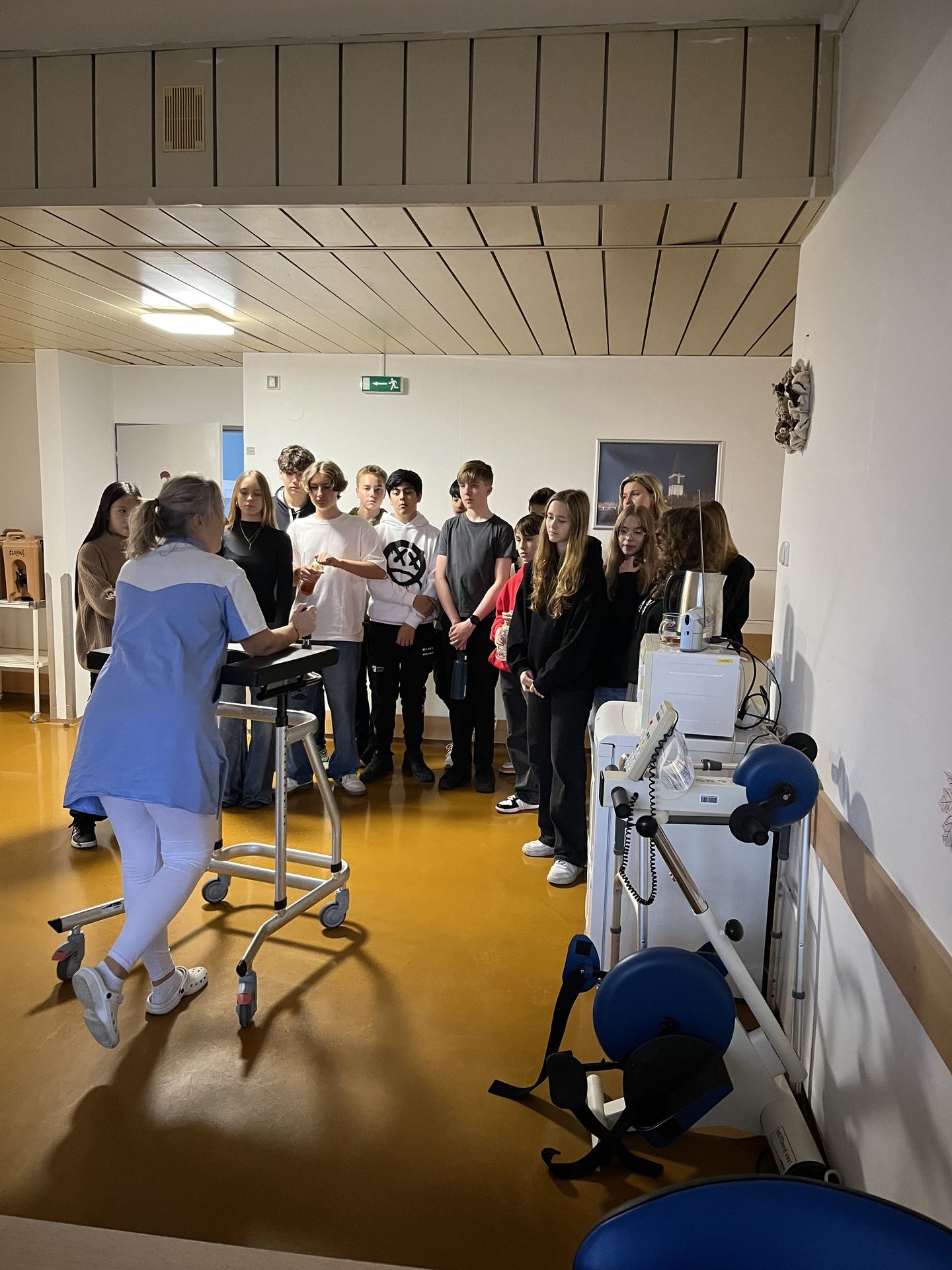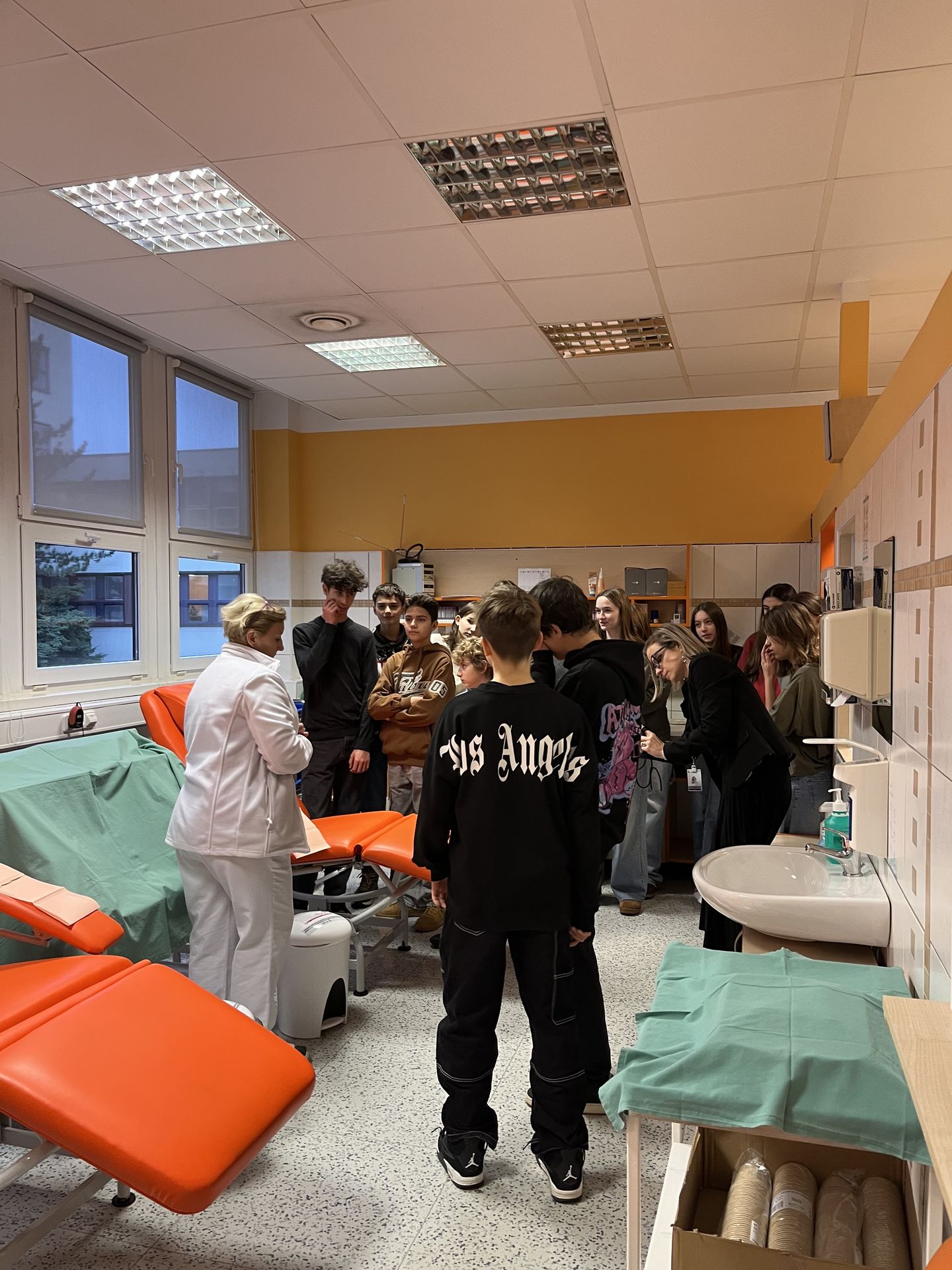 Protože je nemocnice veliká a my máme pouze omezený čas, představila se nám tři vybraná oddělení. Prvním bylo oddělení následné komplexní péče, kde se starají o pacienty po úrazech nebo třeba po mrtvicích. Součástí oddělení je rehabilitace, pomocí které se snaží pacienty rozhýbat. Pověděli jsme si, co to vůbec mrtvice je, jak ji poznáme a koho nejčastěji postihuje. Ukázali jsme si i různé kompenzační pomůcky pro pacienty. Po všetečných otázkách jsme se přesunuli do dalšího oddělení. Tím bylo transfúzní centrum. Odnášíme si spoustu nových informací, jak probíhají odběry krve a plazmy od dárců, co vše vůbec můžeme darovat, co se děje s krví po darovaní, jak se krev zpracovává a kdy je jí potřeba. Dostalo se nám i mnoha technických údajů o přístrojích i o krvi samotné.