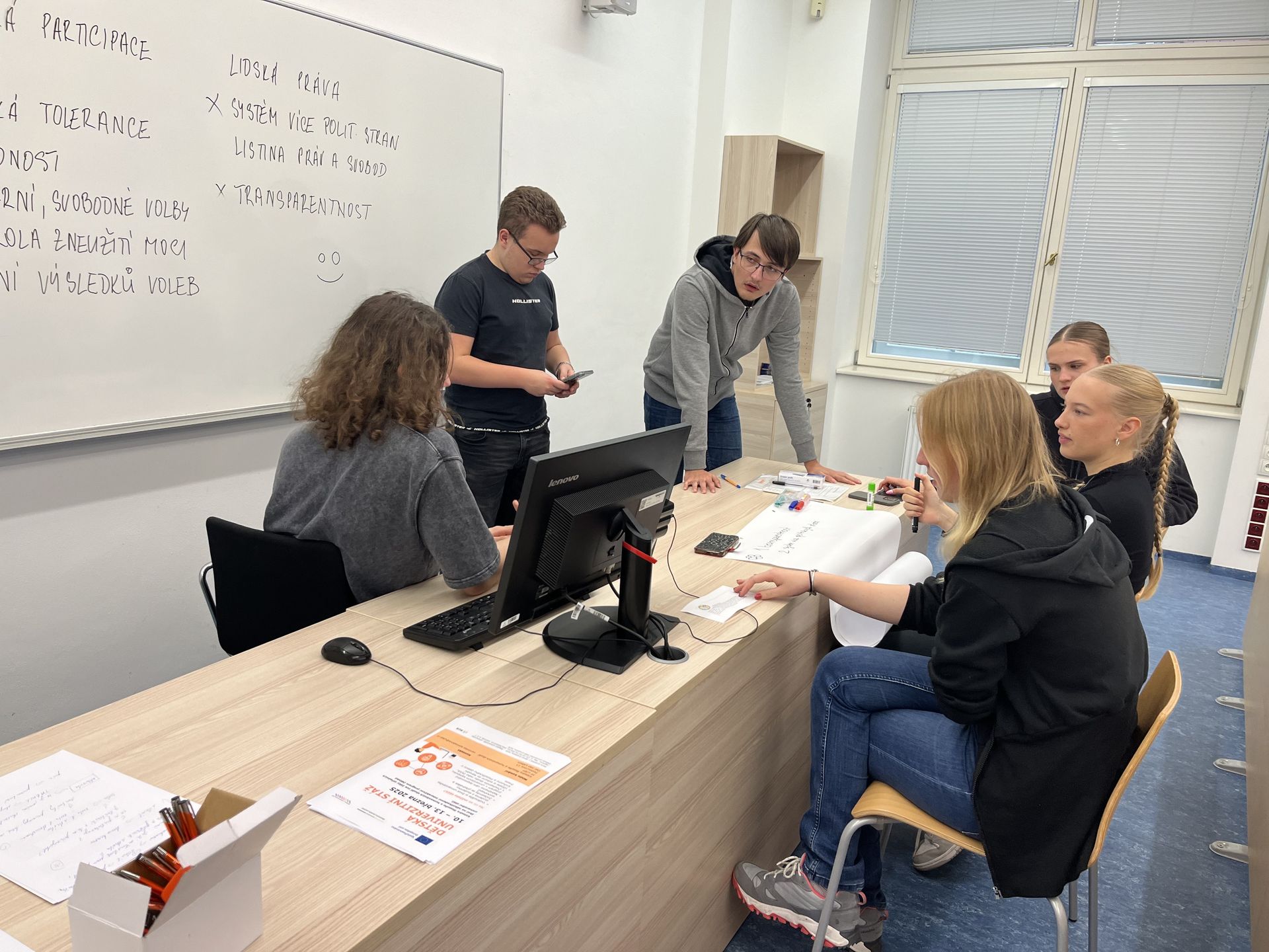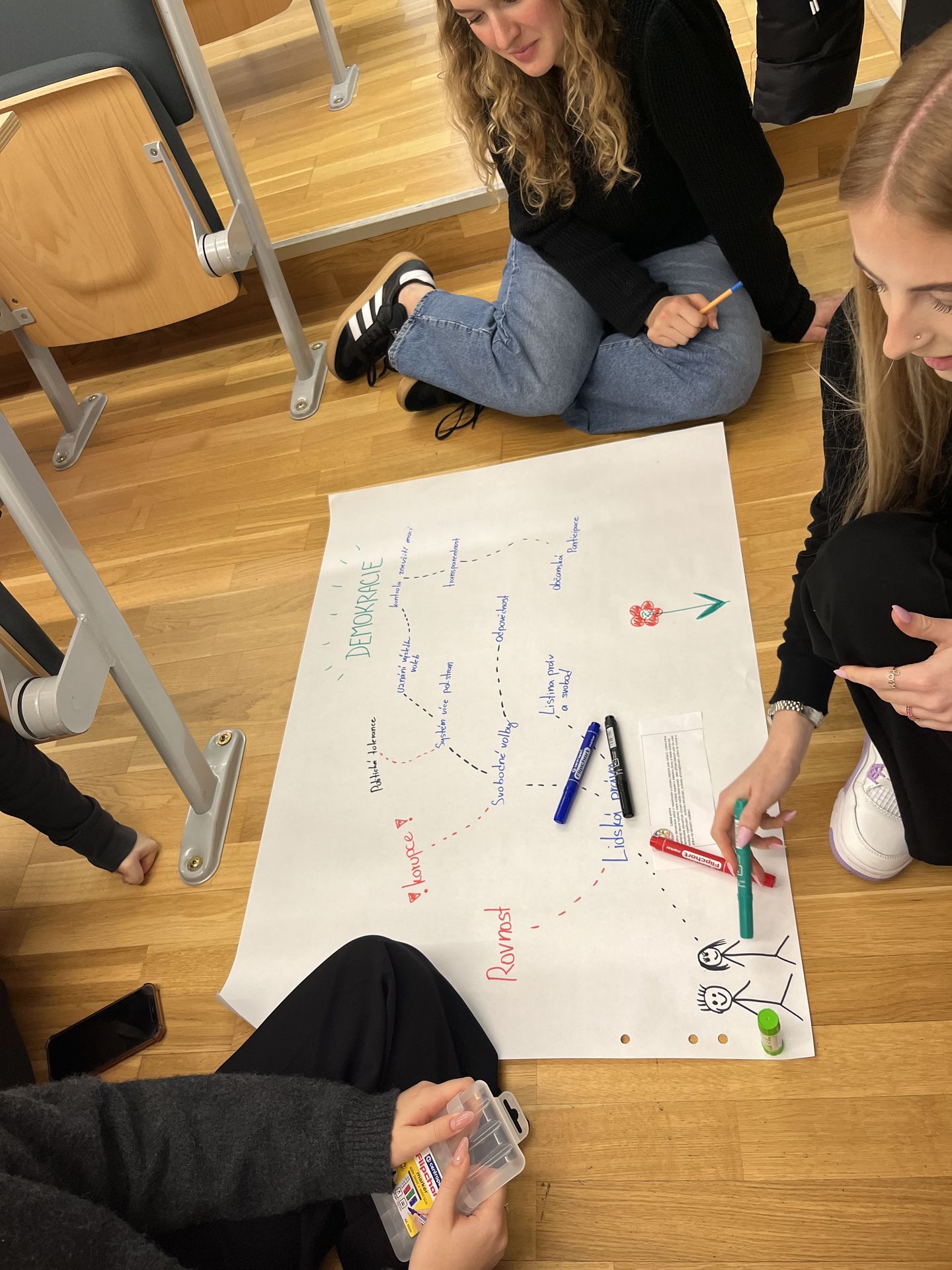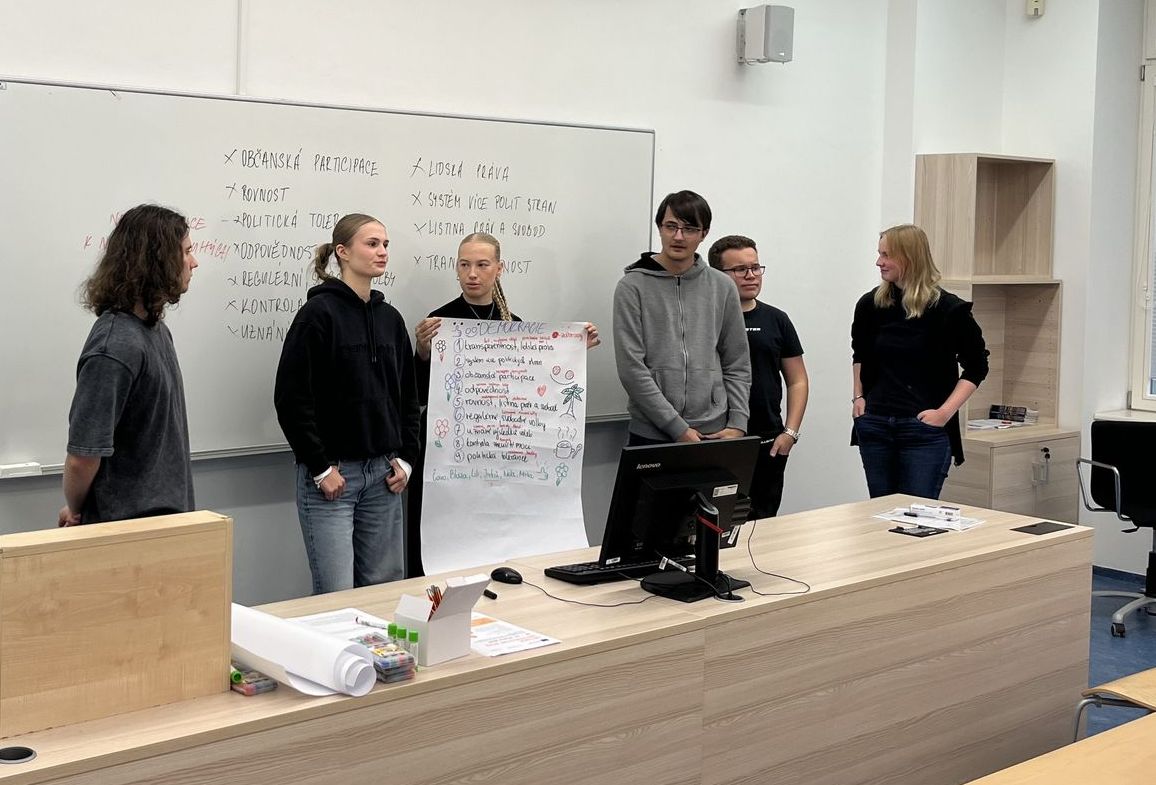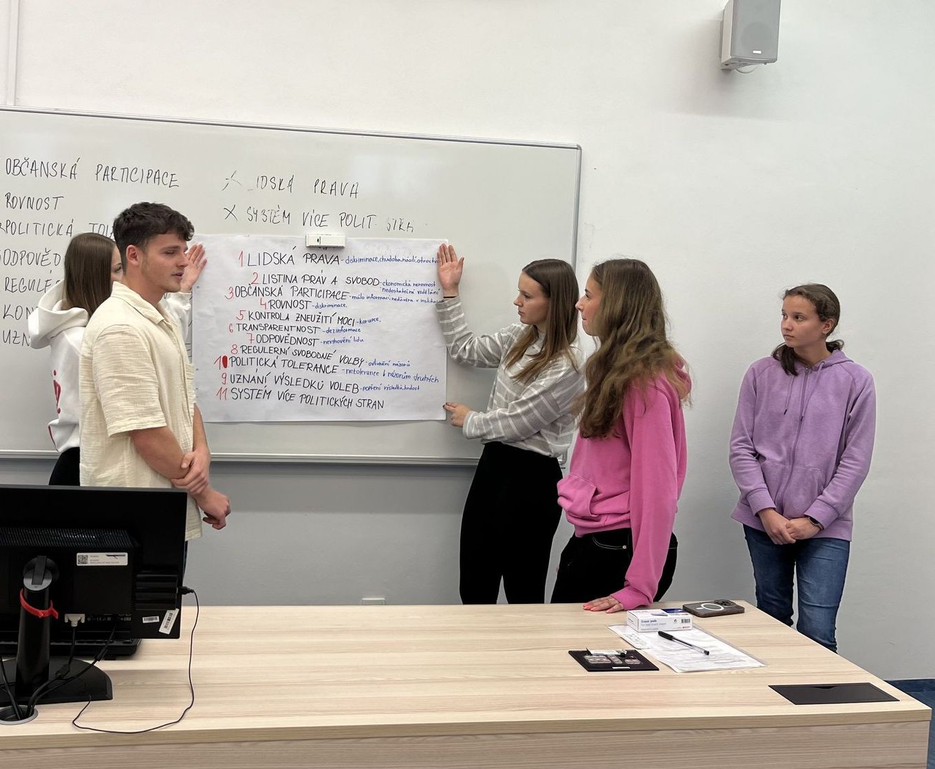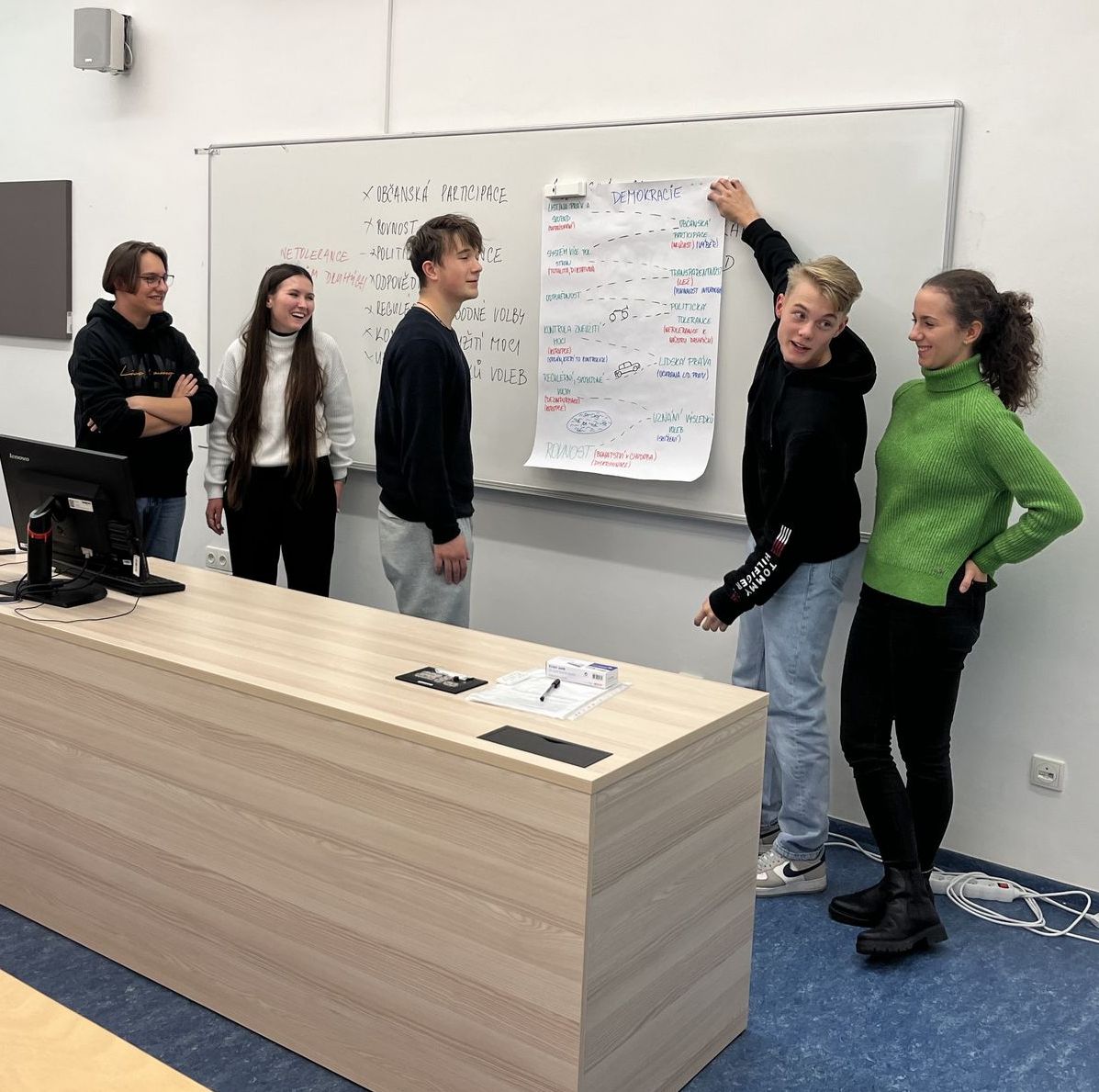 Mimo prohlídku kampusu nás čekala také ochutnávka aktivity z jarní stáže pro zatím nestudenty. Zabývali jsme se demokracií a jejím pojetí. Studenti pracovali ve skupinách a své práce také prezentovali před ostatními. Musím říct, že jsem s jejich zapojením a řešením zadaného úkolu byla nesmírně spokojená. Každá skupina pojala svou práci maličko jinak, přesto ve všech skupinách probíhala plodná diskuse a všechny skupiny dokázaly své názory obhájit.