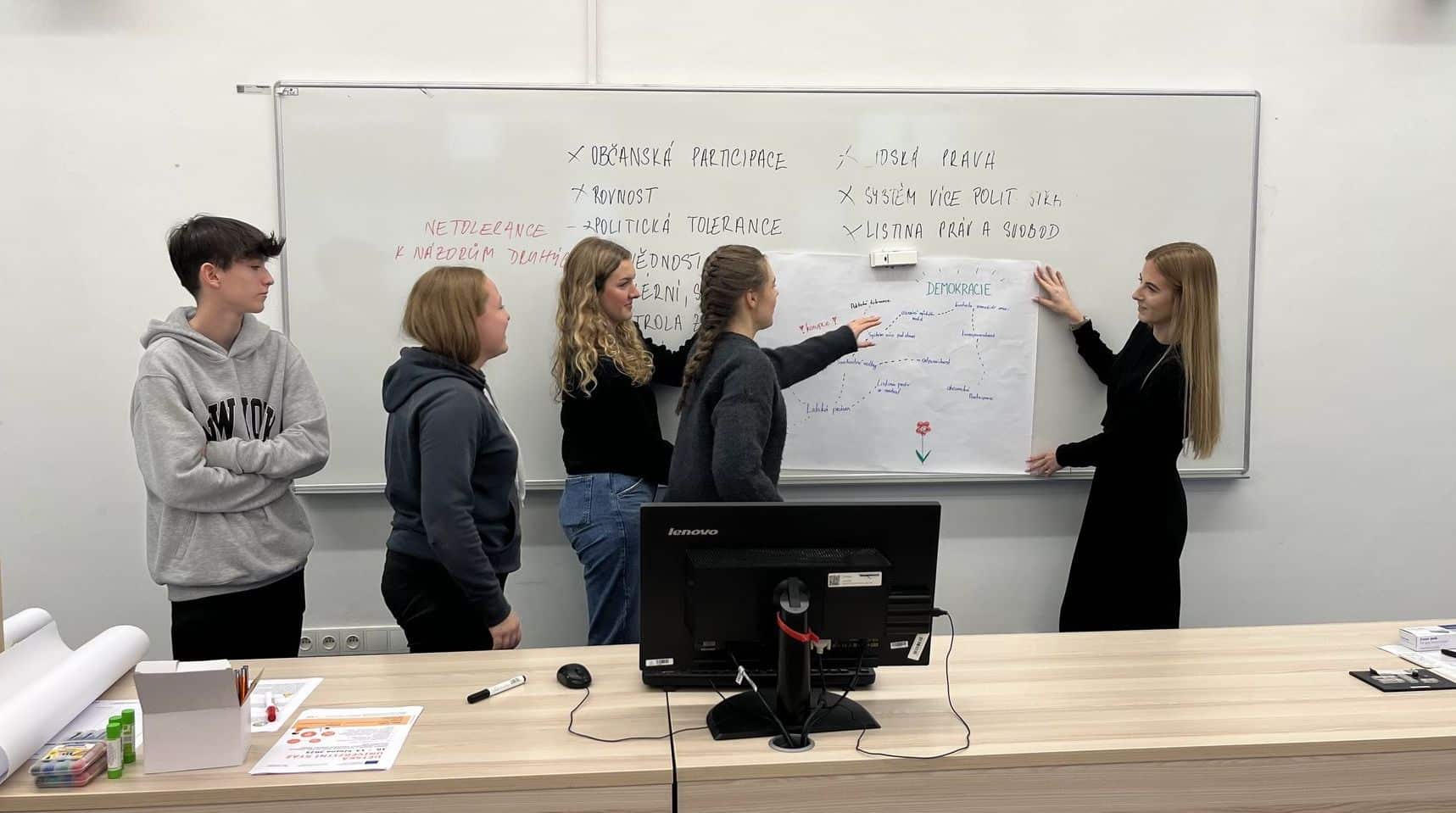 Mimo prohlídku kampusu nás čekala také ochutnávka aktivity z jarní stáže pro zatím nestudenty. Zabývali jsme se demokracií a jejím pojetí. Studenti pracovali ve skupinách a své práce také prezentovali před ostatními. Musím říct, že jsem s jejich zapojením a řešením zadaného úkolu byla nesmírně spokojená. Každá skupina pojala svou práci maličko jinak, přesto ve všech skupinách probíhala plodná diskuse a všechny skupiny dokázaly své názory obhájit.
