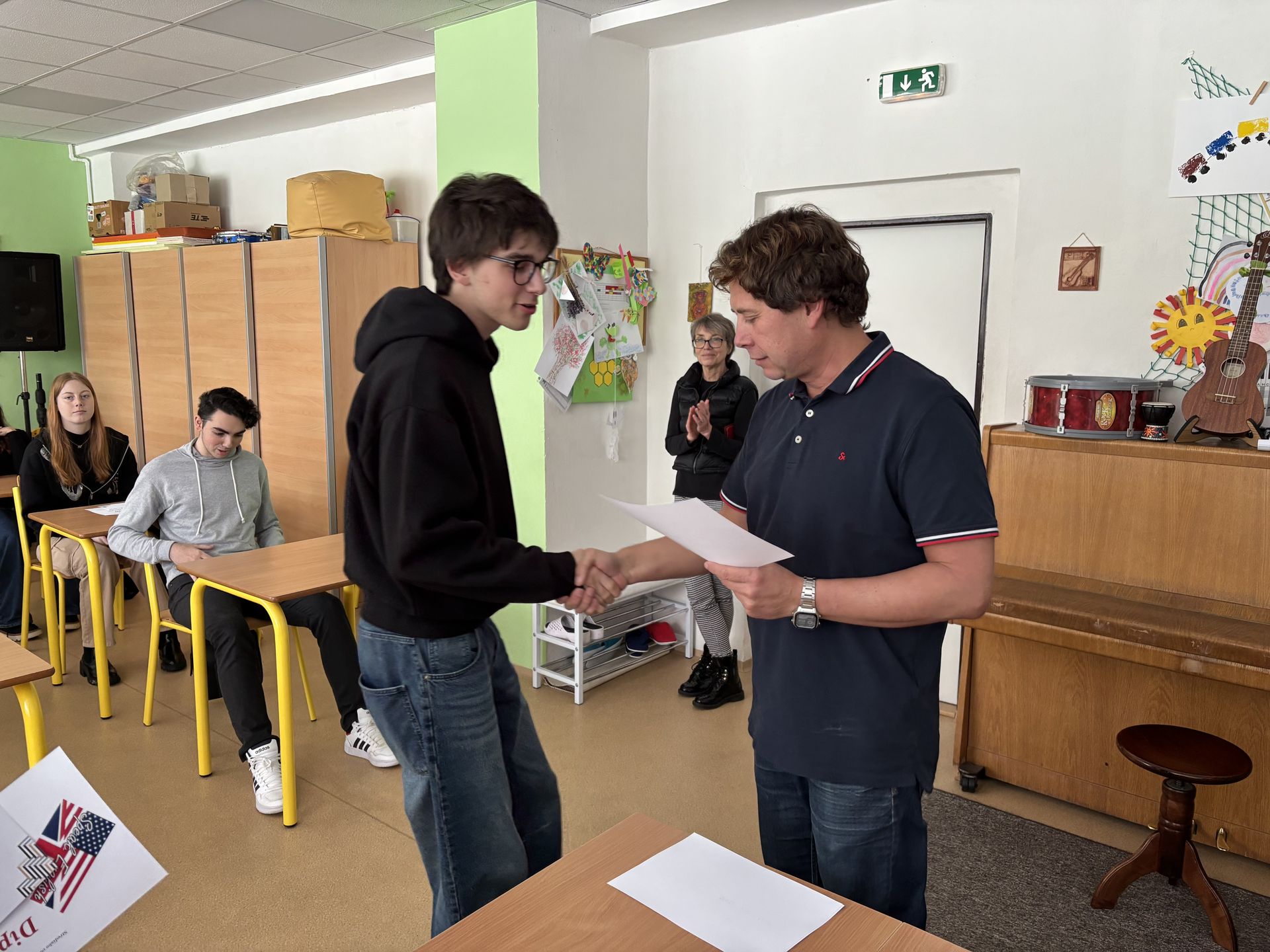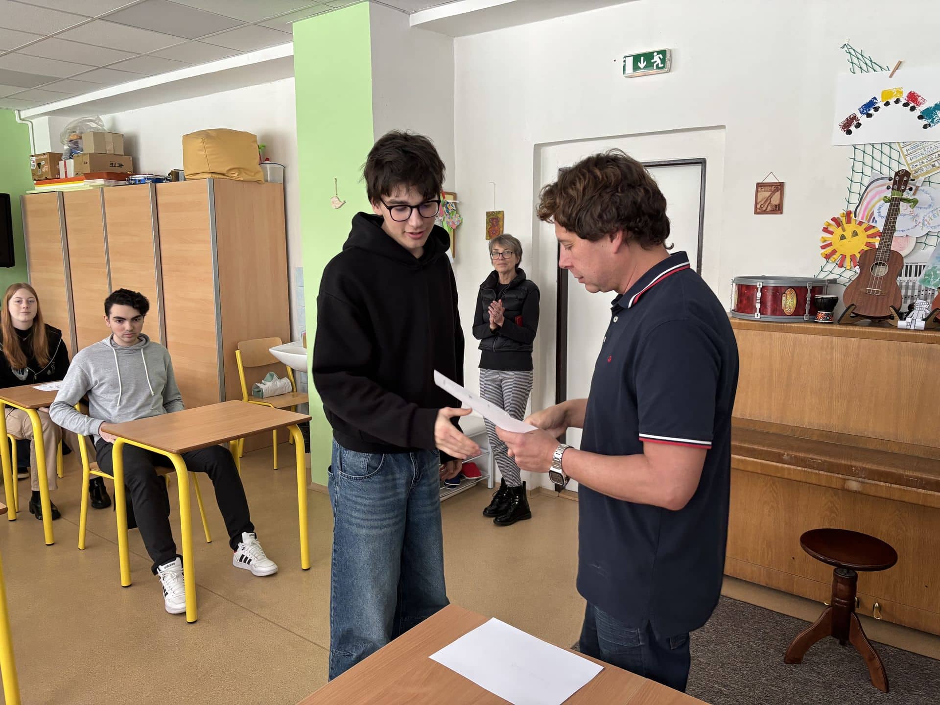 Na svatého Valentýna si naši dva studenti Štěpán Langer ze 7. O a Jan Točík ze 6. O zajeli do Chomutova zasoutěžit v okresním kole olympiády v anglickém jazyce. Po úspěšném zvládnutí písemné části prokázali v ústním kole jazykovou vybavenost, přehled a pohotovost, když reagovali na témata jako jsou přírodní živly, tlak vrstevníků, cenzura, migrace, cestování. Štěpán obsadil 3. místo a Honza 5. místo.