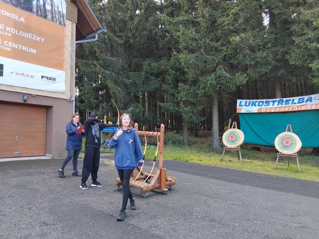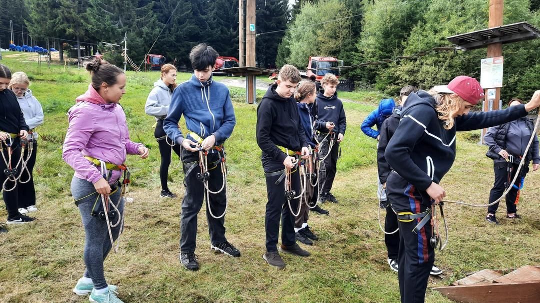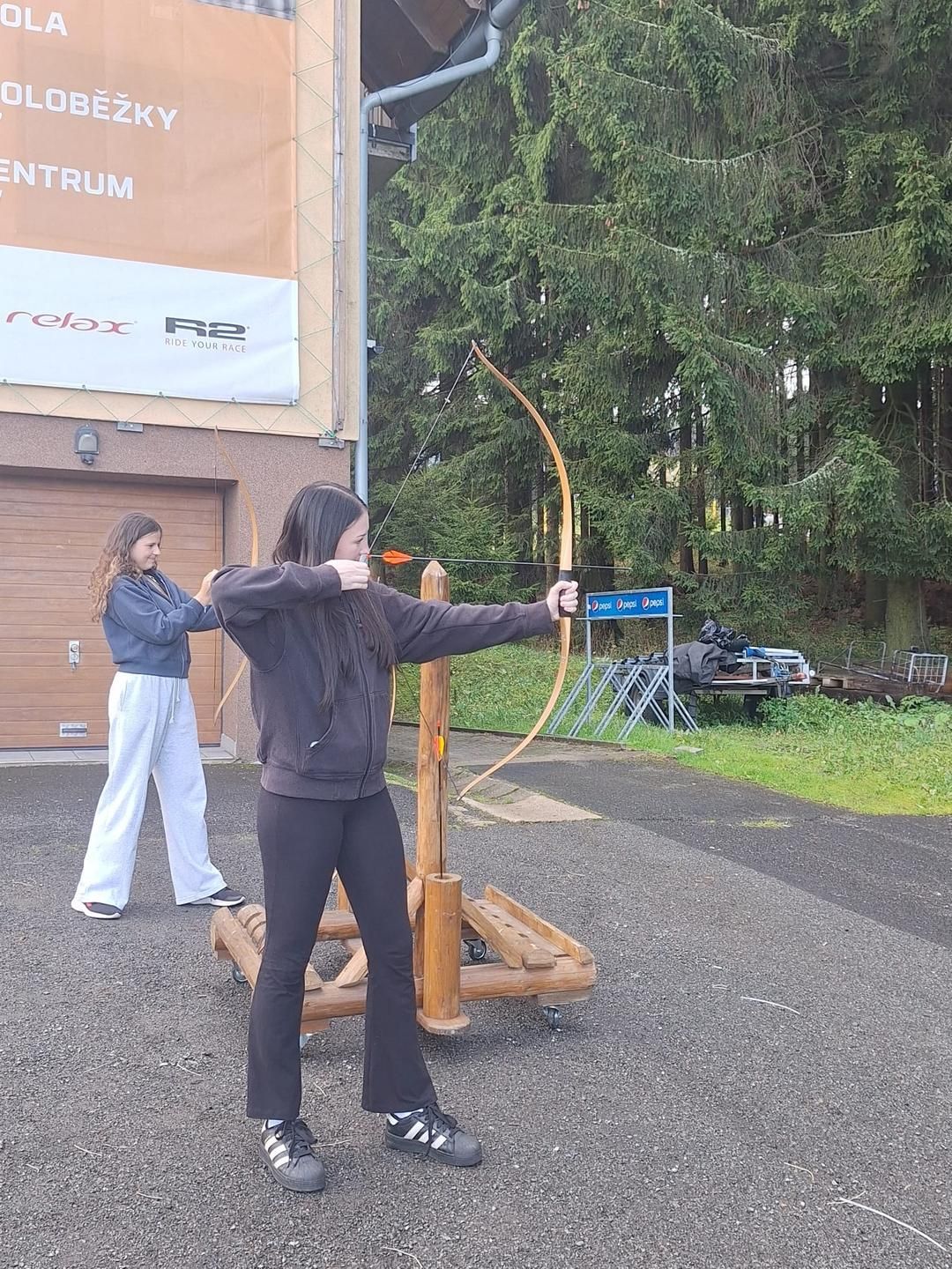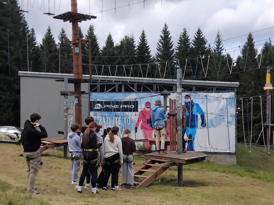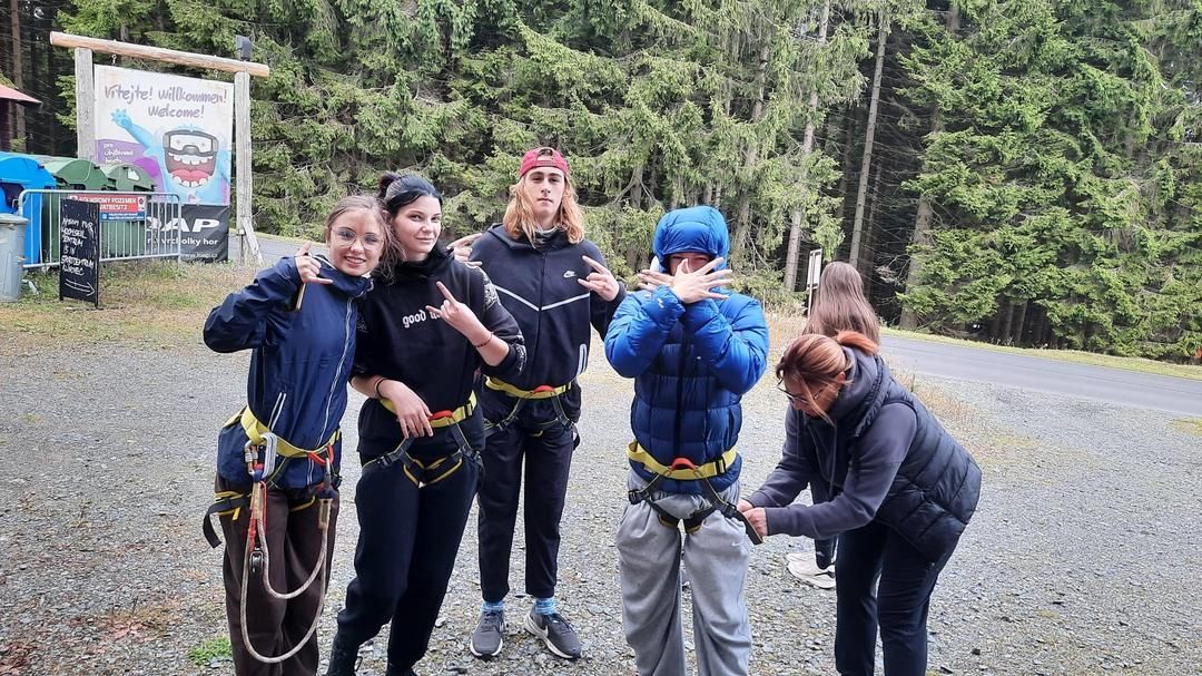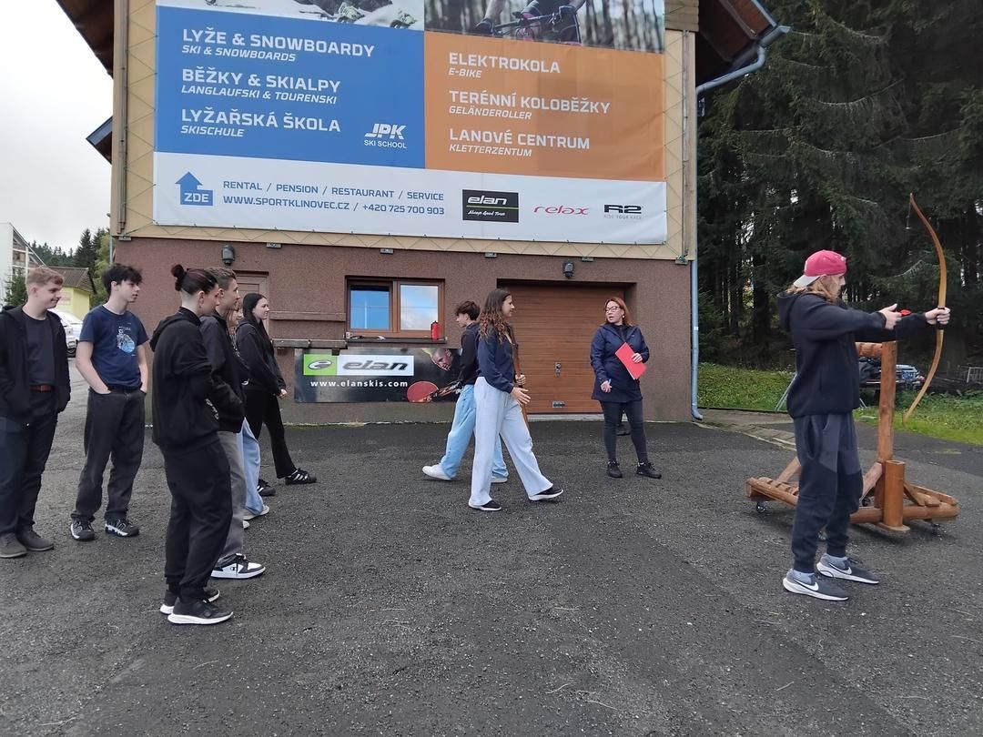 Ve dnech 15. 9.-17. 9. se třída 5. O zúčastnila adaptačního pobytu na Klínovci. Cílem bylo propojit stávající studenty s nově příchozími a poznat se navzájem v zápalu sportovních dobrodružství. První den dopoledne nás déšť zavřel v budově , ale využili jsme tenhle čas k hrám a třídním aktivitám. Odpoledne jsme si vyzkoušeli lukostřelbu, kde některé slečny předvedly talent hodný Amazonek, a v lese jsme si zahráli discgolf, který nás nadchl a skvěle pobavil. K večeru jsme si zašli koupit nějaké dobroty do Loučné pod Klínovcem a den jsme pak zakončili třídními hrami. Druhý den jsme si pořádně mákli na koloběžkách a lanovém centru, všichni do toho šli naplno, někteří dokonce překonávali svoje hranice. Většina si pak ještě užila řádění na trampolínách… Na podvečer dostali studenti speciální úkol – po večeři pobavit paní učitelky… Celá třída se úkolu zhostila na jedničku a nachystala neuvěřitelně zábavnou „genderově obrácenou“ módní přehlídku, zakončenou super skvělým pěveckým výkonem… Na závěr jsme si společně upletli síť podpory a shodli jsme se na tom, že jsme si adaptační pobyt všichni moc užili a cíl se nám podařilo na dvě stě procent naplnit…