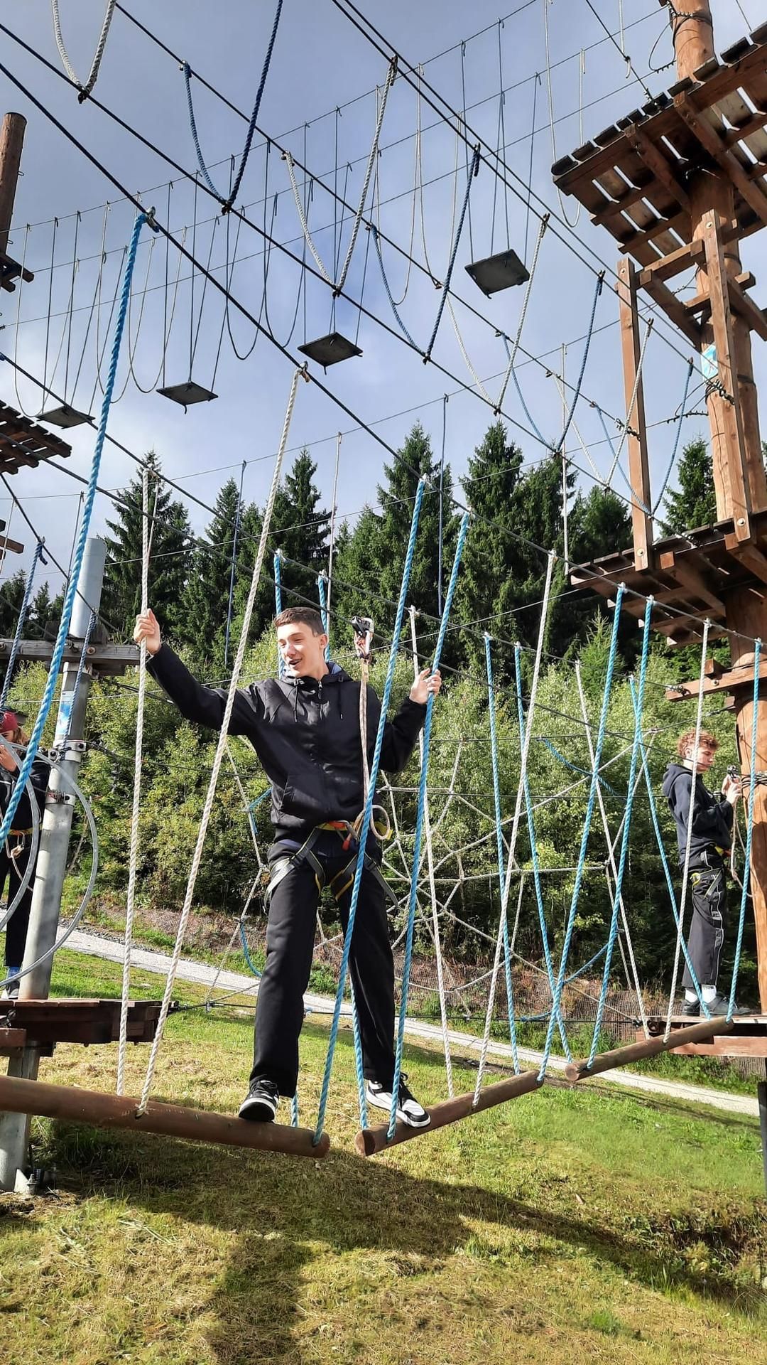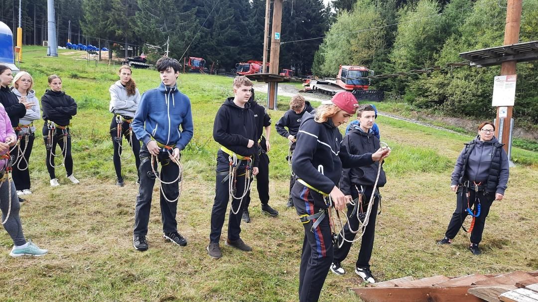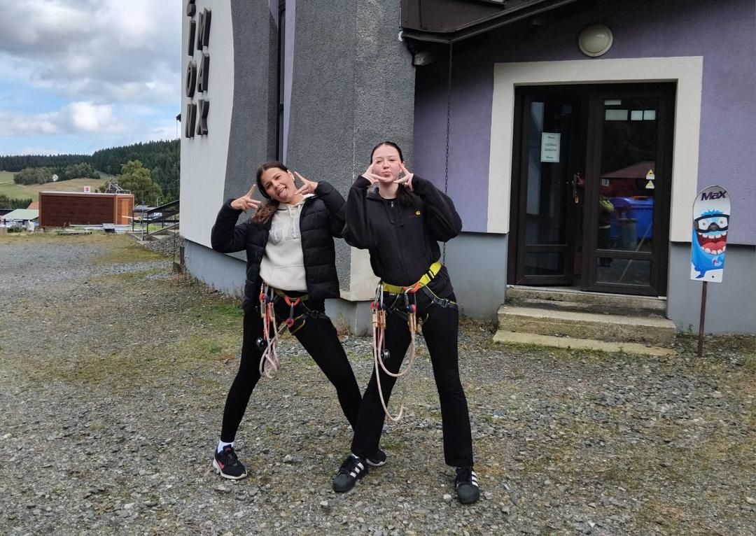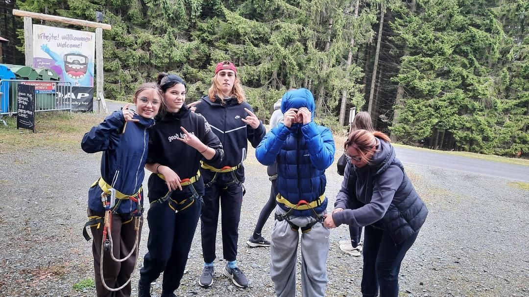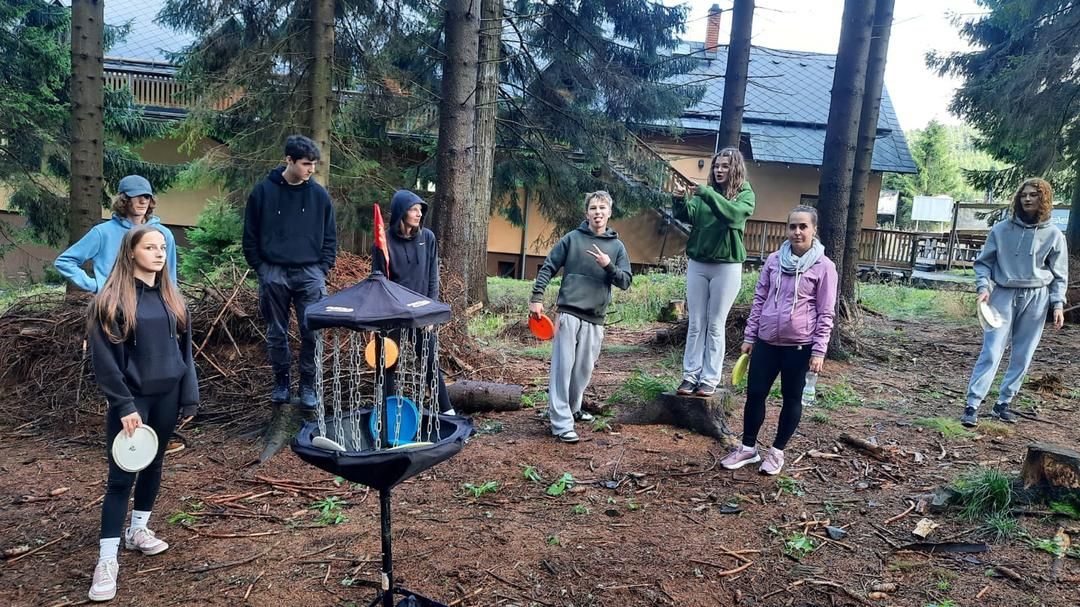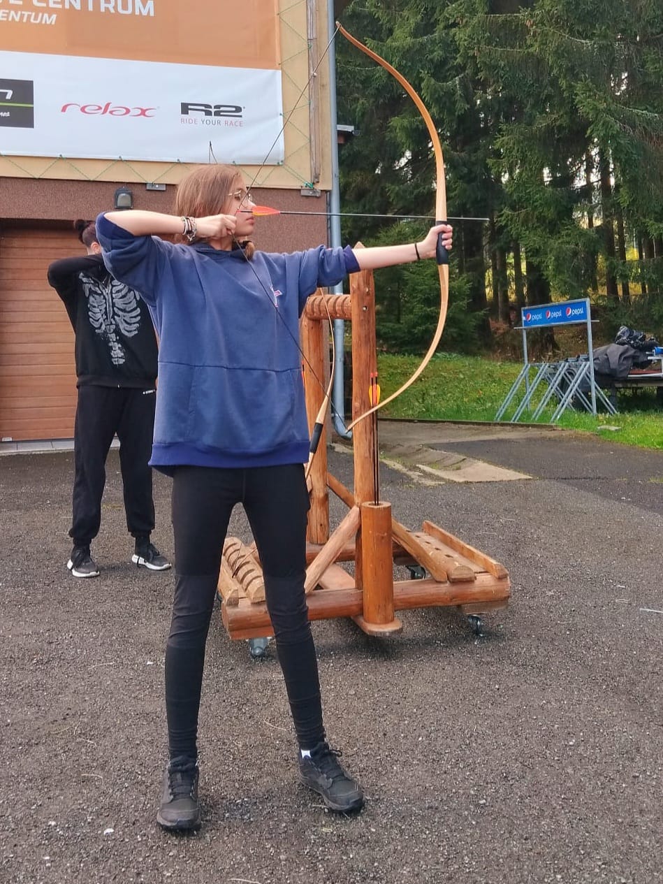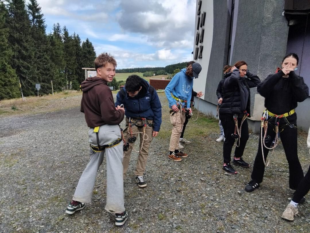 Ve dnech 15. 9.-17. 9. se třída 5. O zúčastnila adaptačního pobytu na Klínovci. Cílem bylo propojit stávající studenty s nově příchozími a poznat se navzájem v zápalu sportovních dobrodružství. První den dopoledne nás déšť zavřel v budově , ale využili jsme tenhle čas k hrám a třídním aktivitám. Odpoledne jsme si vyzkoušeli lukostřelbu, kde některé slečny předvedly talent hodný Amazonek, a v lese jsme si zahráli discgolf, který nás nadchl a skvěle pobavil. K večeru jsme si zašli koupit nějaké dobroty do Loučné pod Klínovcem a den jsme pak zakončili třídními hrami. Druhý den jsme si pořádně mákli na koloběžkách a lanovém centru, všichni do toho šli naplno, někteří dokonce překonávali svoje hranice. Většina si pak ještě užila řádění na trampolínách… Na podvečer dostali studenti speciální úkol – po večeři pobavit paní učitelky… Celá třída se úkolu zhostila na jedničku a nachystala neuvěřitelně zábavnou „genderově obrácenou“ módní přehlídku, zakončenou super skvělým pěveckým výkonem… Na závěr jsme si společně upletli síť podpory a shodli jsme se na tom, že jsme si adaptační pobyt všichni moc užili a cíl se nám podařilo na dvě stě procent naplnit…