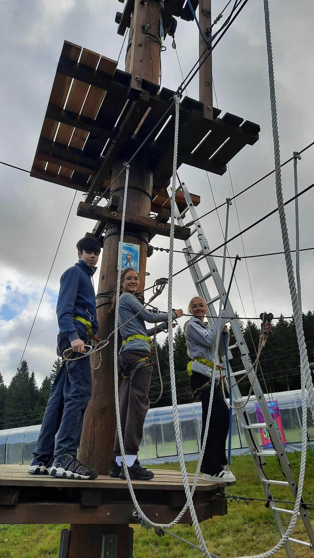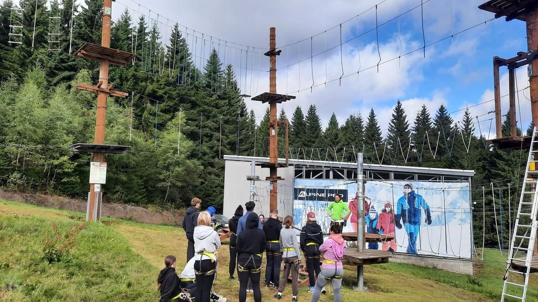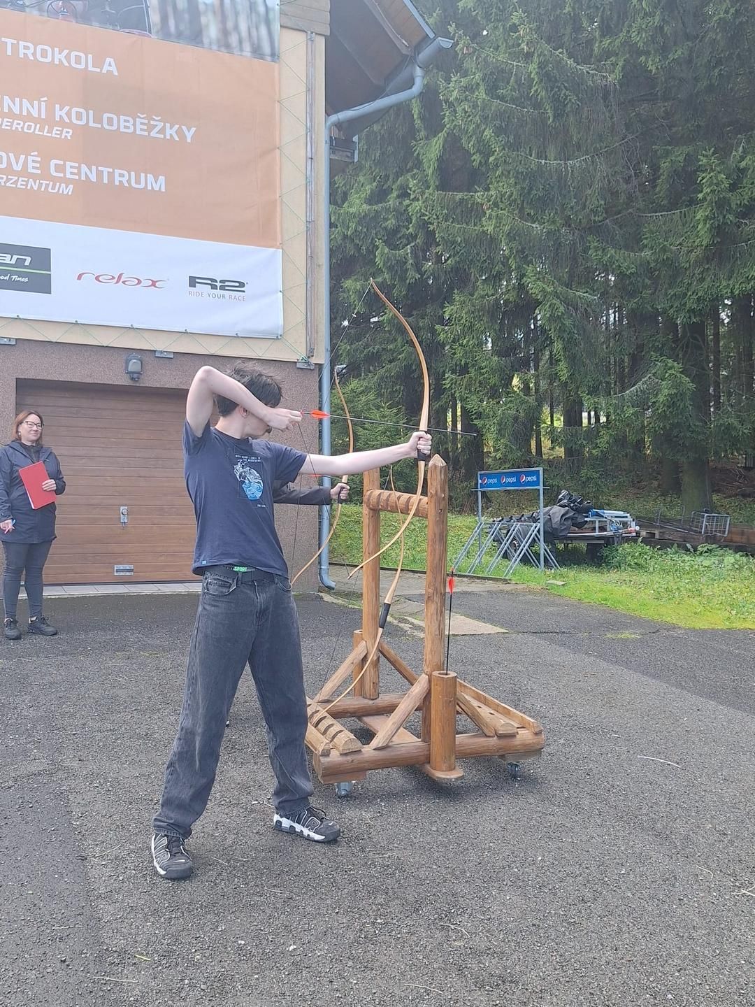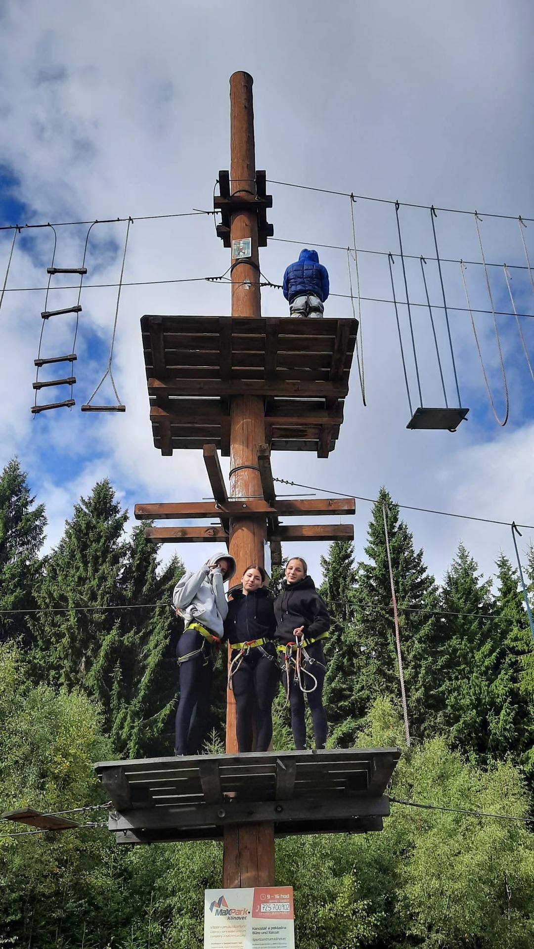 Ve dnech 15. 9.-17. 9. se třída 5. O zúčastnila adaptačního pobytu na Klínovci. Cílem bylo propojit stávající studenty s nově příchozími a poznat se navzájem v zápalu sportovních dobrodružství. První den dopoledne nás déšť zavřel v budově , ale využili jsme tenhle čas k hrám a třídním aktivitám. Odpoledne jsme si vyzkoušeli lukostřelbu, kde některé slečny předvedly talent hodný Amazonek, a v lese jsme si zahráli discgolf, který nás nadchl a skvěle pobavil. K večeru jsme si zašli koupit nějaké dobroty do Loučné pod Klínovcem a den jsme pak zakončili třídními hrami. Druhý den jsme si pořádně mákli na koloběžkách a lanovém centru, všichni do toho šli naplno, někteří dokonce překonávali svoje hranice. Většina si pak ještě užila řádění na trampolínách… Na podvečer dostali studenti speciální úkol – po večeři pobavit paní učitelky… Celá třída se úkolu zhostila na jedničku a nachystala neuvěřitelně zábavnou „genderově obrácenou“ módní přehlídku, zakončenou super skvělým pěveckým výkonem… Na závěr jsme si společně upletli síť podpory a shodli jsme se na tom, že jsme si adaptační pobyt všichni moc užili a cíl se nám podařilo na dvě stě procent naplnit…