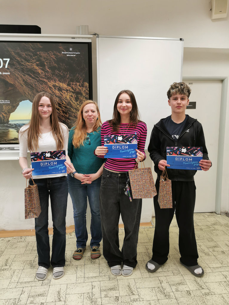 Ve středu 25.2. proběhla olympiáda ve francouzském jazyce, kterého se zúčastnila 4.O. Soutěž proběhla formou písemného testu, kde si studenti poprvé vyzkoušeli formu takového zkoušení. Studenti a studentky 4.O. studují jazyk teprve druhým rokem s časovou dotací 3 hodin týdně. Vzhledem k tomu, že je francouzský jazyk náročný jak nejen pro svou výslovnost, ale i gramatiku byli nakonec moc šikovní. První místo obsadil Roman Vilchynskyi, kterého jeho spolužáci chtěli nominovat na první místo i bez testování. Na druhém místě se umístila Klárka Jursíková a na třetím Kamila Vašíčková, které jsou také velmi šikovné. Děkuji všem zúčastněným a vydržte u studia francouzštiny, je to těžký jazyk, ale krásný!!!