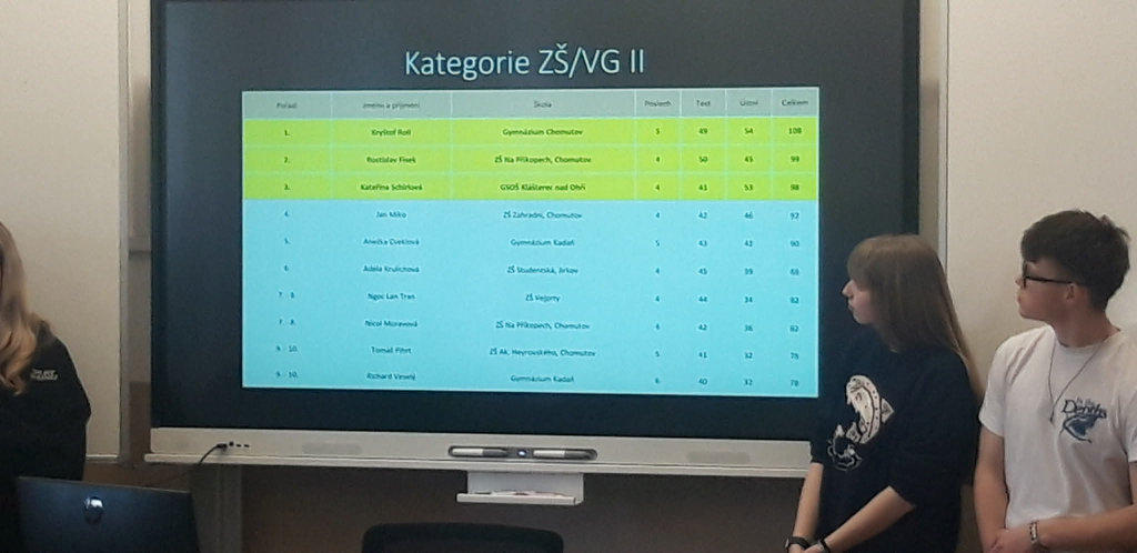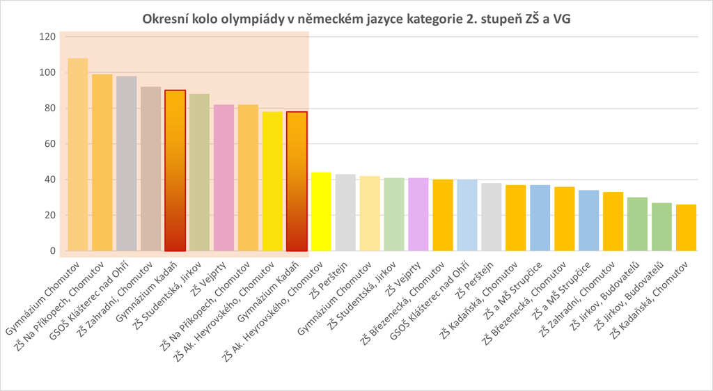 Jak ukazují přiložená data, Gymnázium Kadaň se stalo jednou z mála škol v okrese, které dokázaly do první desítky žebříčku prosadit hned dva své zástupce. Díky jejich vyrovnaným a kvalitním výkonům se naše gymnázium stalo nejúspěšnějším gymnáziem v okrese v této kategorii a v celkovém součtu bodů všech škol obsadilo fantastické 2. místo po Základní škole Na Příkopech v Chomutově. Tento vyrovnaný úspěch svědčí nejen o talentu našich studentů, ale i o kvalitním zázemí pro výuku cizích jazyků na našem gymnáziu.
