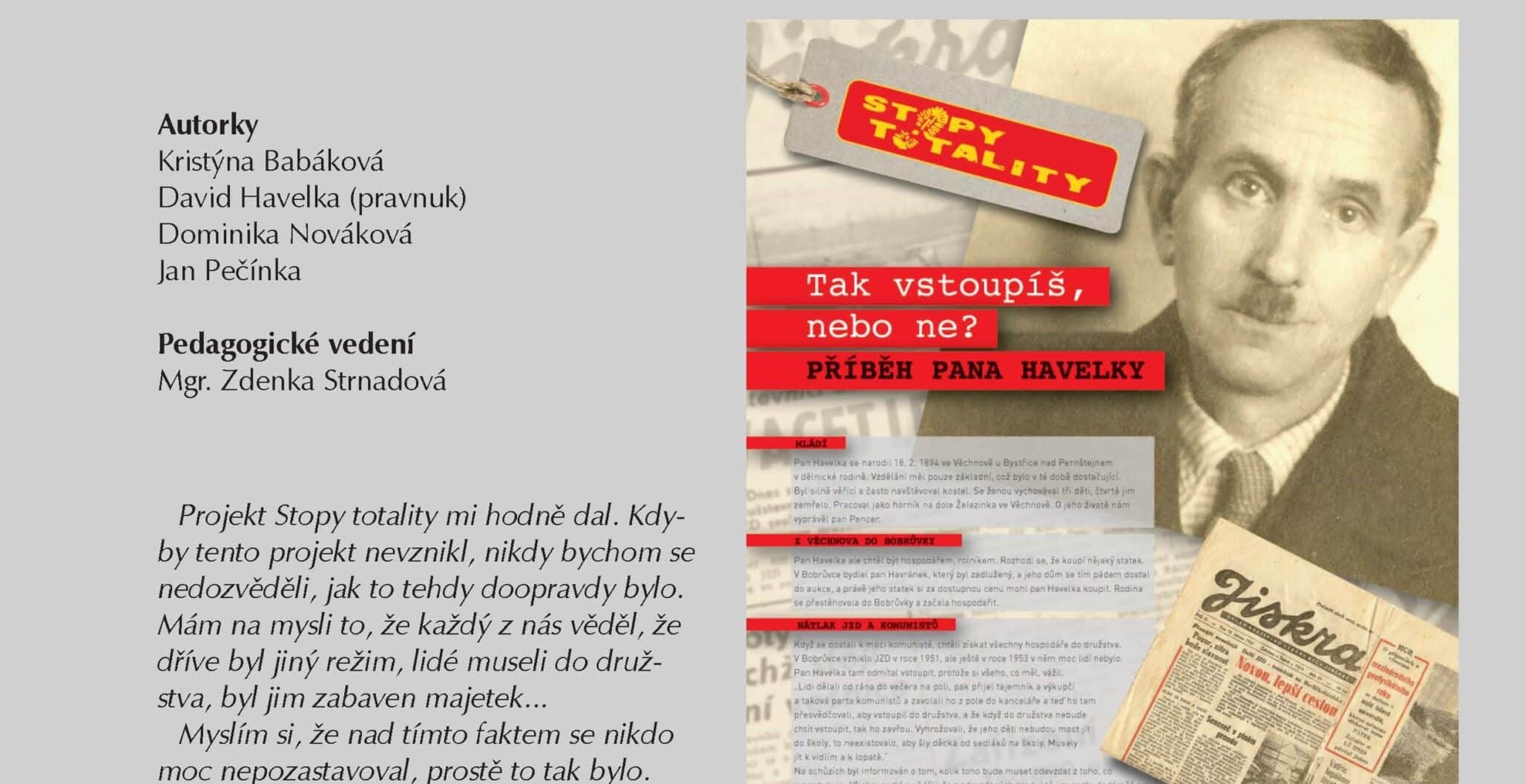 Výstava se týká období 50. let českých dějin, které se snaží žákům a studentům zprostředkovat skrze osudy konkrétních lidí. K výstavě je vypracovaná podrobná metodika a aktivity pro žáky. Podporuje i schopnost porozumění textu. Více informací se dozvíte v přiloženém letáčku. "Cílem projektu Stopy totality je vyzvat žáky a studenty ve věku 12 až 19...