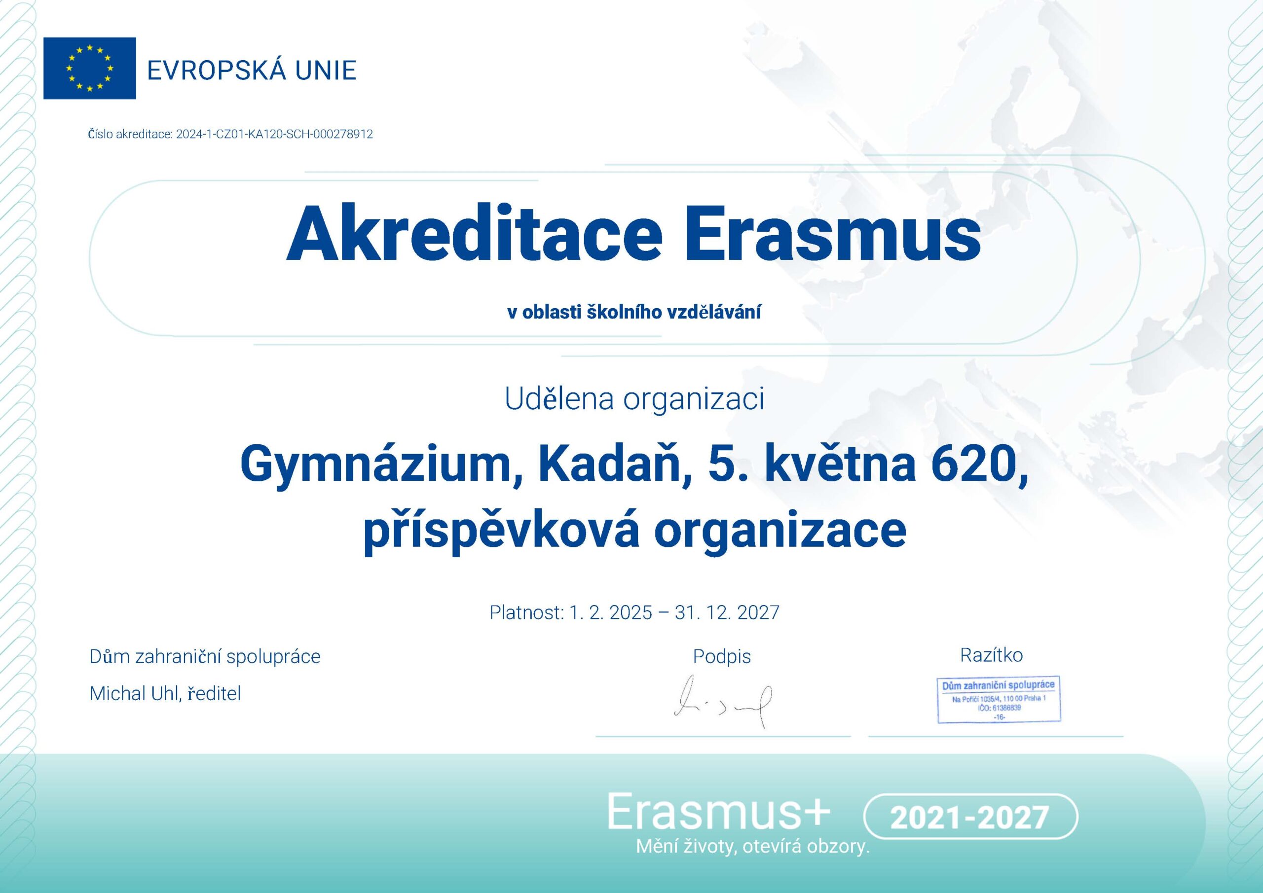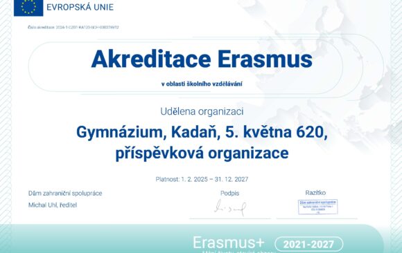 Národní agentura tímto akreditované organizaci uděluje akreditaci Erasmus č. 2024-1-CZ01-KA120-SCH-000278912 v oblasti školního vzdělávání. Udělením akreditace Erasmus se potvrzuje, že akreditovaná organizace sestavila Plán Erasmus pro realizaci vysoce kvalitních mobilit v rámci širšího úsilí o rozvoj své organizace a má dostatečnou provozní a odbornou kapacitu pro jeho realizaci.
